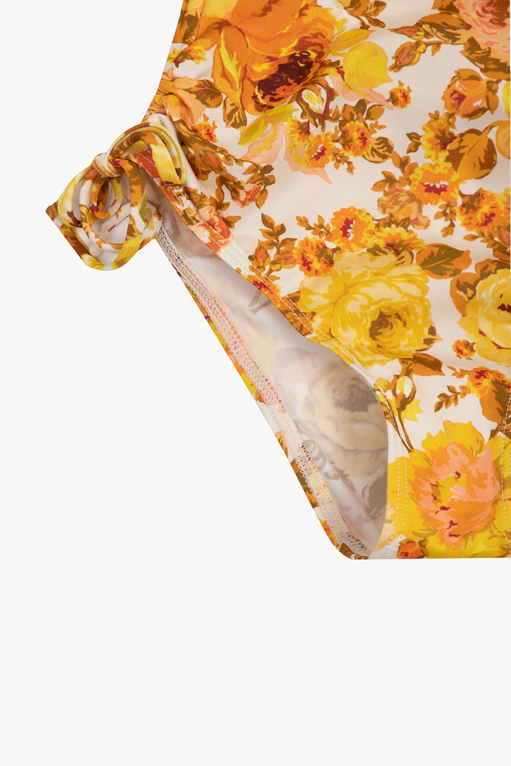 Żółto-pomarańczowy jednoczęściowy kostium kąpielowy Zimmermann Kids. Z przodu krótkie zapięcie na zamek. Ozdobiony wzorem z motywem kwiatowym. Długie rękawy. Dół ściągany trokami.