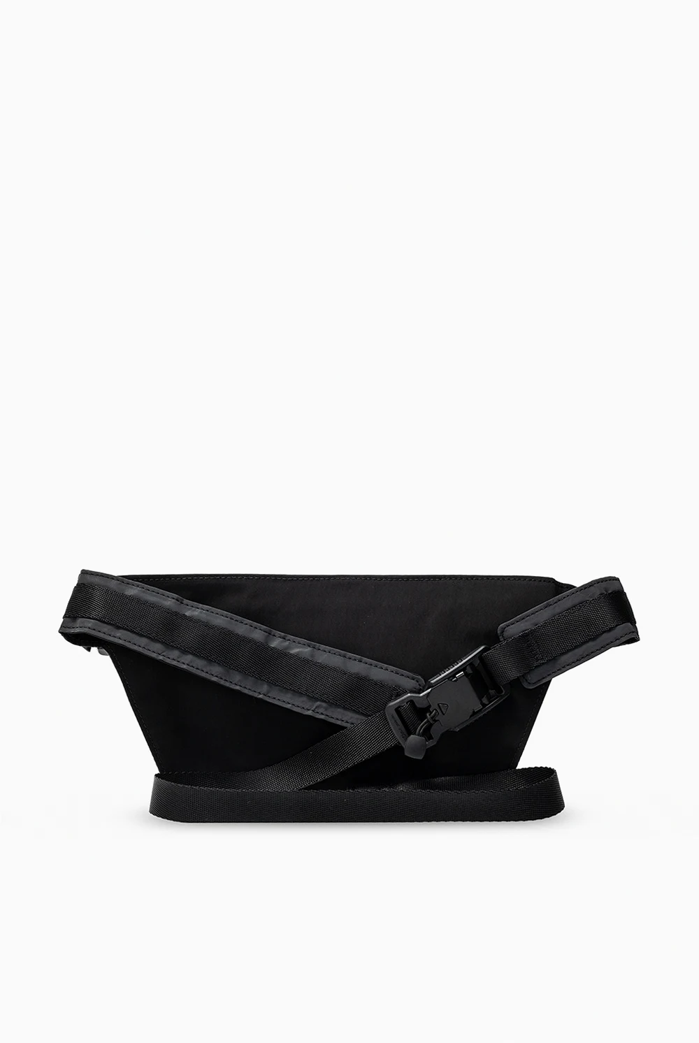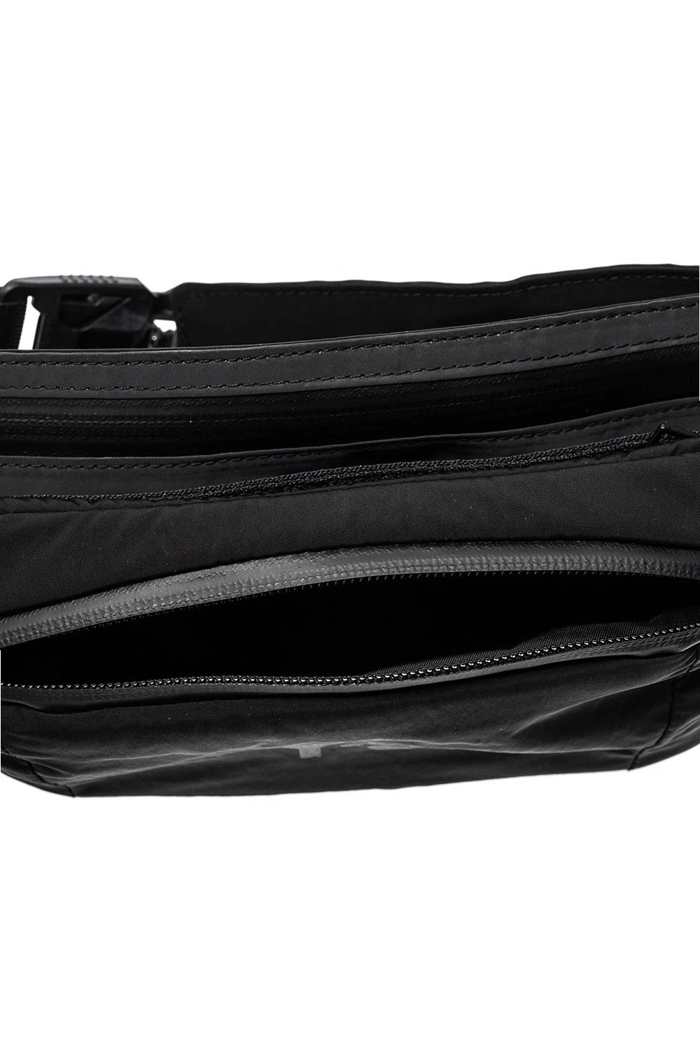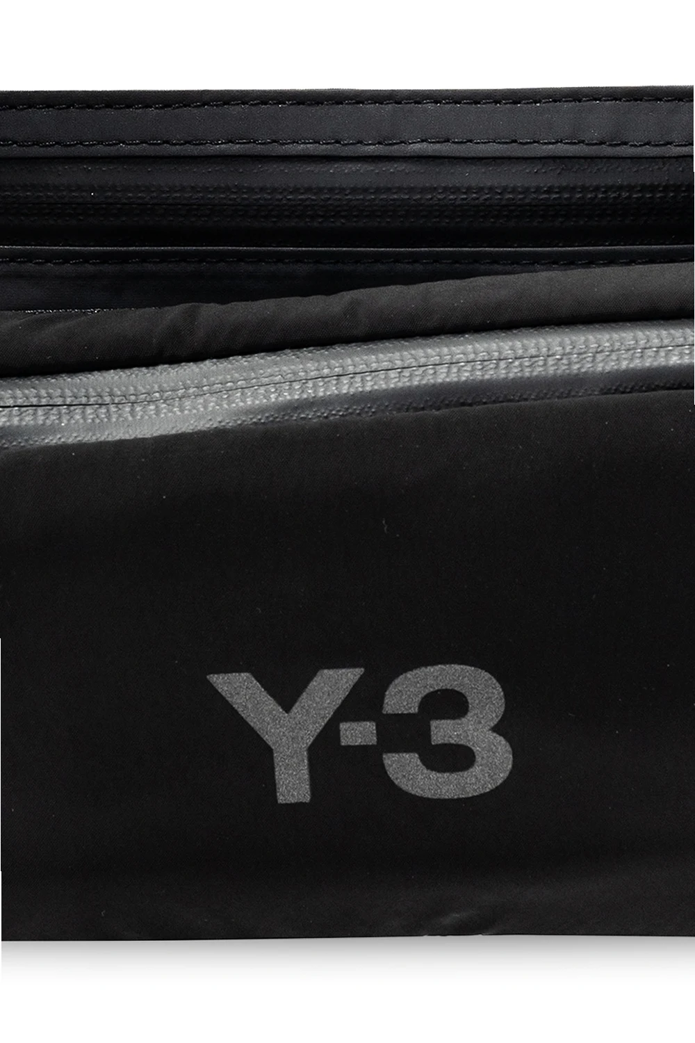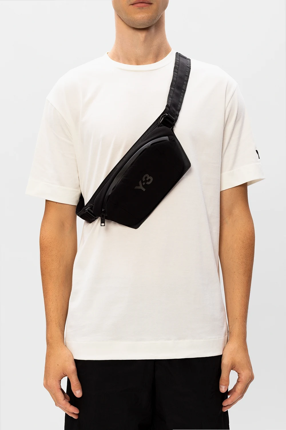 Czarna torba na pas Y-3 Yohji Yamamoto. Zapinana na zamek. Ozdobiona nadrukowanym logo w kolorze szarym. Z tyłu kieszeń zamykana na zamek. Wewnątrz komora. Pas z możliwością regulacji długości. Dołączona komora zamykana na zamek.