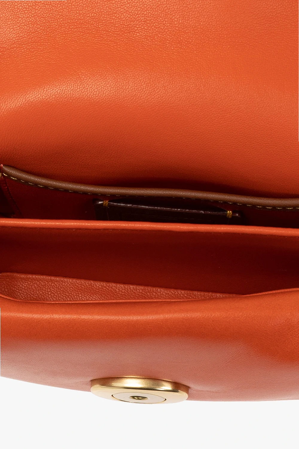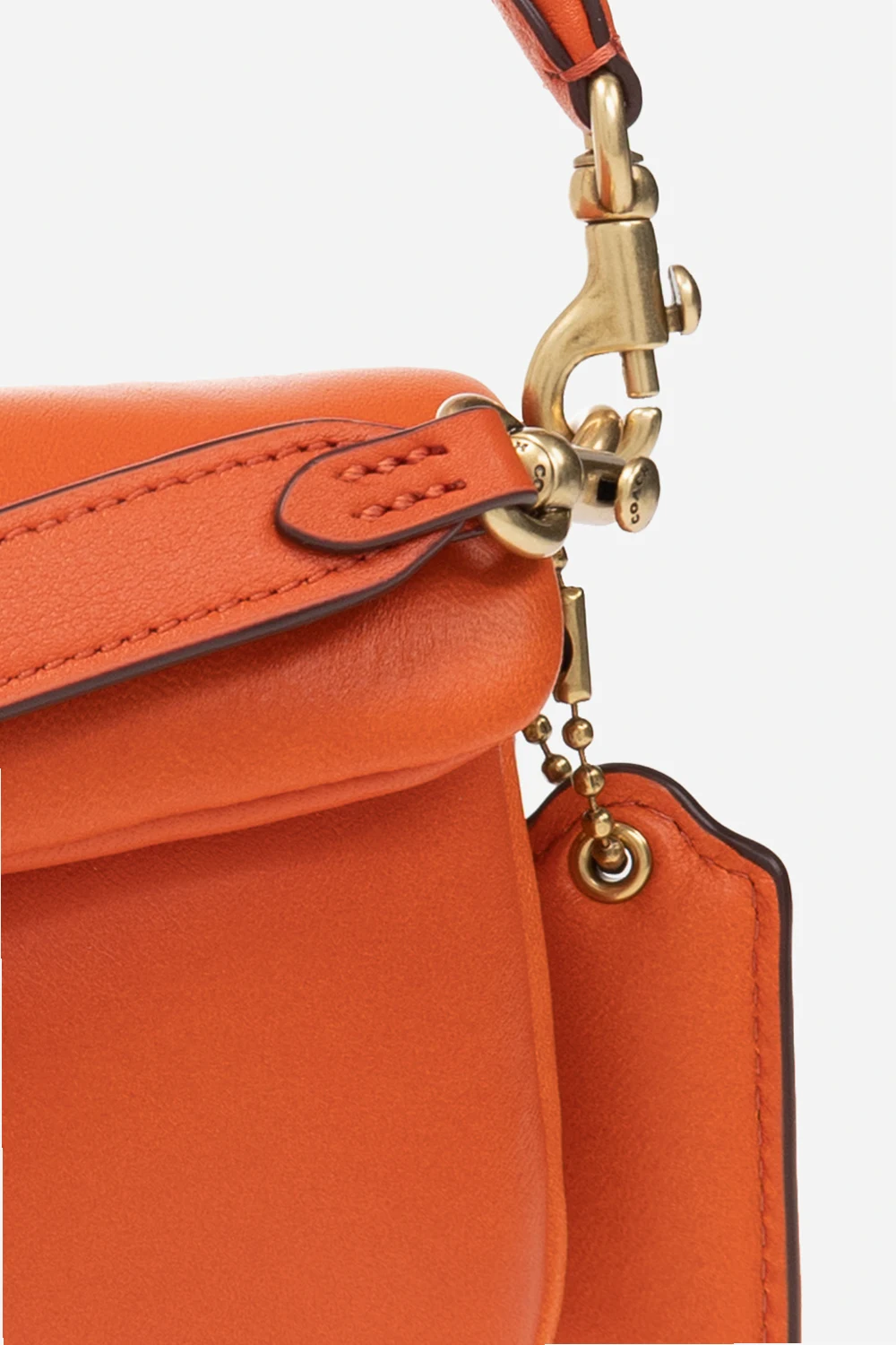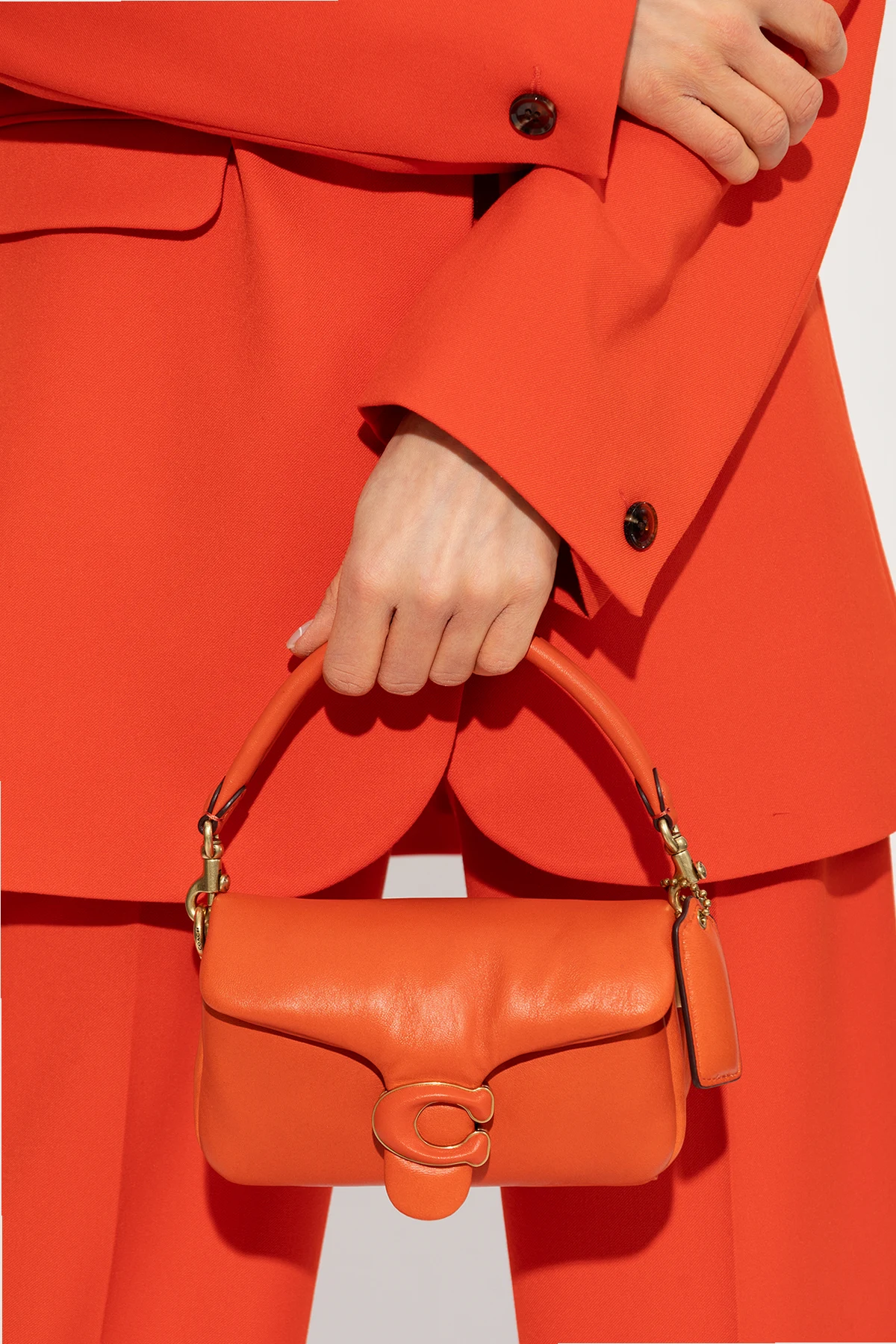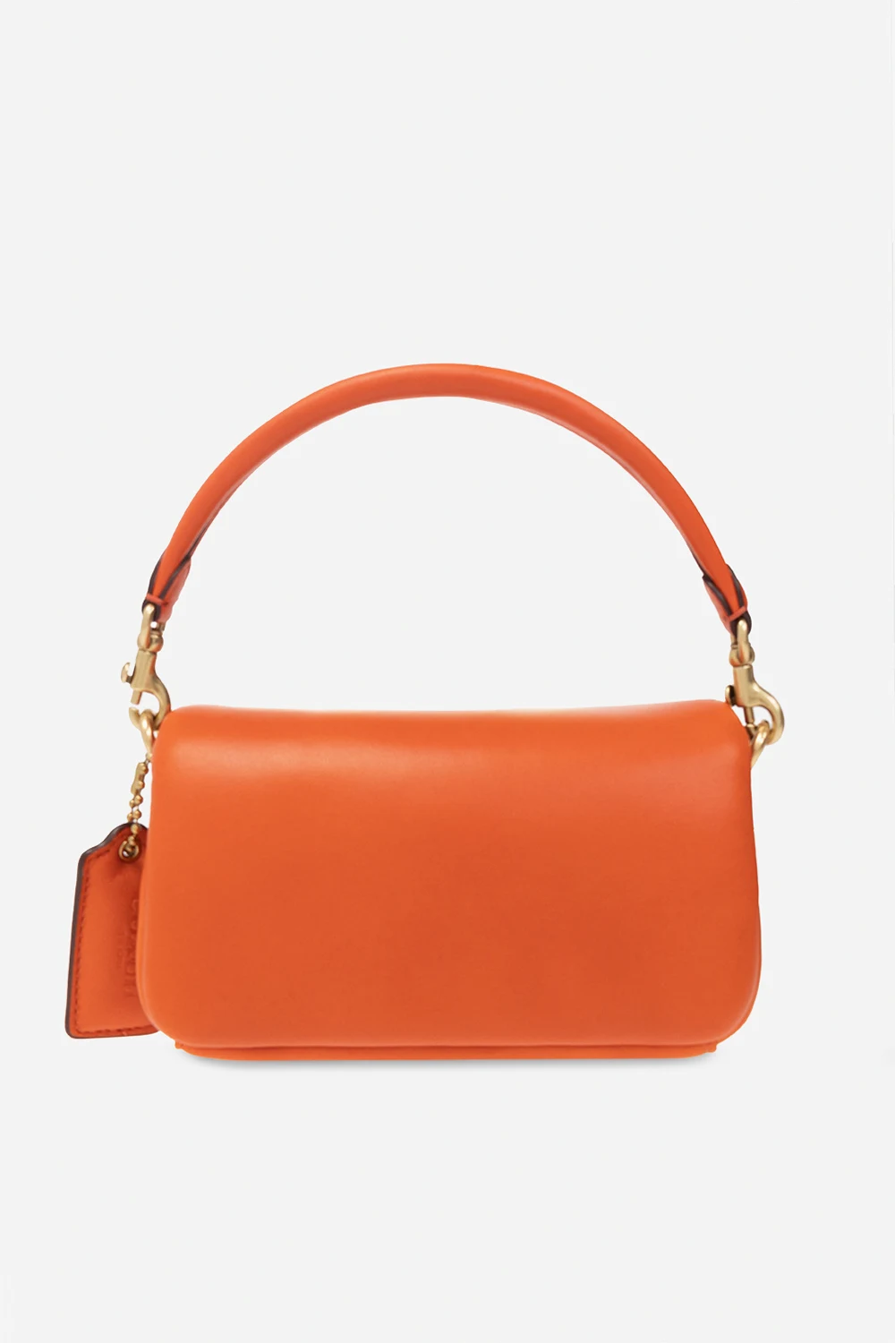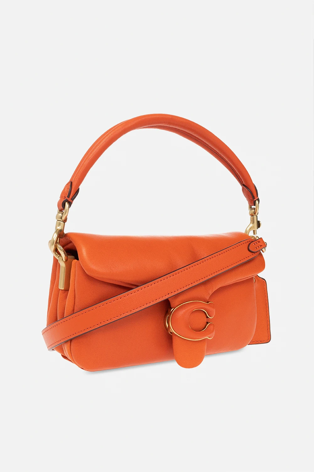 Pomarańczowa torba na ramię, model 'Pillow Tabby 18' Coach. Wykonana ze skóry. Zamykana na magnetyczny zatrzask. Ozdobiona logo. Wewnątrz komora. Metalowe wykończenie w kolorze złotym.