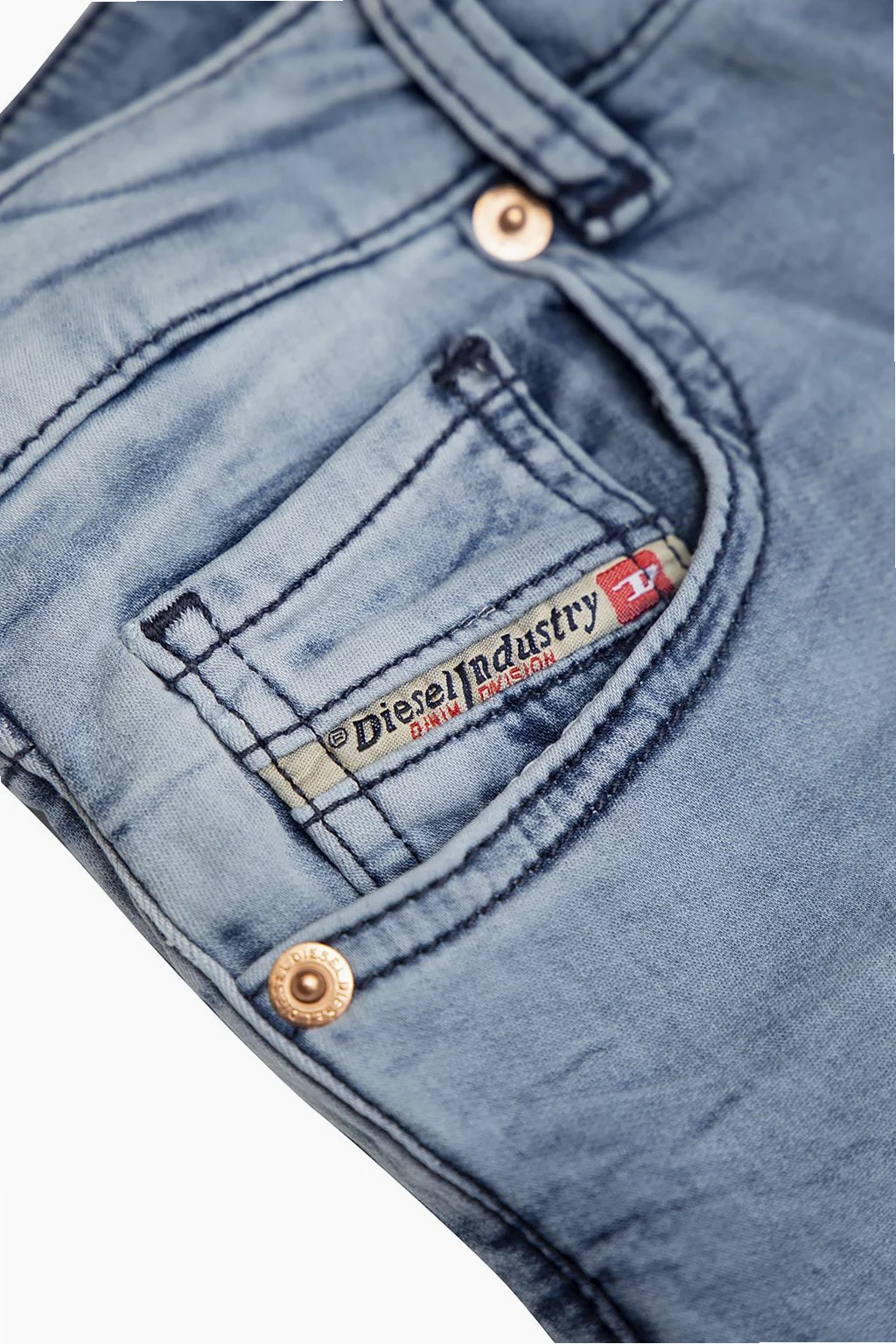Niebieskie jeansy, model ‘Aryel’ Diesel. Wykonane z opatentowanego przez markę materiału 'JoggJeans'. Zapinane na zamek i guzik. Ozdobione przetarciami. Z przodu i z tyłu dwie wsuwane kieszenie. Zwężane nogawki z surowym wykończeniem.