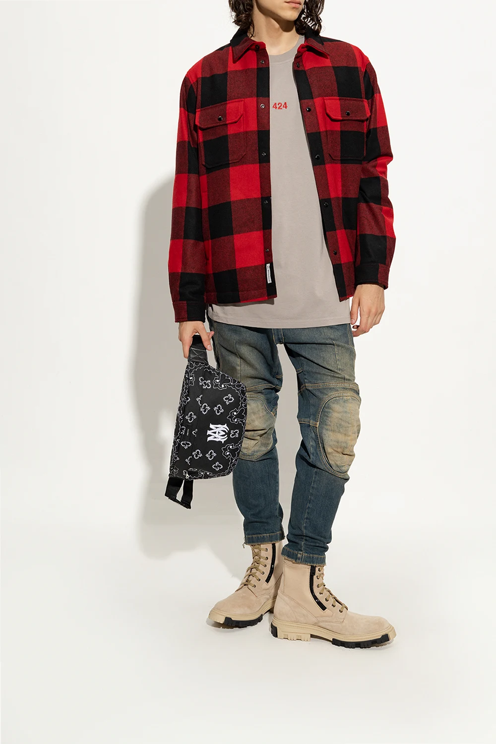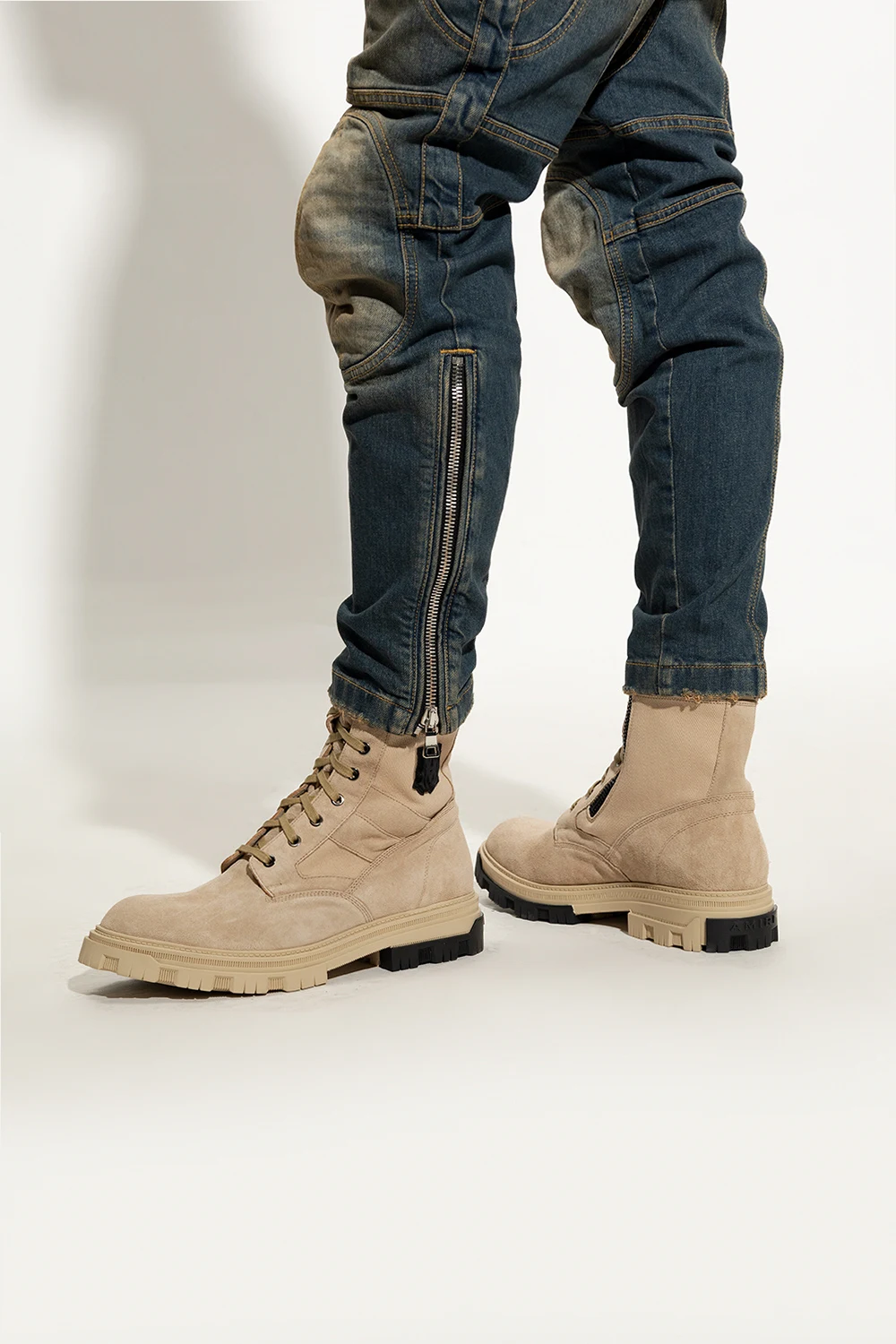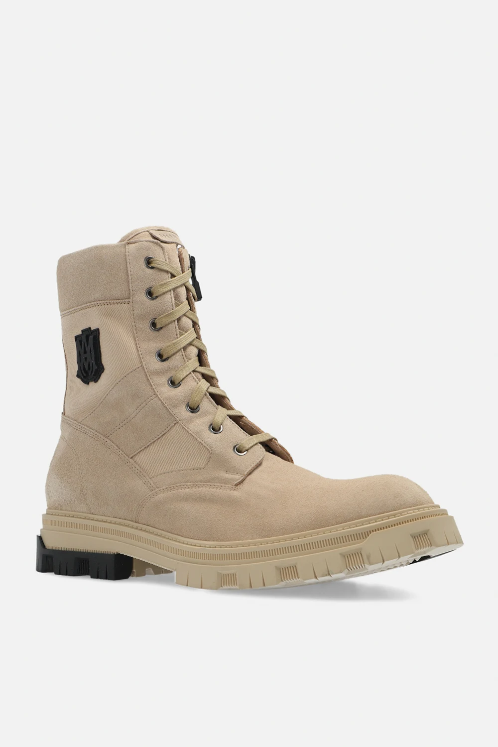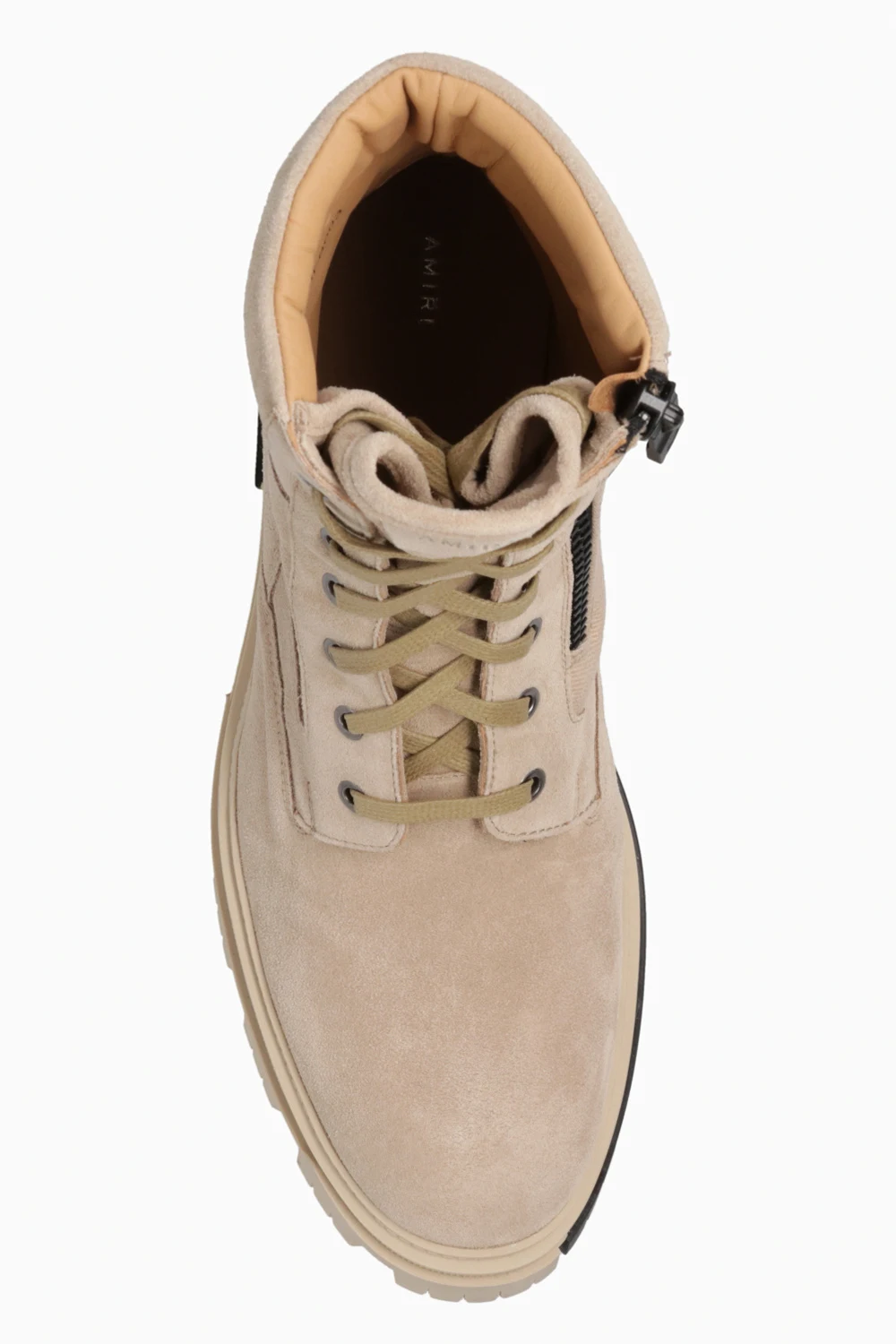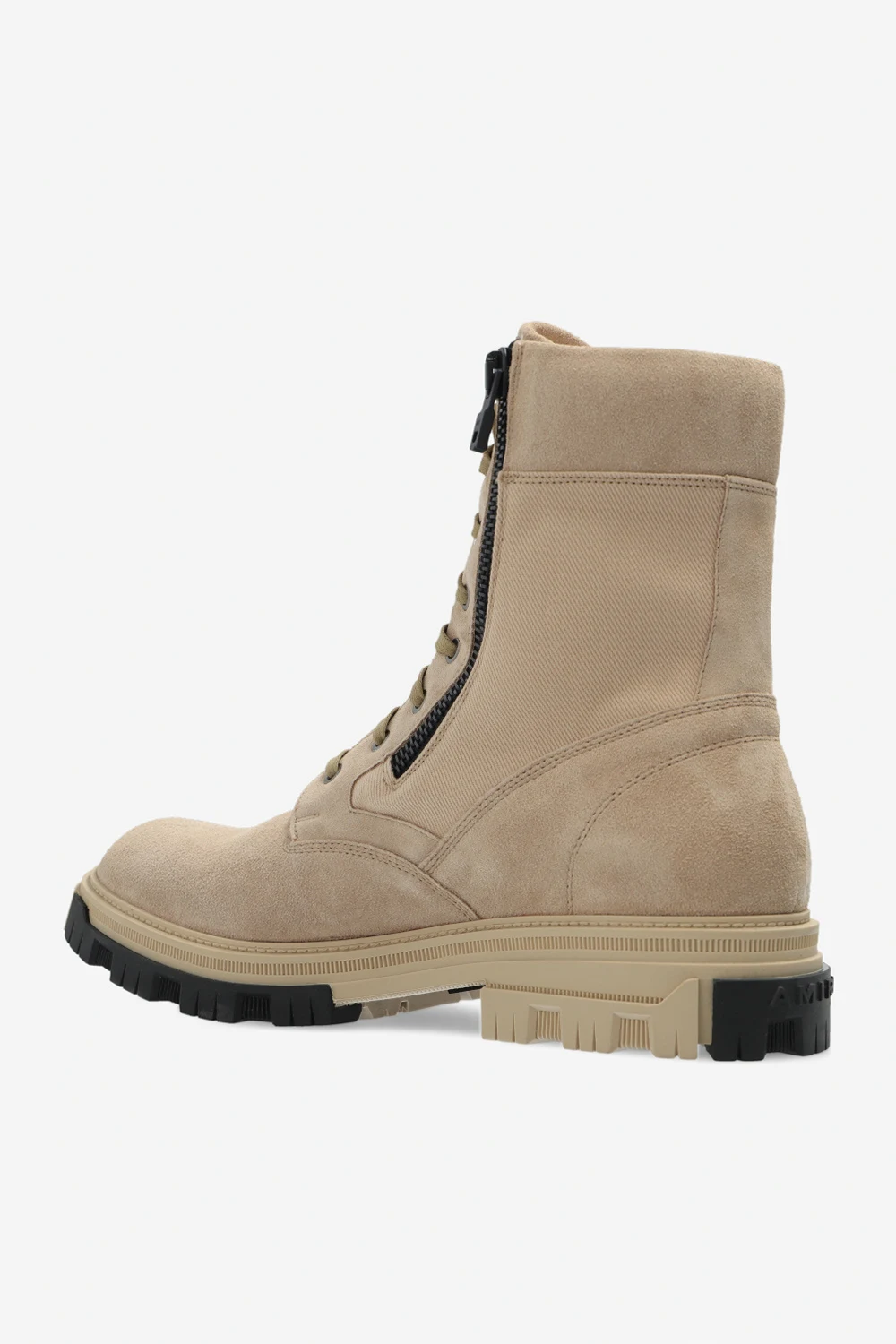 Beżowe, sznurowane buty za kostkę, model ‘Military’ Amiri. Wykonane ze skóry. Zapinane na zamek. Ozdobione naszywką z logo w kolorze czarnym. Migdałowy nosek. Czarno-beżowa, gumowa podeszwa.