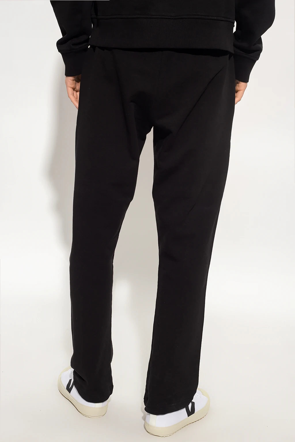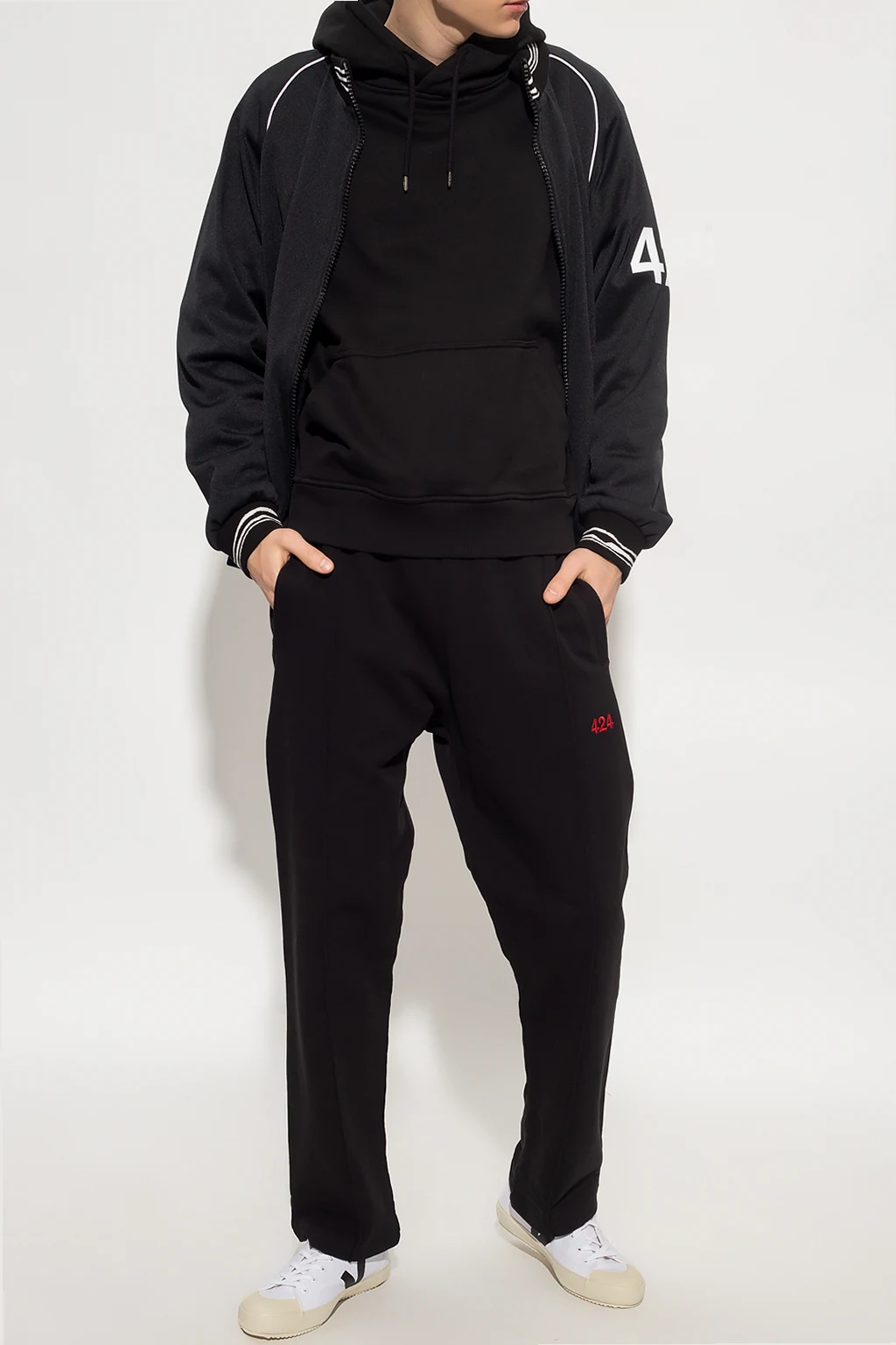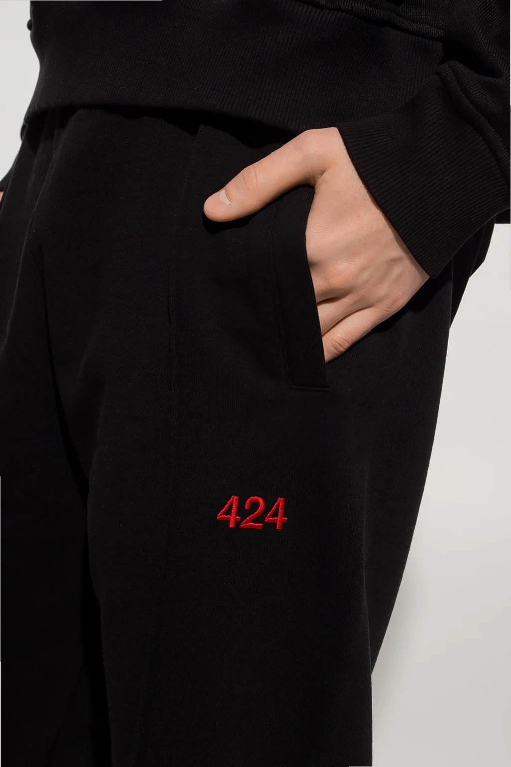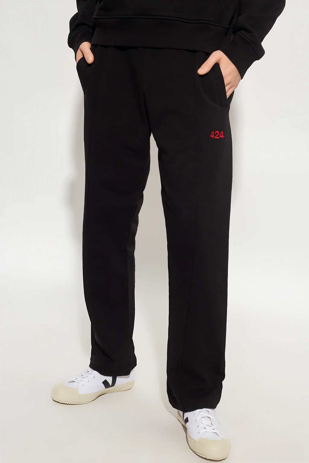 Czarne, bawełniane spodnie dresowe 424. W pasie ściągane trokami. Lekko zwężane nogawki z przeszyciem. Z przodu dwie kieszenie i wyszyte czerwone logo.