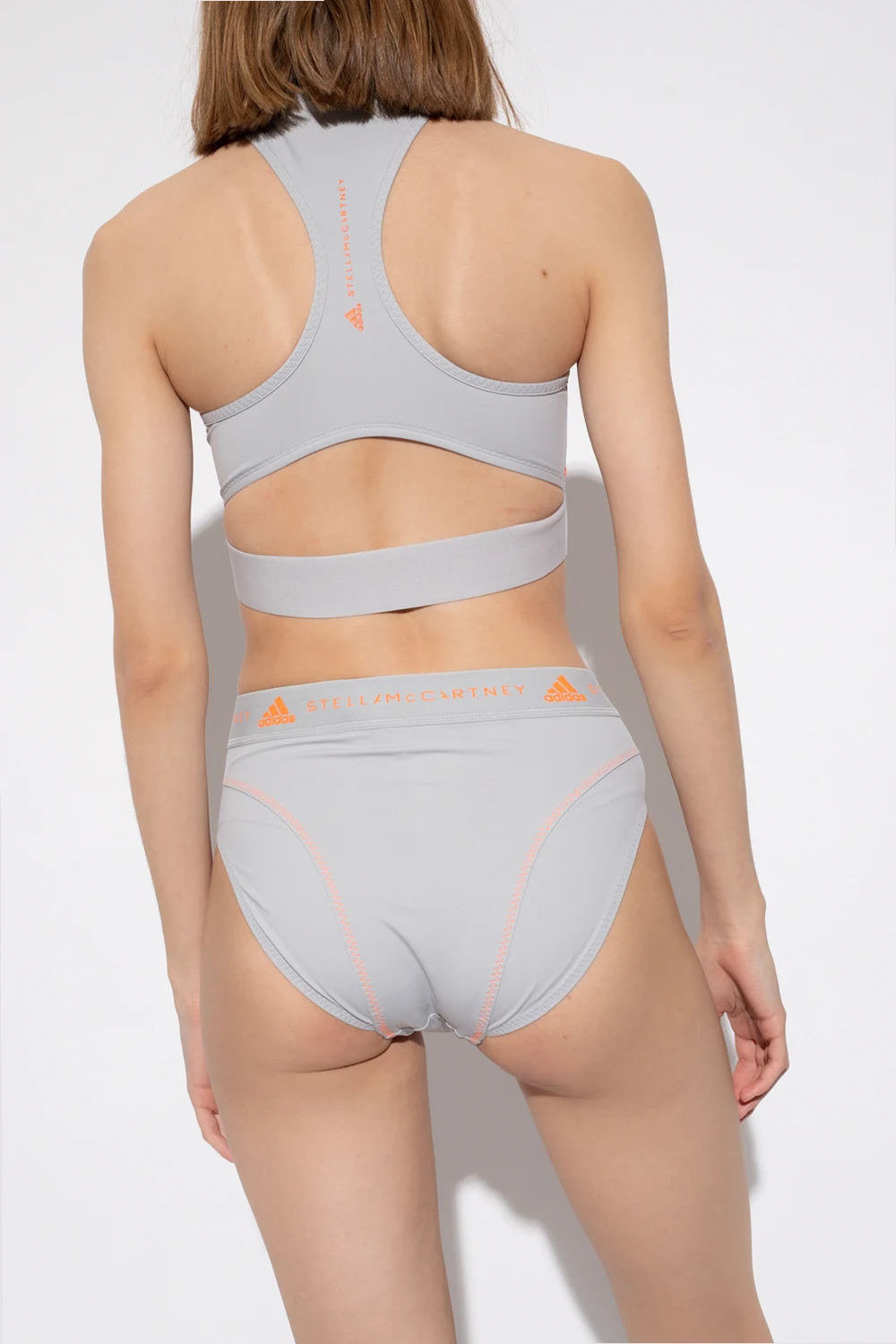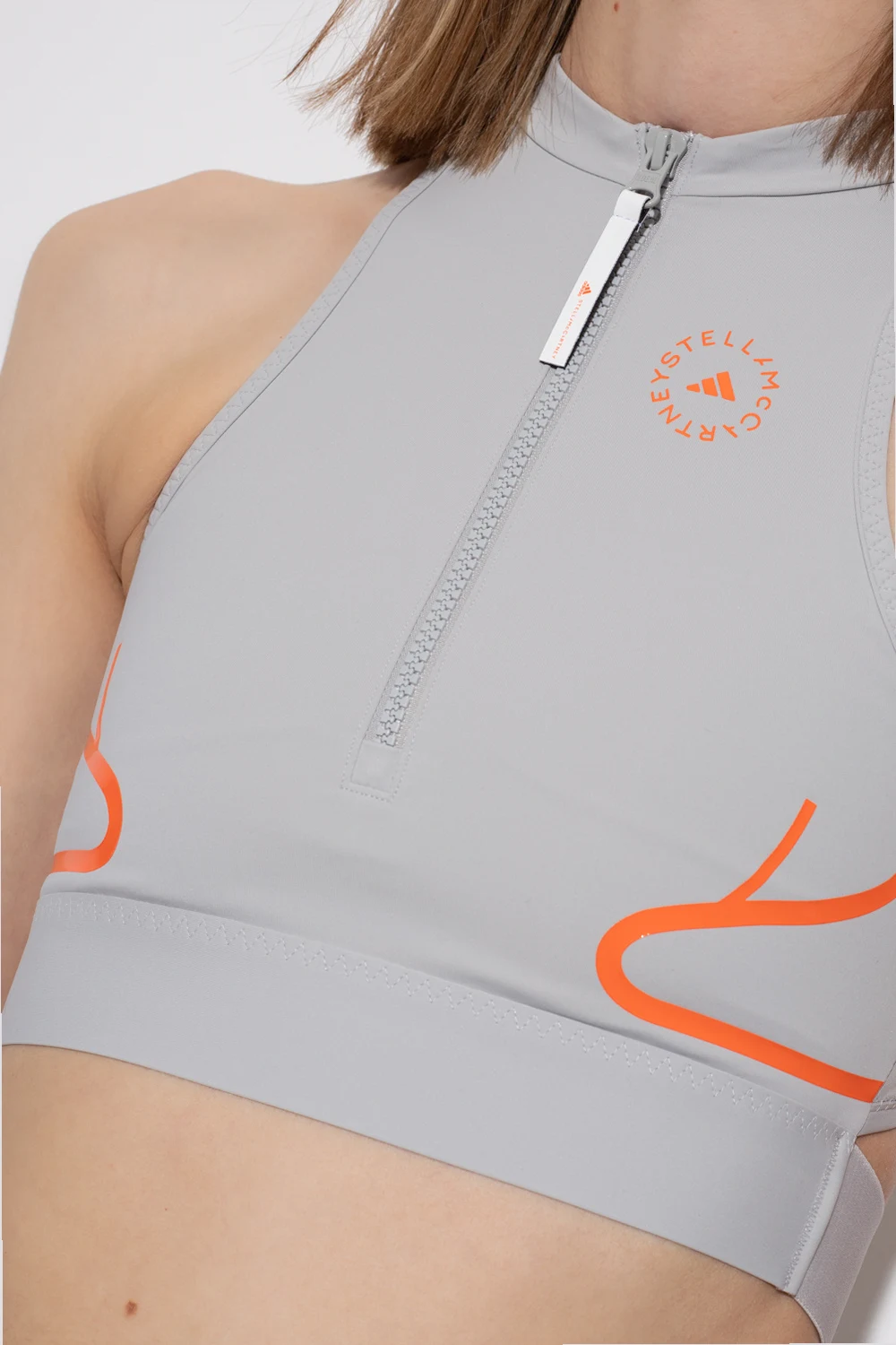 Szaro-pomarańczowa góra od kostiumu kąpielowego ADIDAS by Stella McCartney, linia ‘End Plastic Waste’. Wykonana z materiału pochodzącego z recyklingu. Z przodu zapinana na krótki zamek. Ozdobiona pomarańczowym logo oraz lakierowanym nadrukiem. Z tyłu wycięcie. Dół wykończony elastyczną gumą.