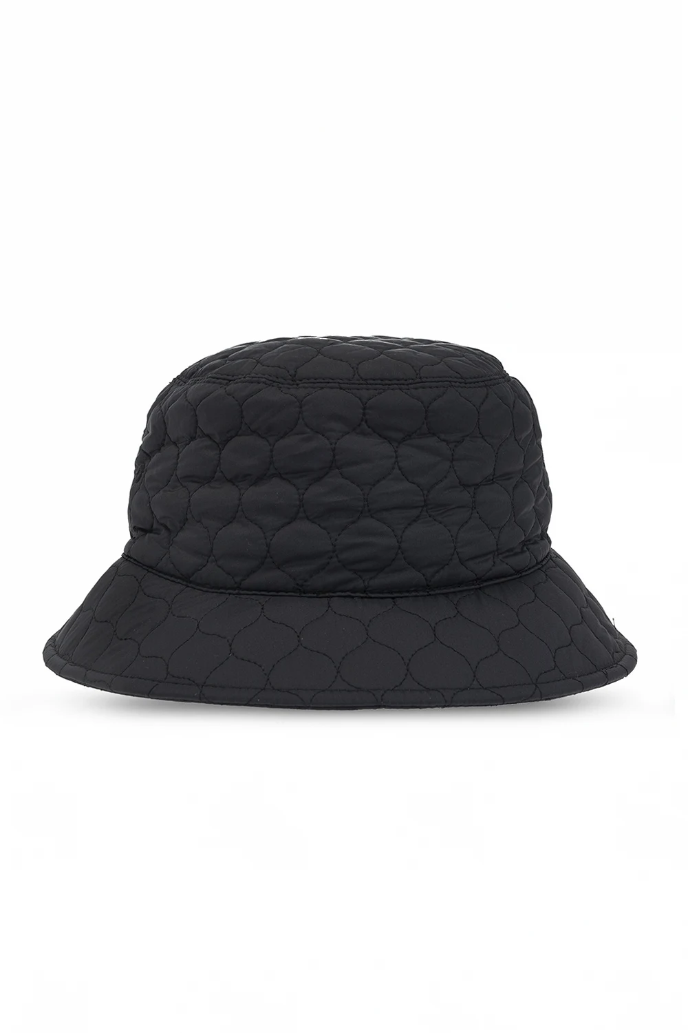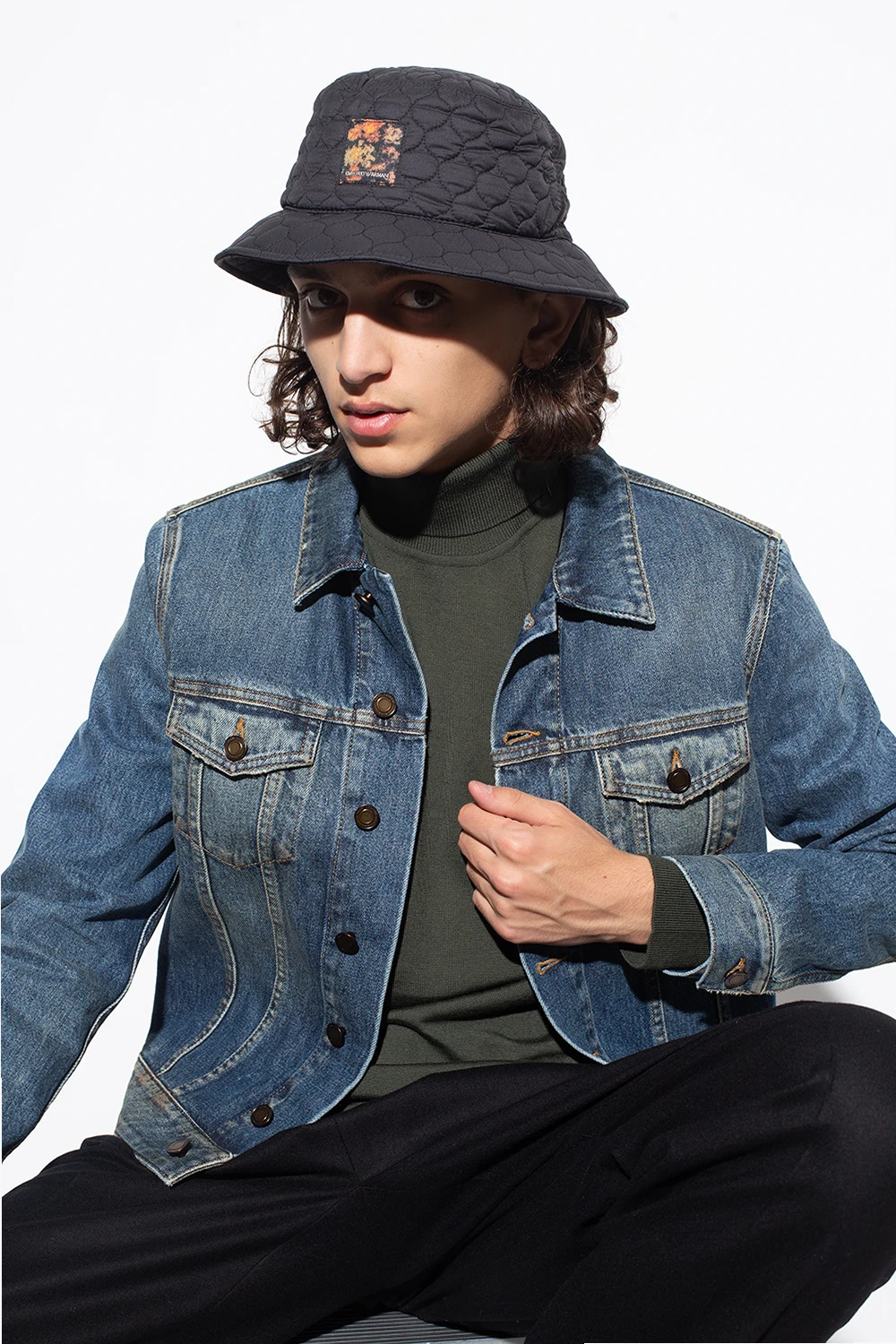 Granatowy, pikowany kapelusz Emporio Armani, kolekcja ‘Sustainable’. Ozdobiony kolorową naszywką z logo.
