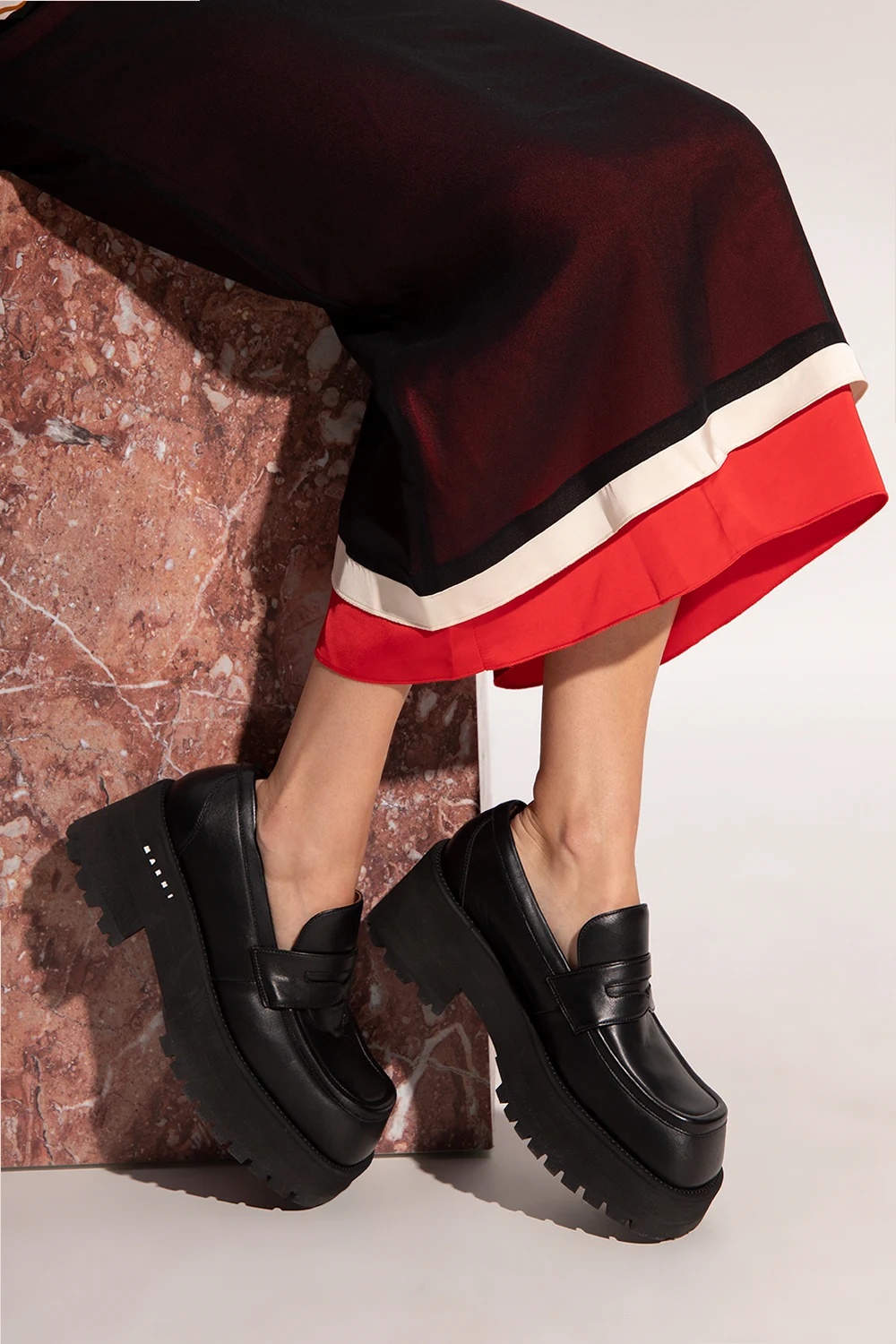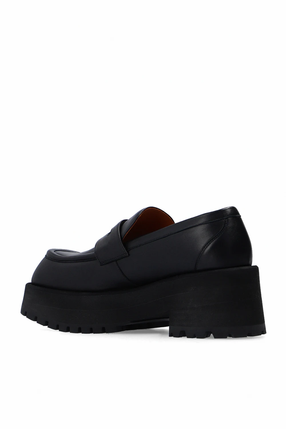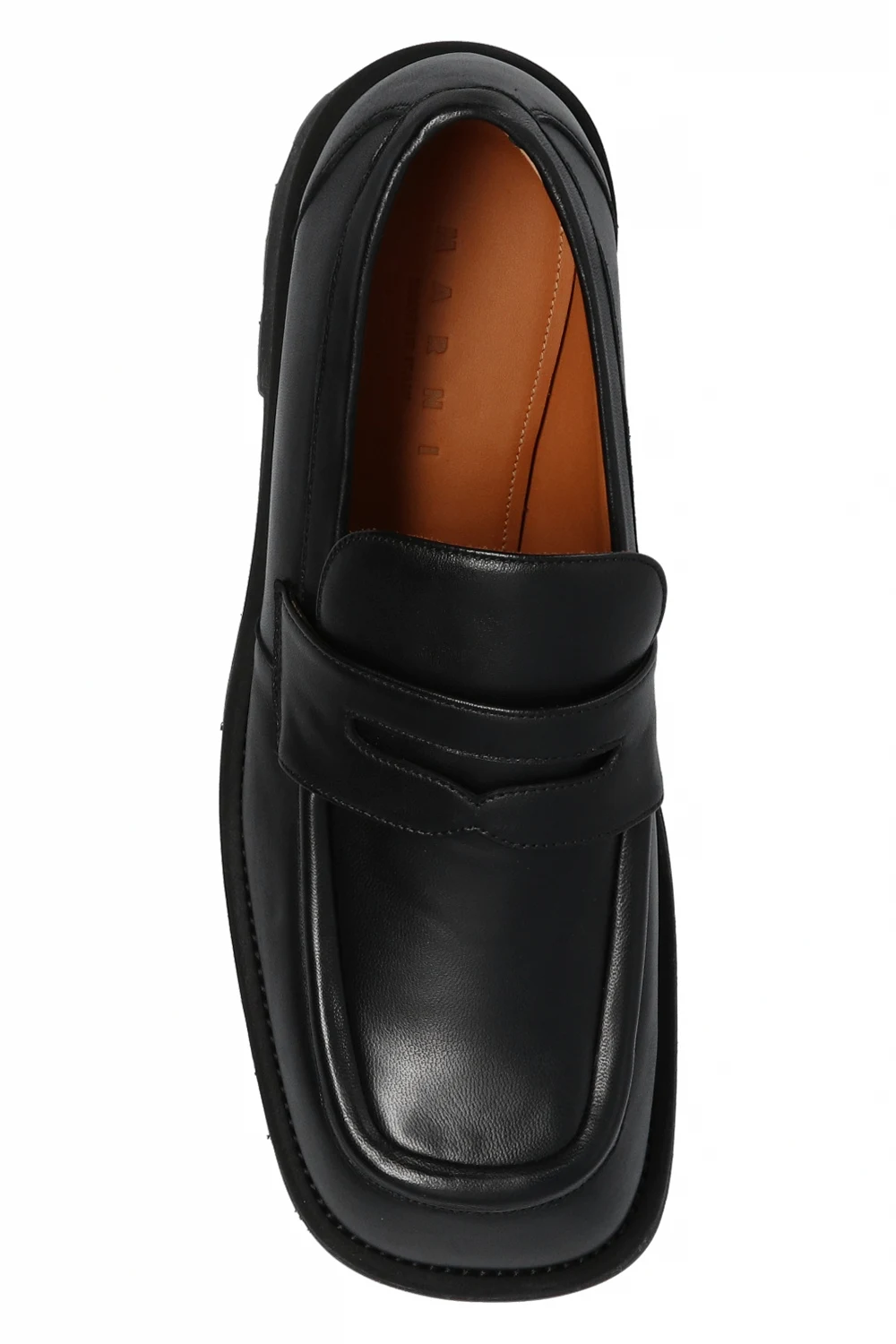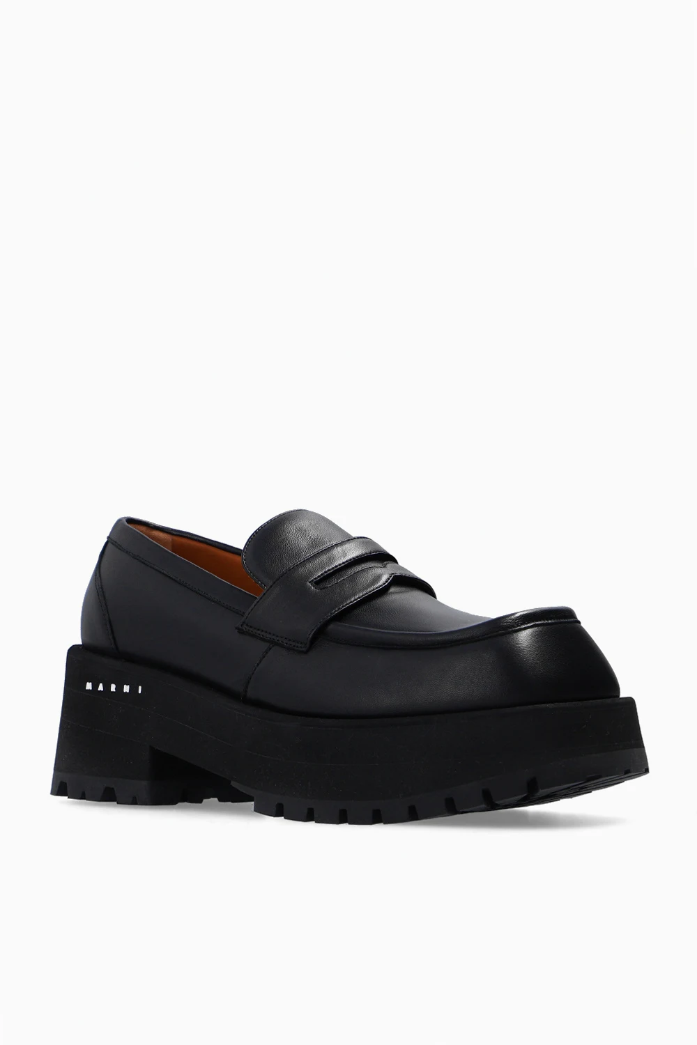 Czarne mokasyny Marni. Wykonane ze skóry jagnięcej. Czarna, gumowa platforma z wytłoczonym logo w kolorze białym.