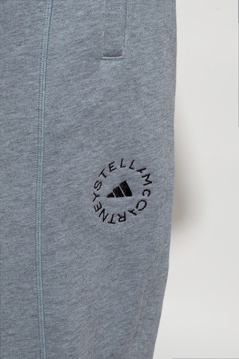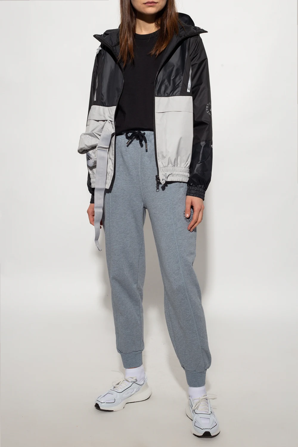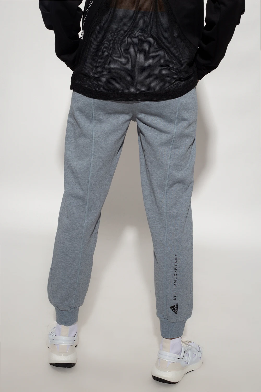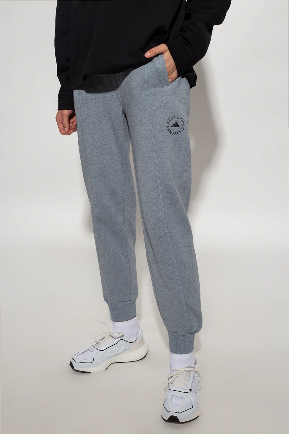 Jasnoszare spodnie dresowe ADIDAS by Stella McCartney. Wykonane z bawełny pochodzącej ze zrównoważonych źródeł. W pasie ściągane trokami. Z przodu oraz z tyłu ozdobione wyszytym logo w kolorze czarnym. Dwie wsuwane kieszenie. Długie nogawki zakończone ściągaczem.