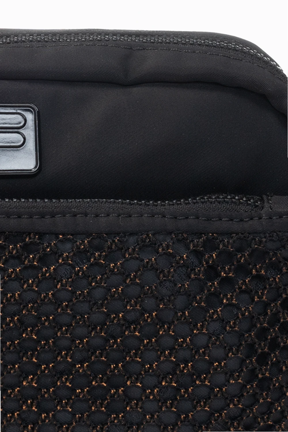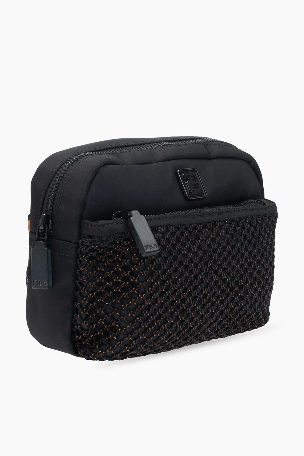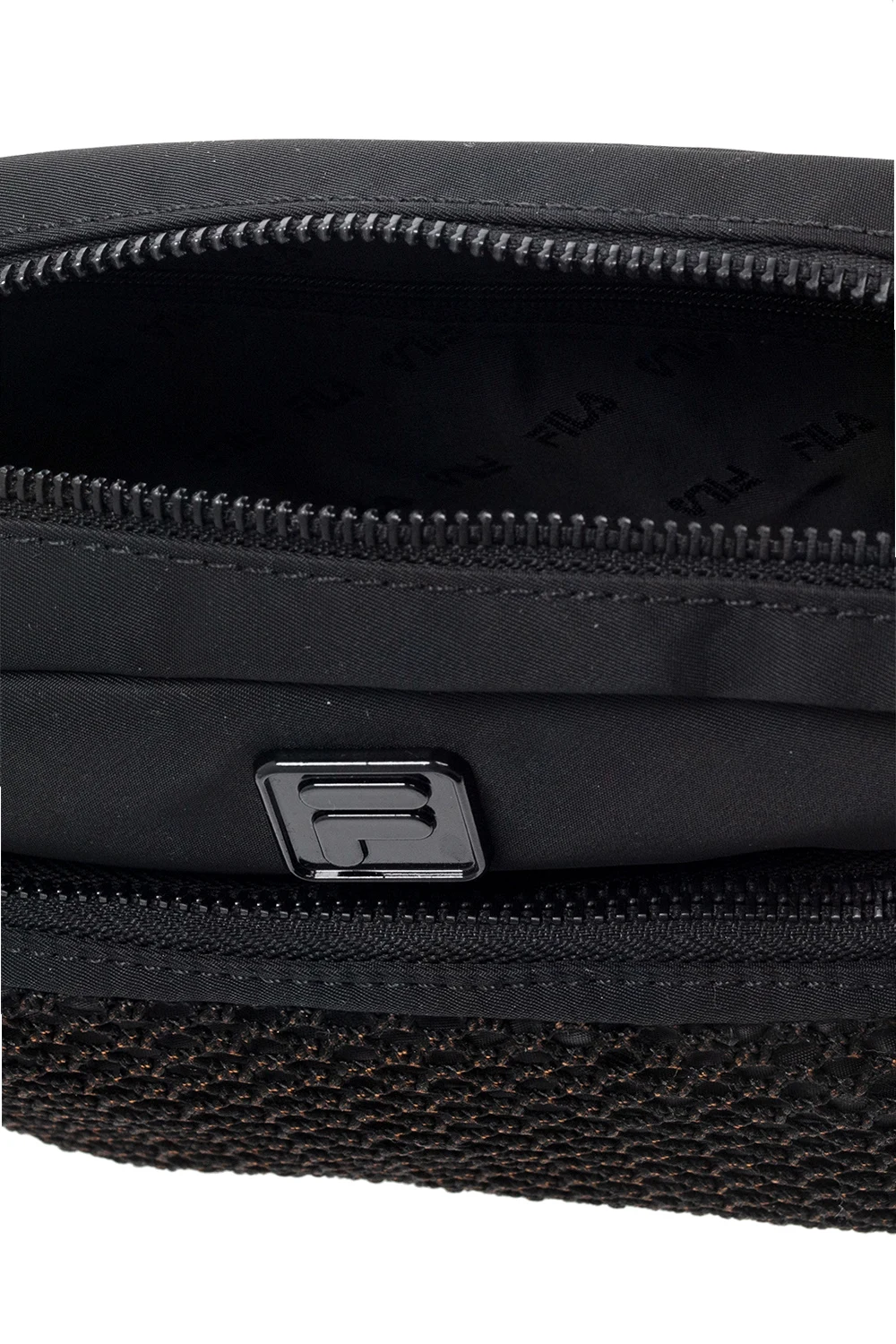 Czarna torba na pas Fila. Wykończona siatką w kolorze czarno-złotym. Zamykana na zamek. Ozdobiona aplikacją z logo. Z przodu kieszeń zamykana na zamek. Regulowany pasek biodrowy. Wewnątrz komora z kieszenią zamykaną na zamek.