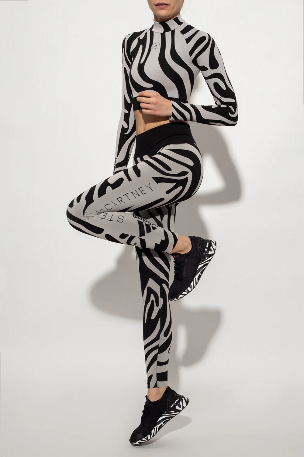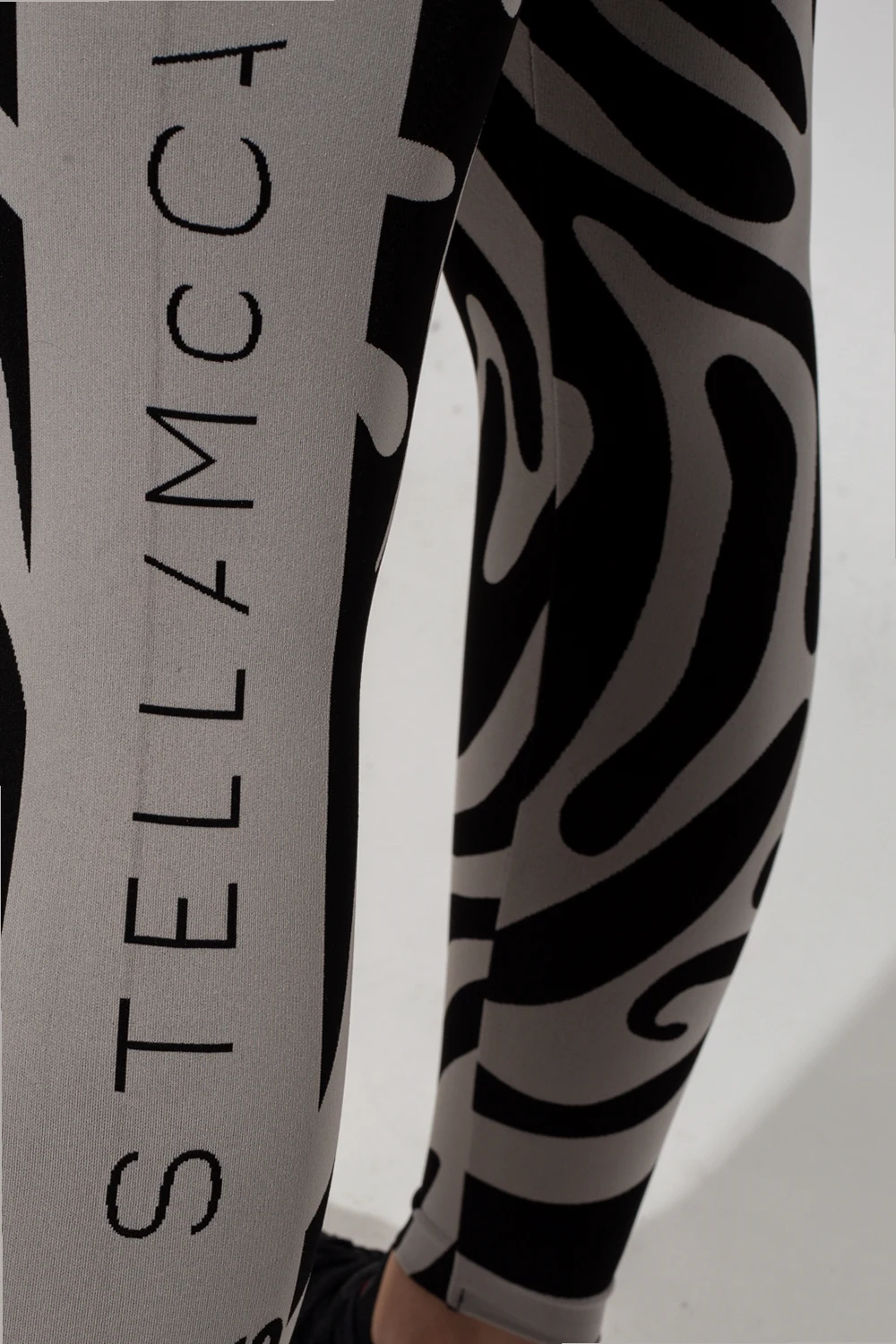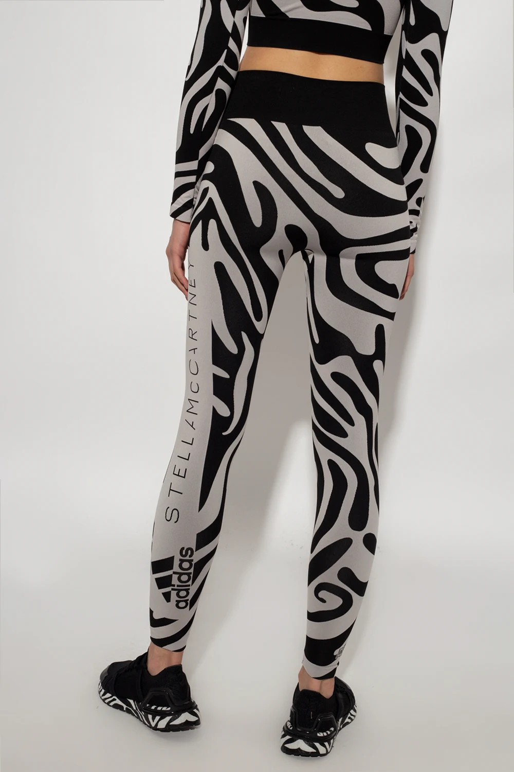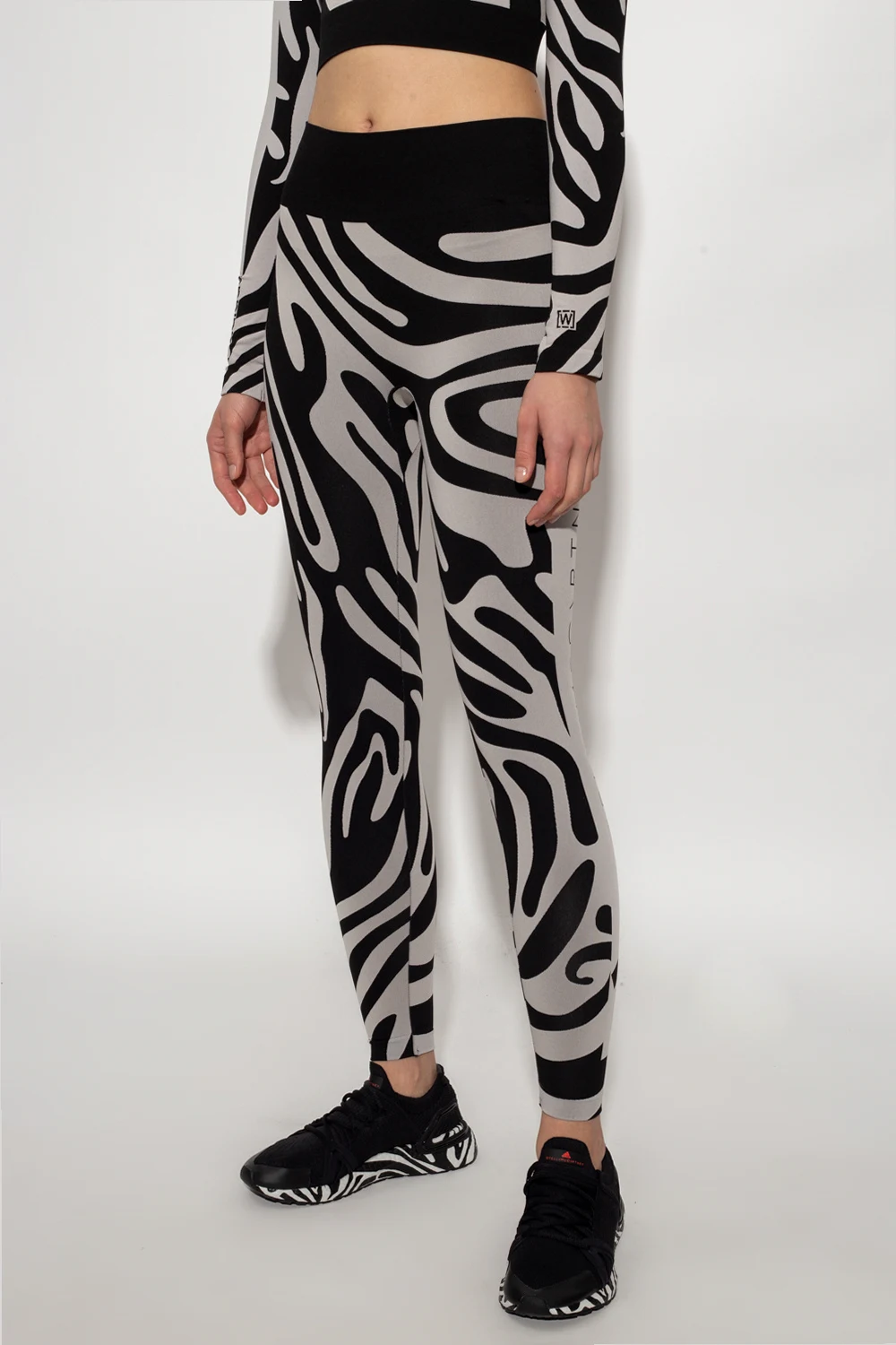 Szaro-czarne legginsy z wysokim stanem ADIDAS by Stella McCartney, kolekcja ‘Agent of Kindness’. Wykonane z dzianiny z materiałów z recyklingu. Ozdobione na całej długości wzorem z motywem zwierzęcym. Z boku wyszyte logo oraz znak firmowy ‘Wolford’.