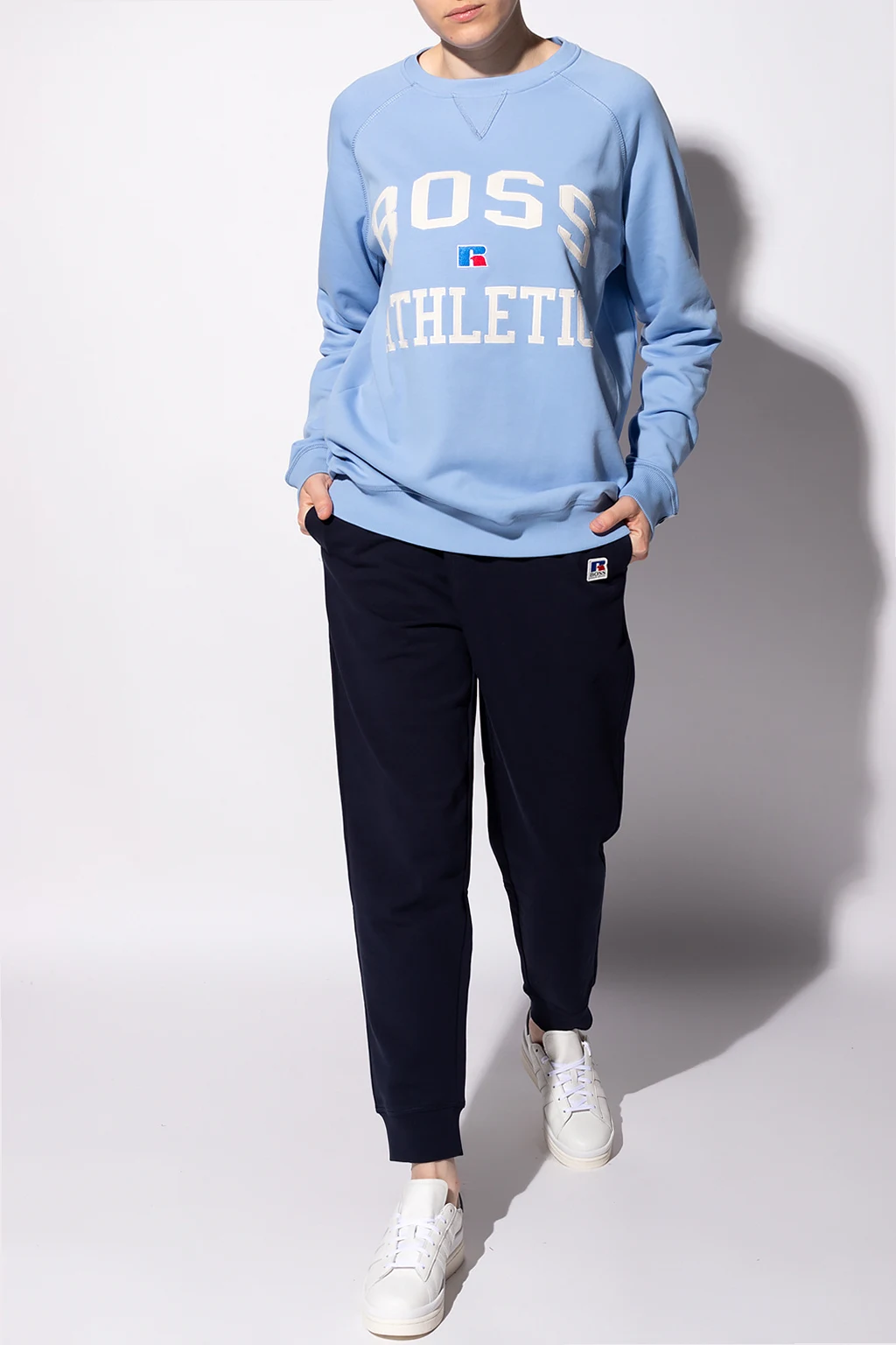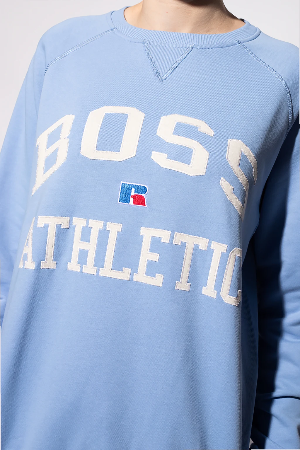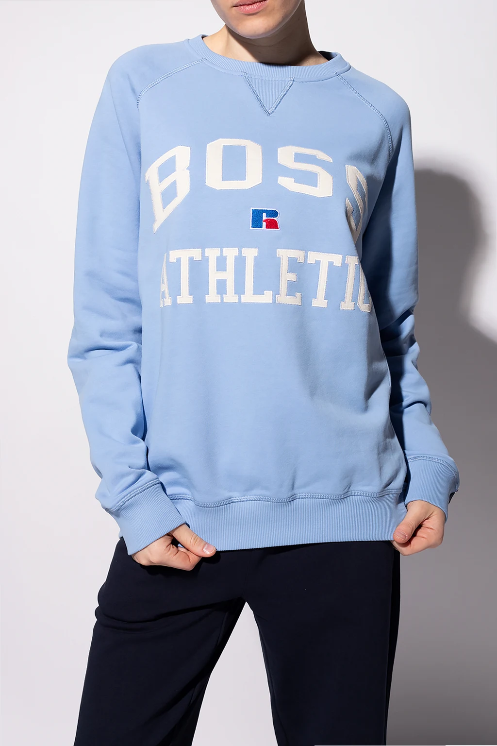 Jasnoniebieska, bawełniana bluza BOSS x Russell Athletic. Ozdobiona naszywką oraz logo w kolorach kremowym, niebieskim oraz czerwonym. Okrągły dekolt. Zakończona ściągaczami. Kolaboracja prezentuje odważne, ponadczasowe klasyki, które łączą luźne kroje, sportowe detale i inspirowaną stylem retro paletę kolorów.