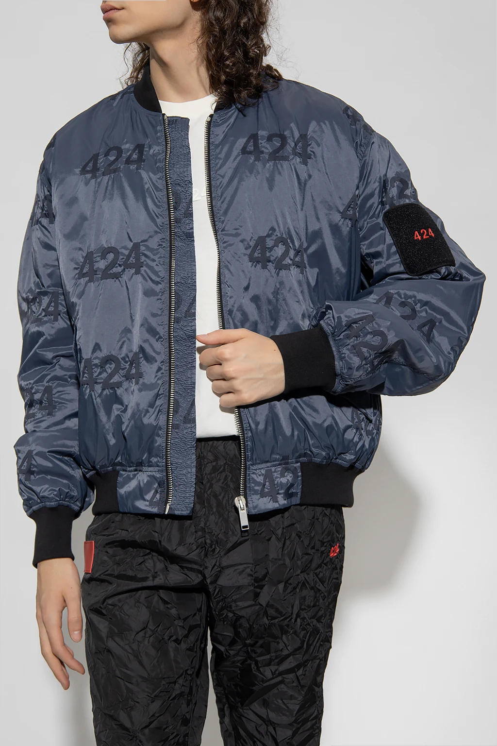 Niebieska kurtka typu ‘bomber’ 424. Zapinana na zamek. Ozdobiona nadrukowanym wzorem z logo. Na rękawie naszywka. Dwie kieszenie z patkami. Stójka, dół i długie rękawy wykończone ściągaczem.