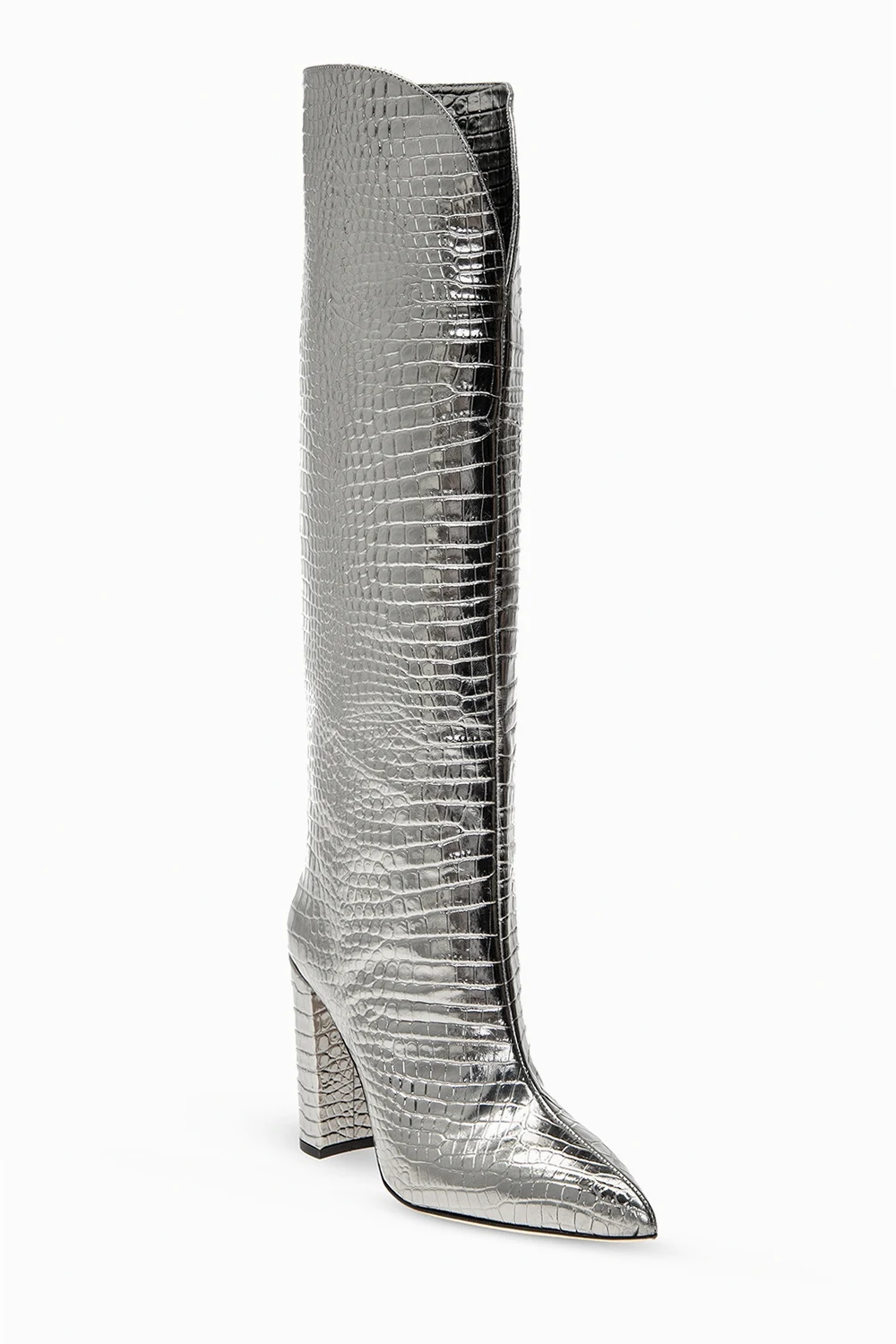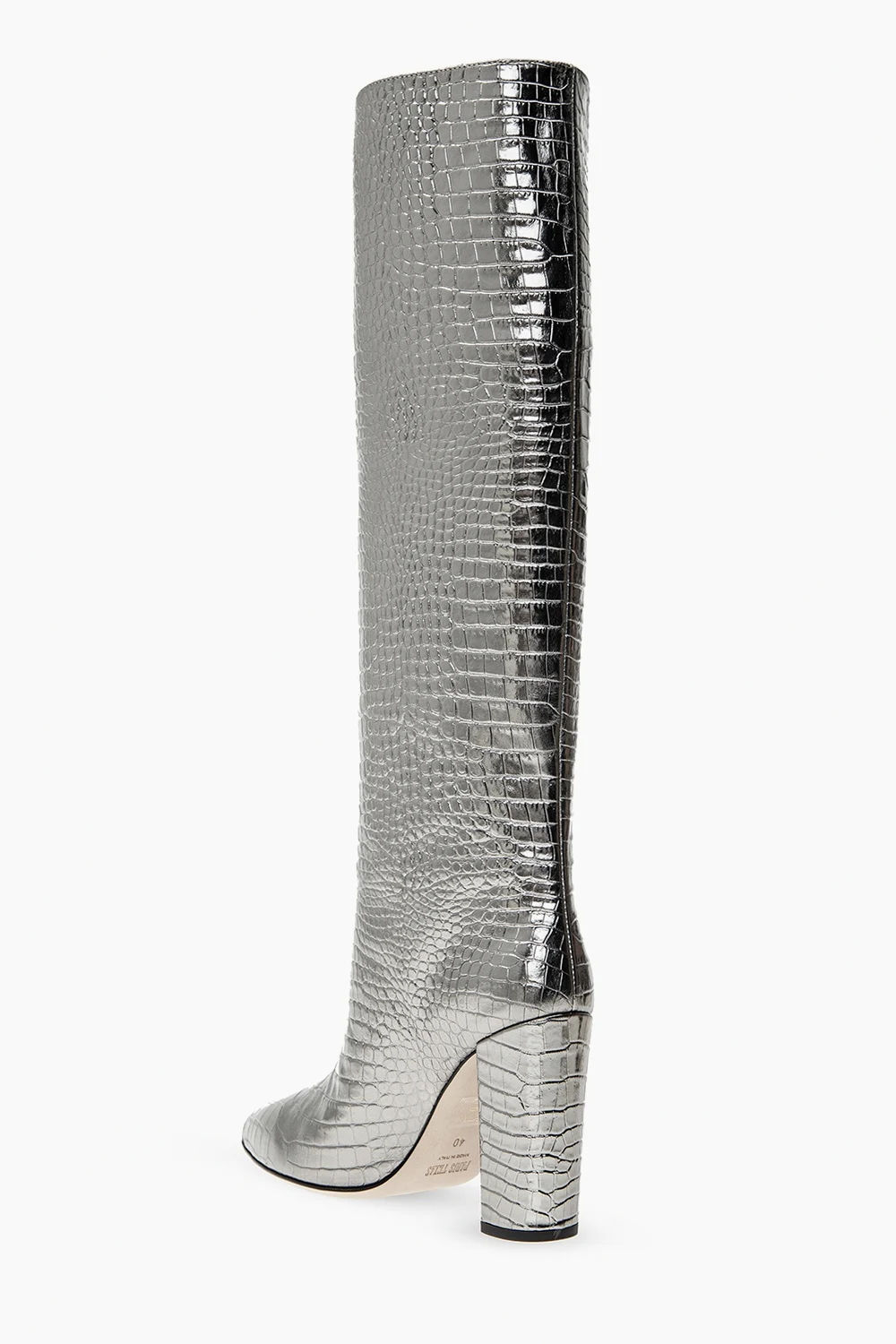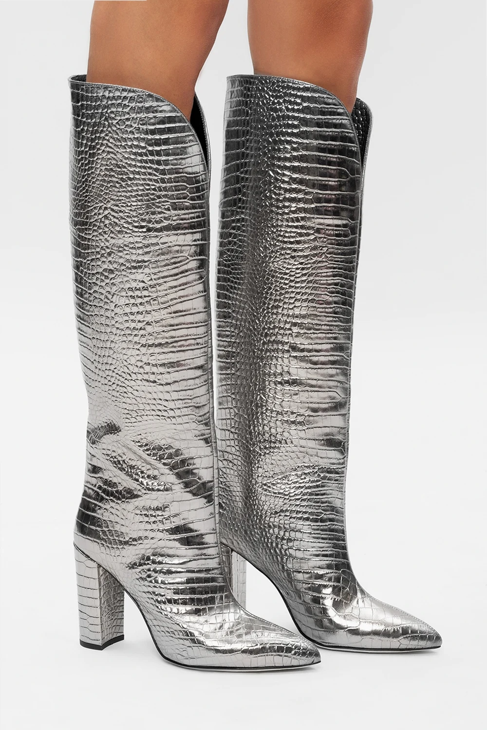 Kozaki na obcasie w kolorze srebrnym Paris Texas. Wykonane ze skóry imitującej skórę krokodyla. Metaliczne wykończenie. Beżowa, skórzana podeszwa.