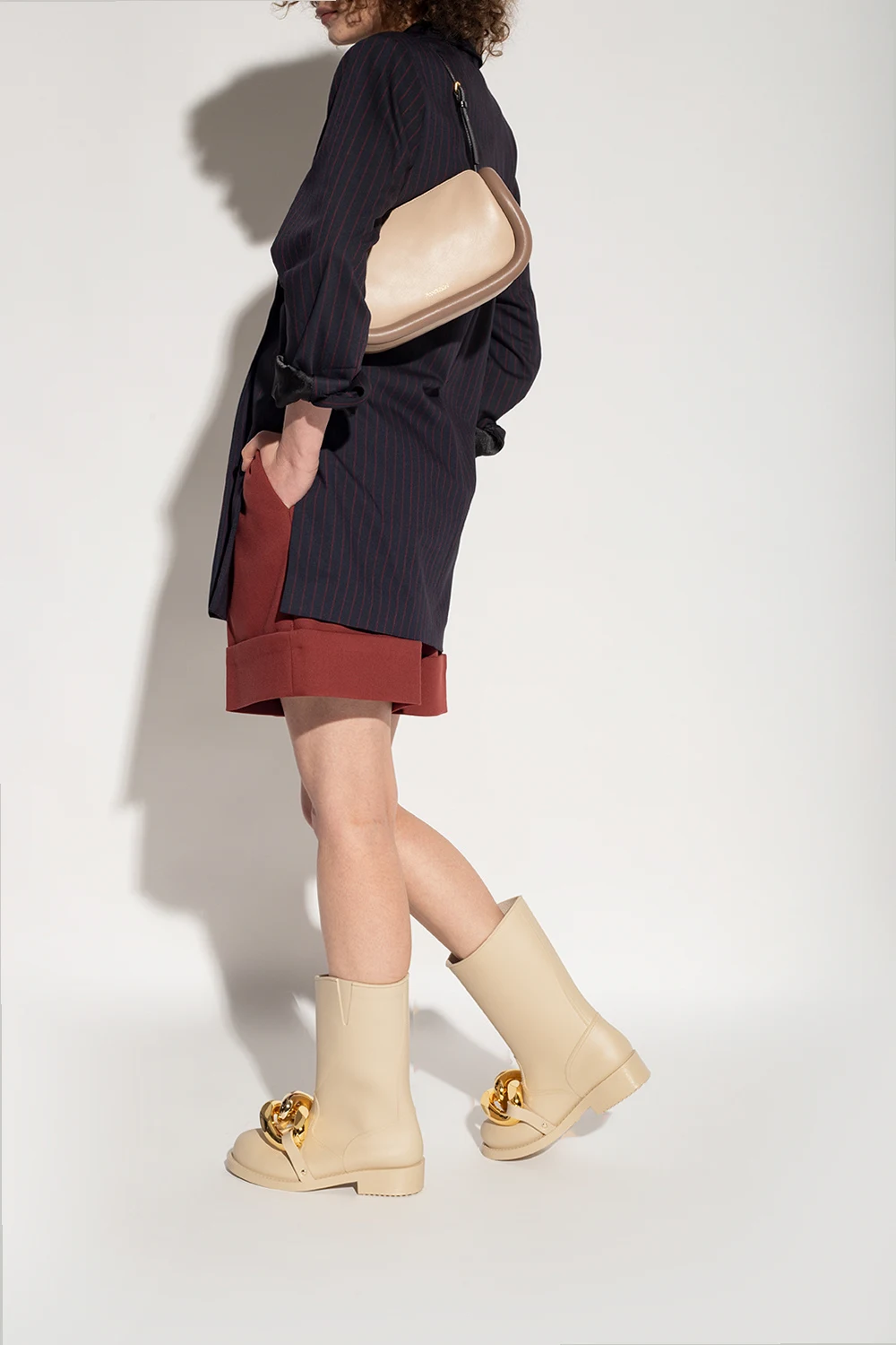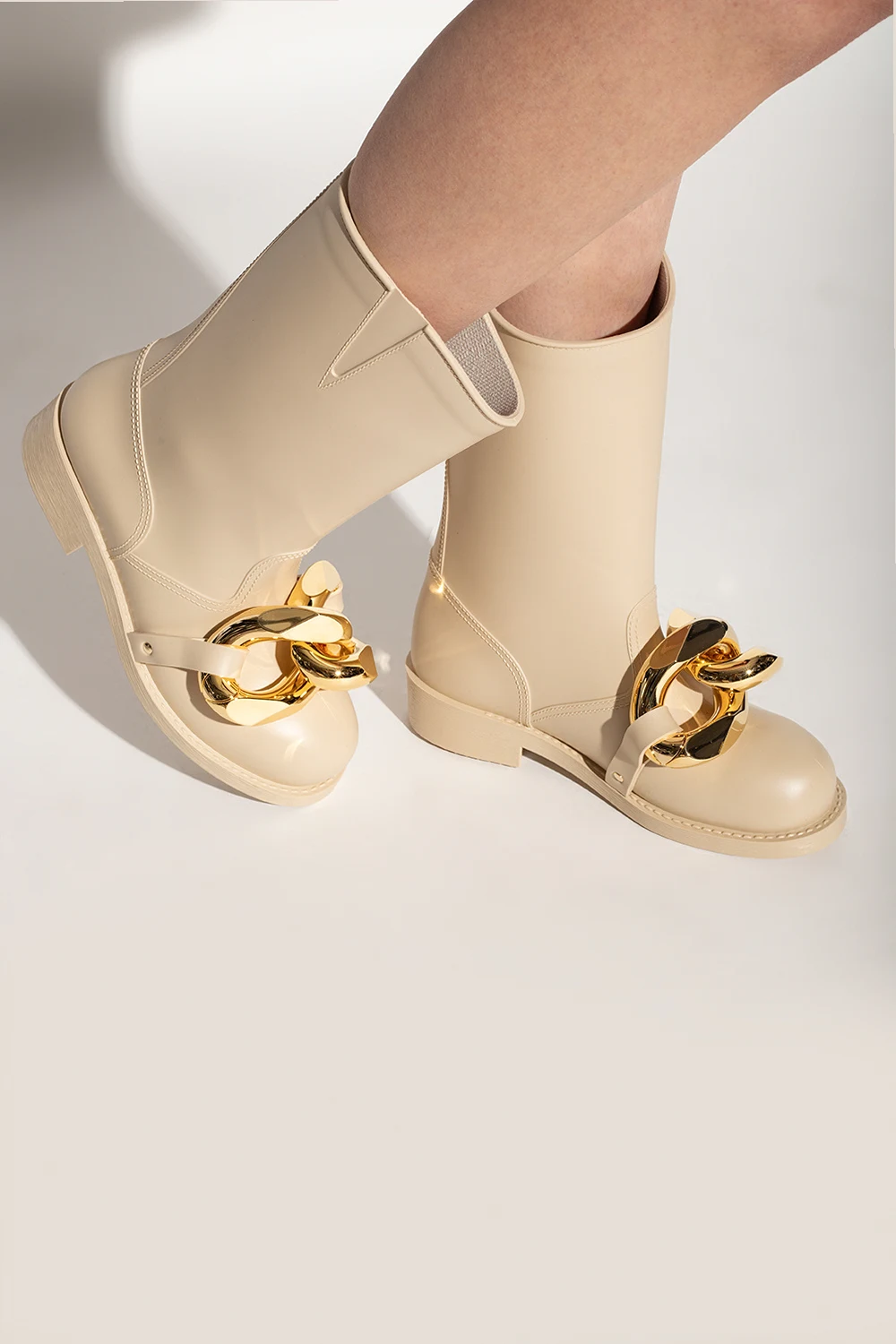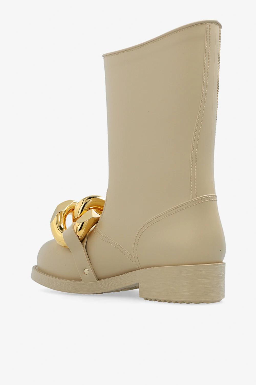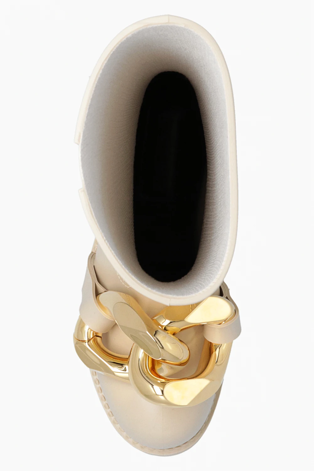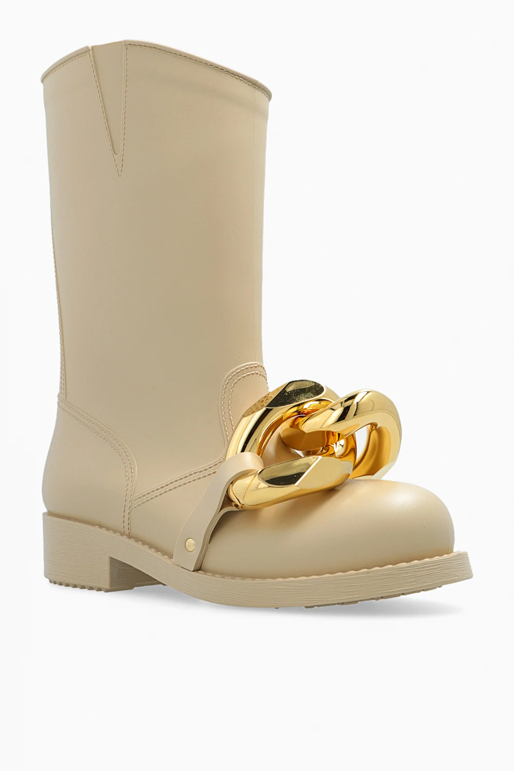 Beżowe kalosze JW Anderson. Asymetrycznie wykończona cholewka. Z przodu metalowa aplikacja w kształcie ogniw łańcucha w kolorze złotym. Gumowa podeszwa w kolorze beżowym.
