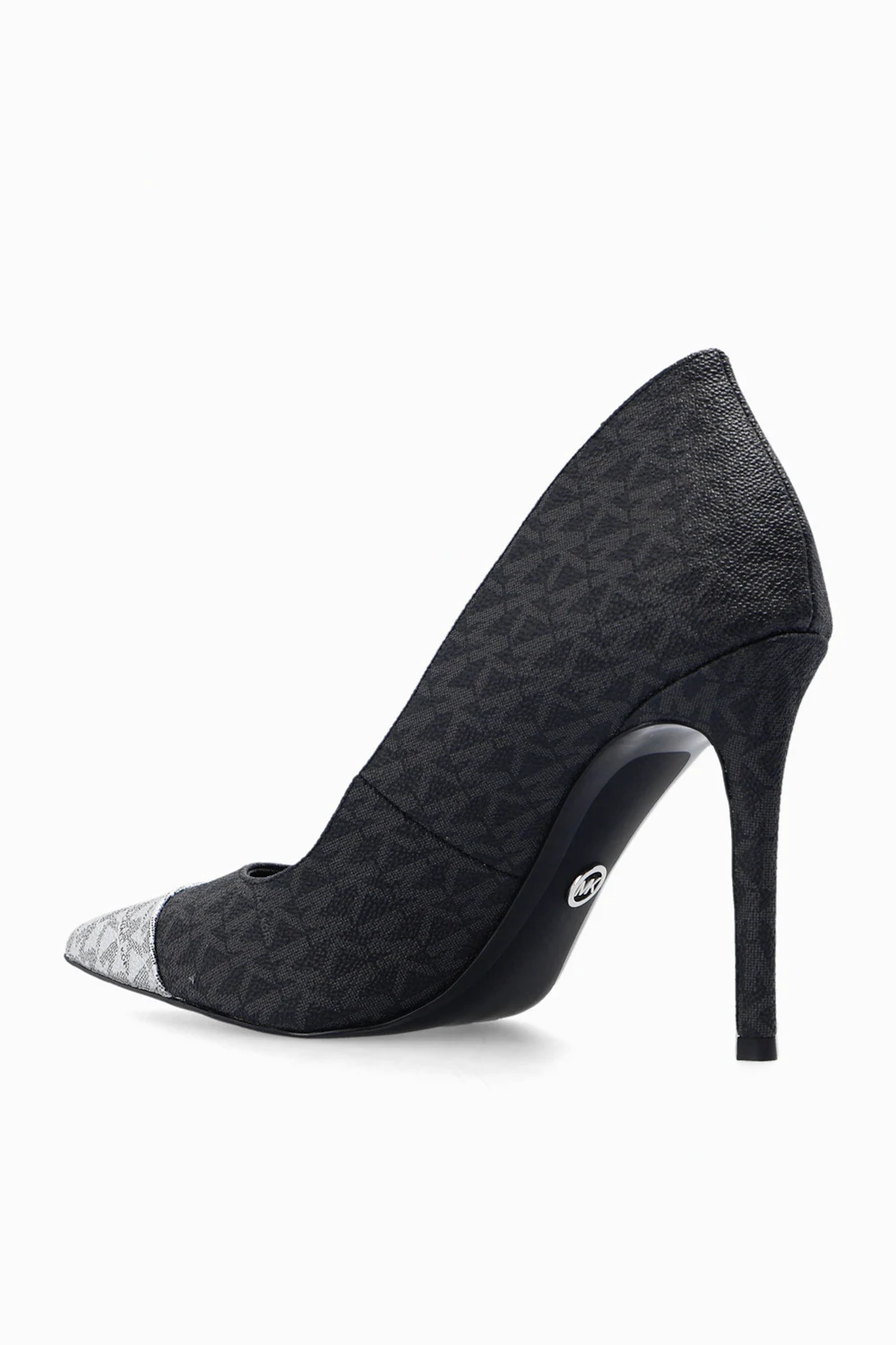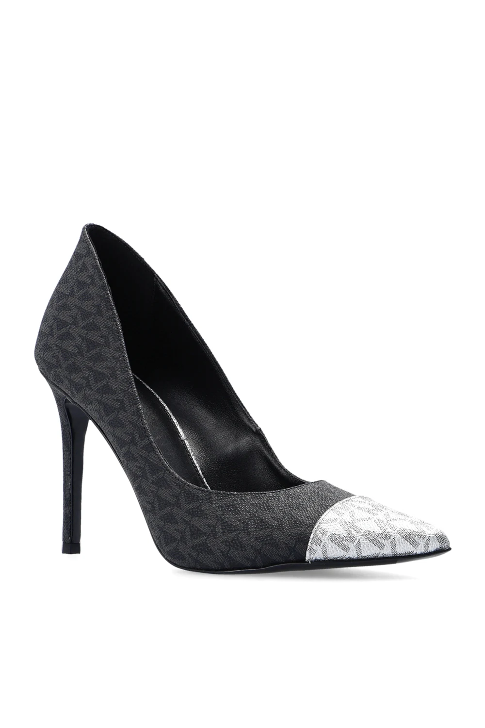 Szpilki w kolorze czarno-srebrno-szarym, model 'Keke' Michael Michael Kors. Wykonane z płótna z nadrukiem 'Signature'. Zwężany nosek w kolorze srebrnym. Czarna, gumowa podeszwa.