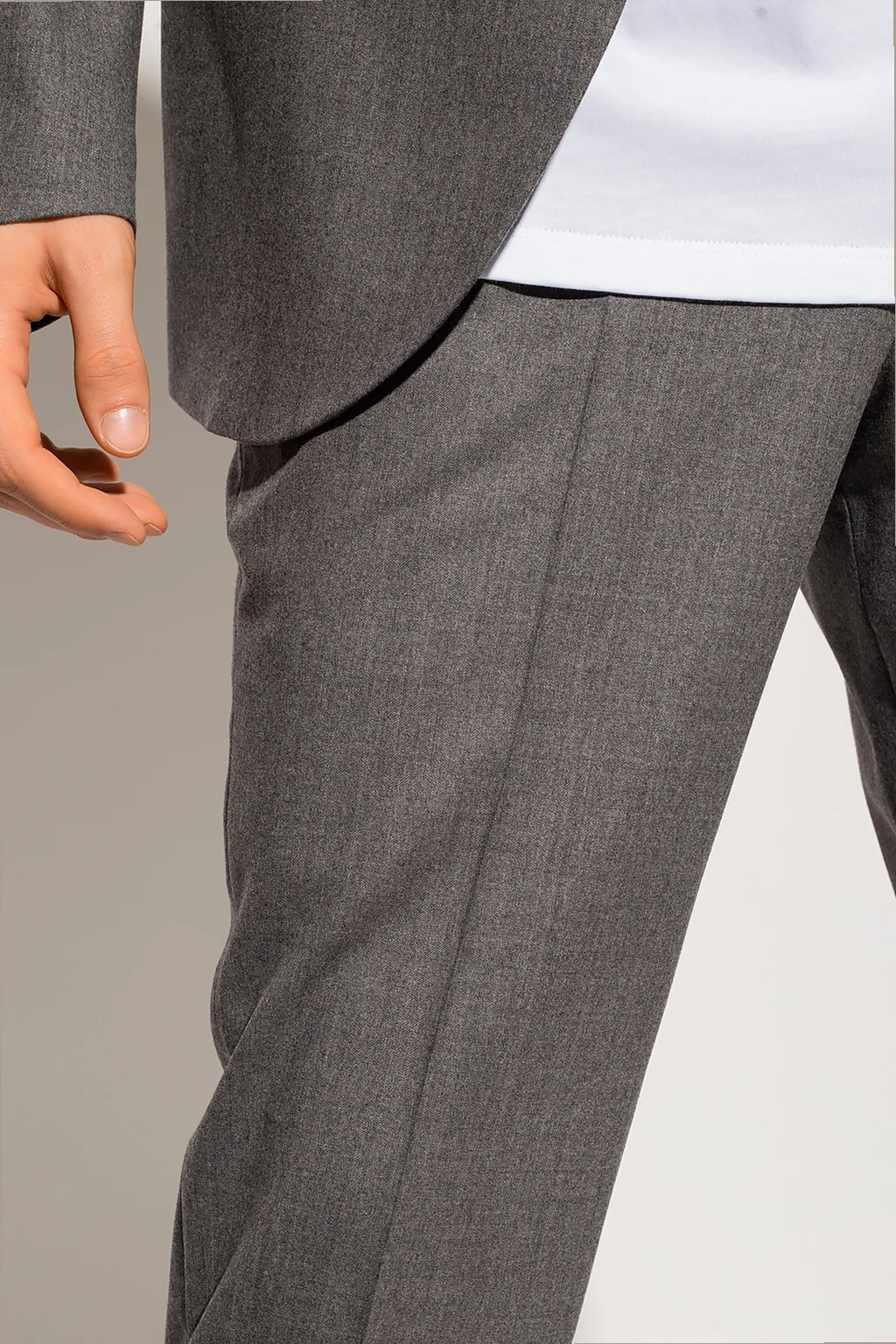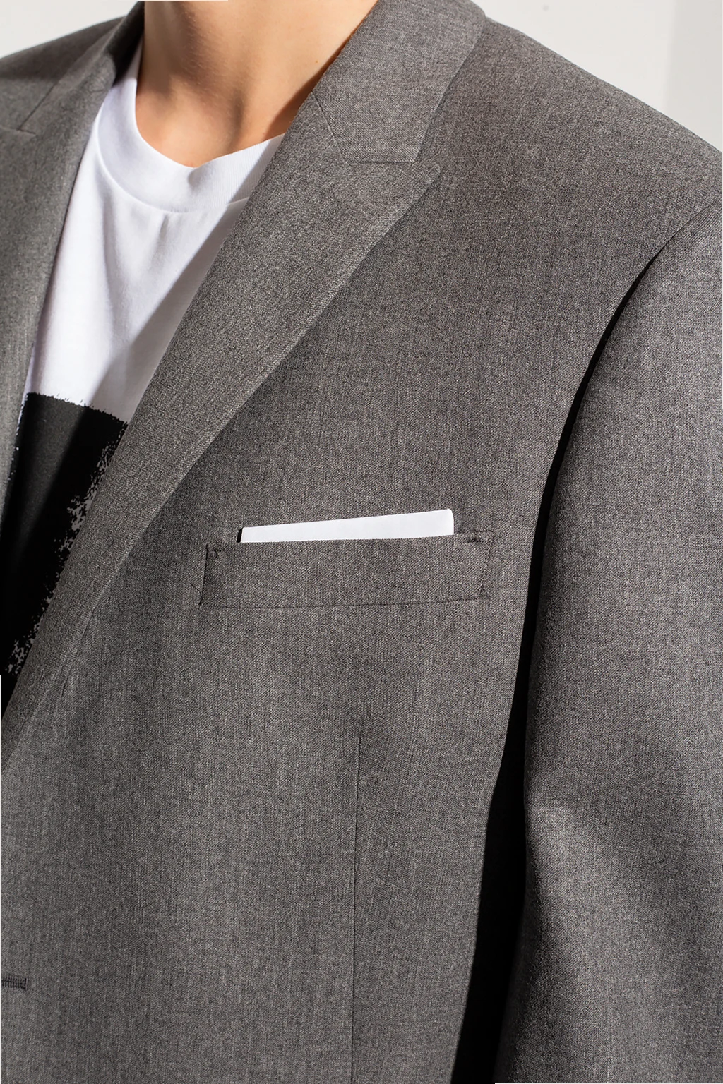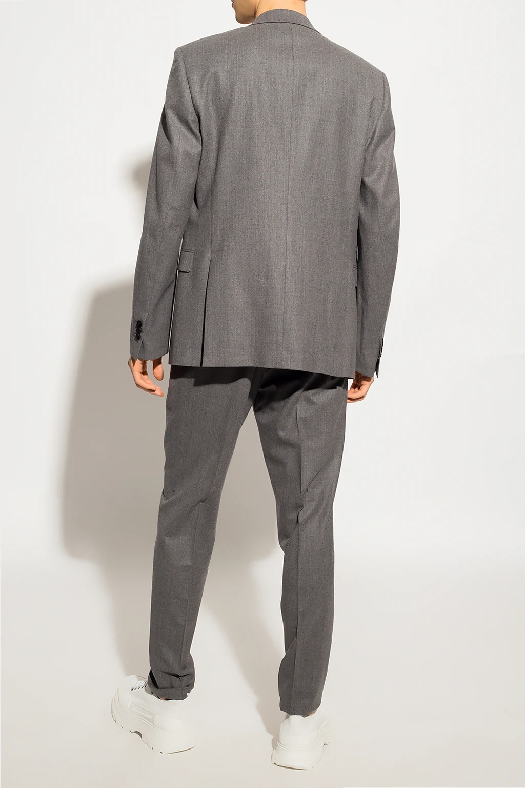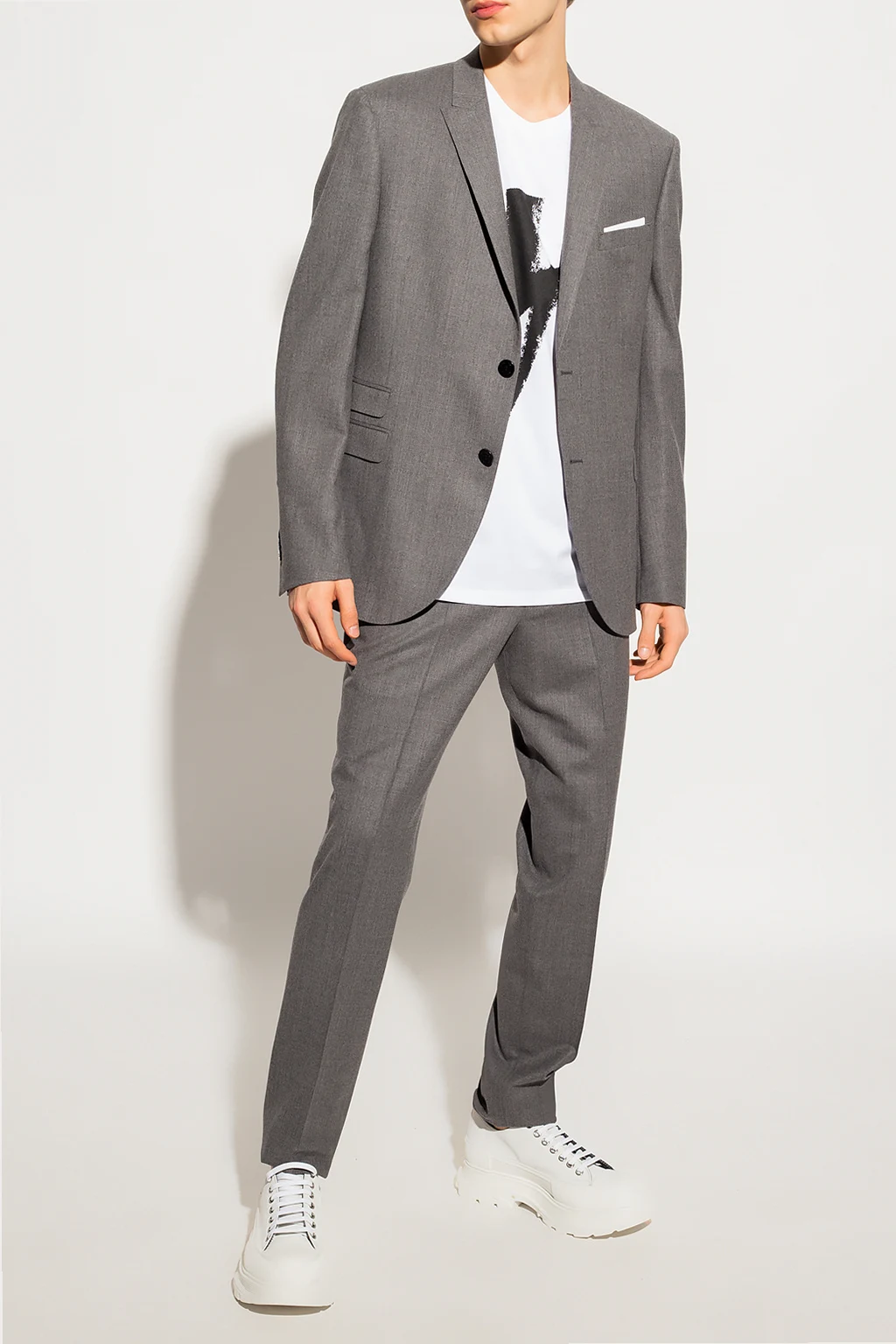 Szary, wełniany garnitur Neil Barrett. Marynarka z zamkniętymi klapami. Zapinana na guziki. Trzy kieszenie z patkami i jedna wsuwana. Z tyłu podwójne rozcięcie. Spodnie w kant zapinane na zamek oraz guziki. Z przodu dwie wsuwane kieszenie. Z tyłu dwie kieszenie zapinane na guzik. Długie lekko zwężane nogawki z surowym wykończeniem.