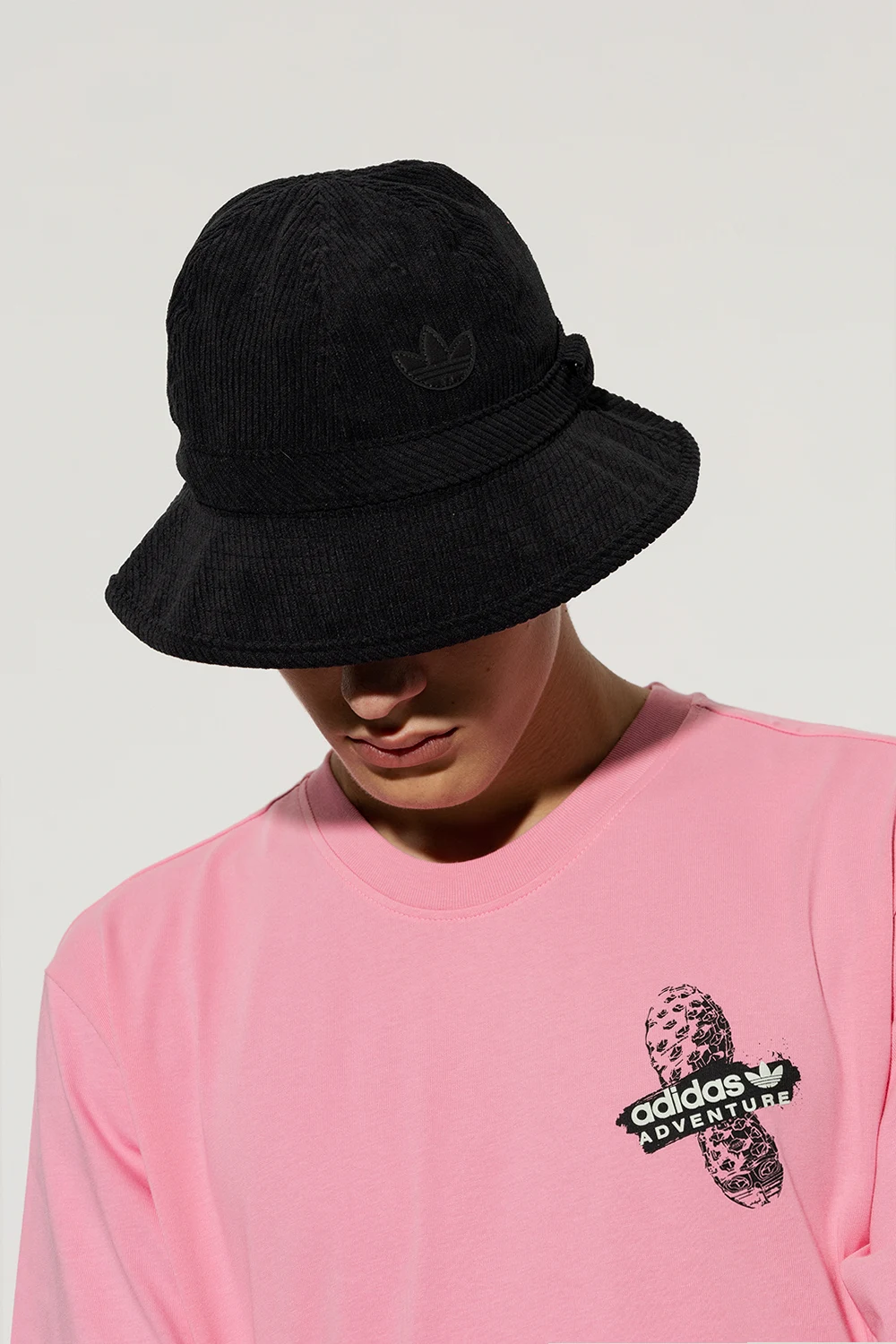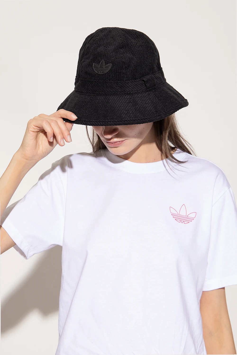Czarny, sztruksowy kapelusz ADIDAS Originals. Wykonany z materiału z recyklingu. Z przodu ozdobiony naszywką w kształcie logo.