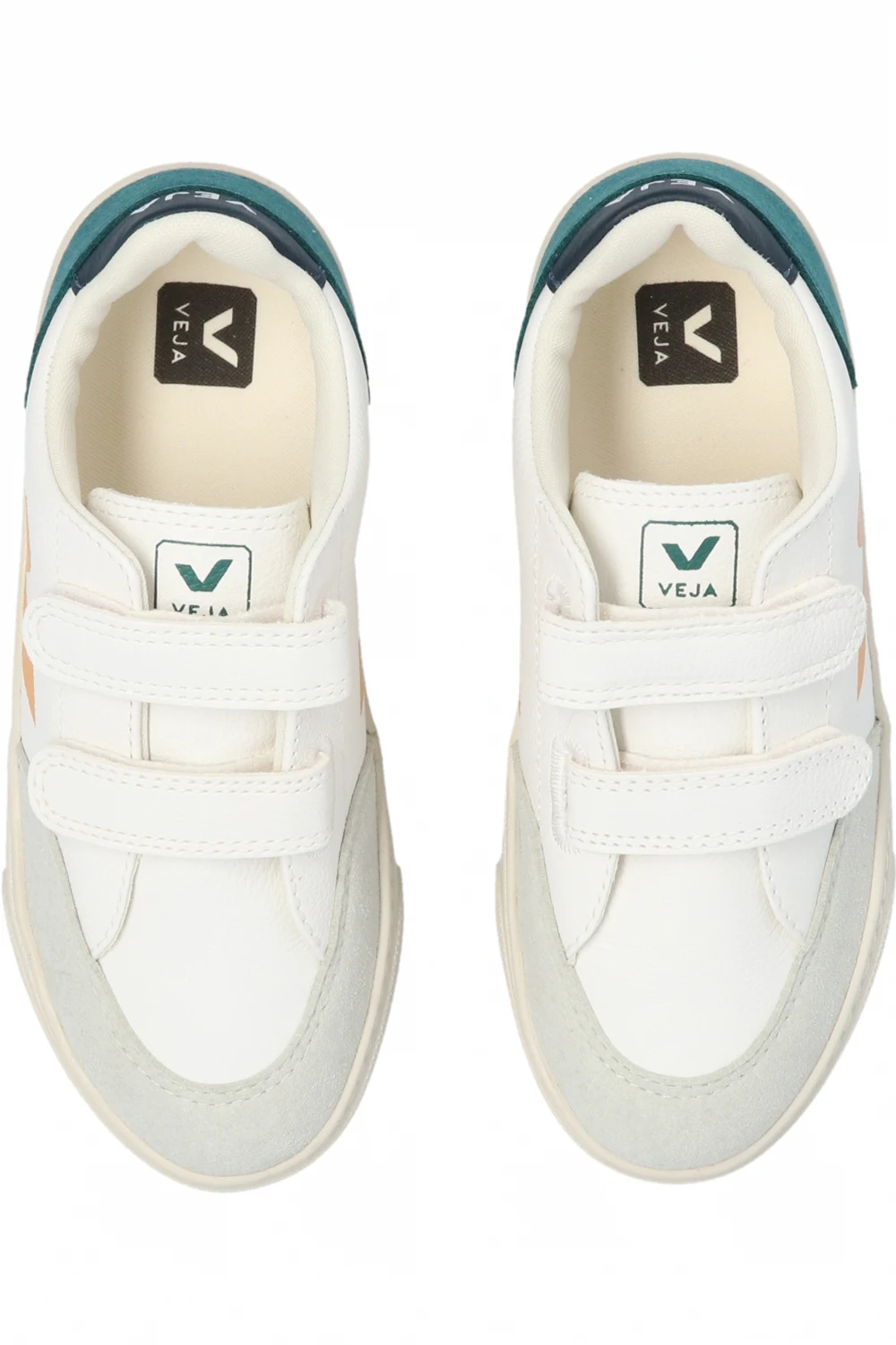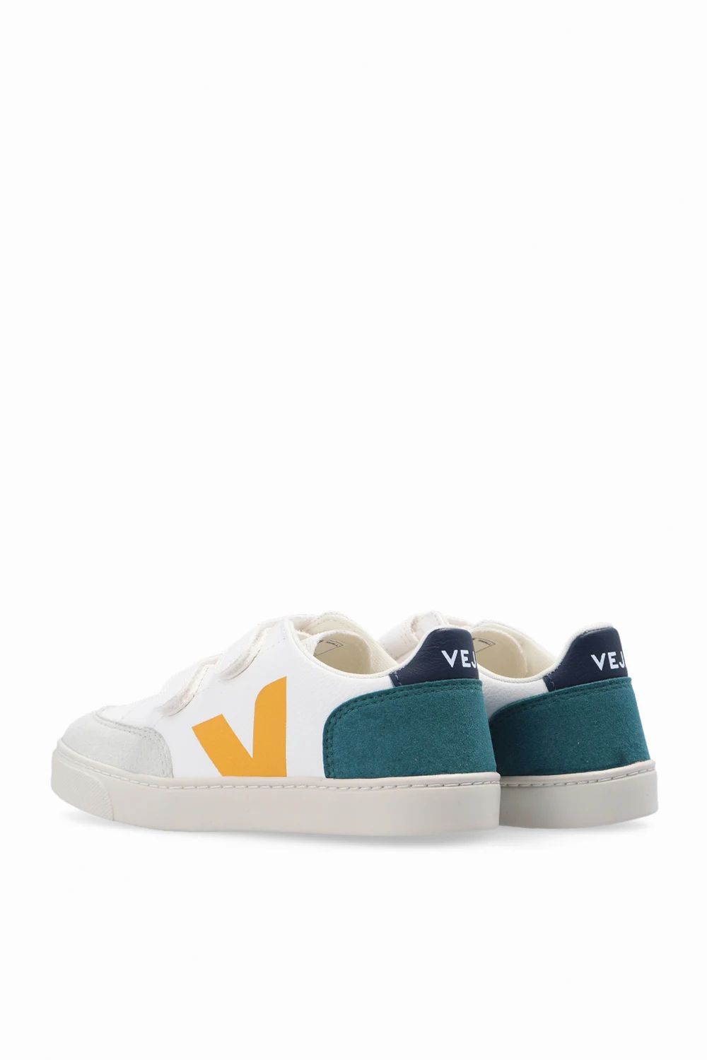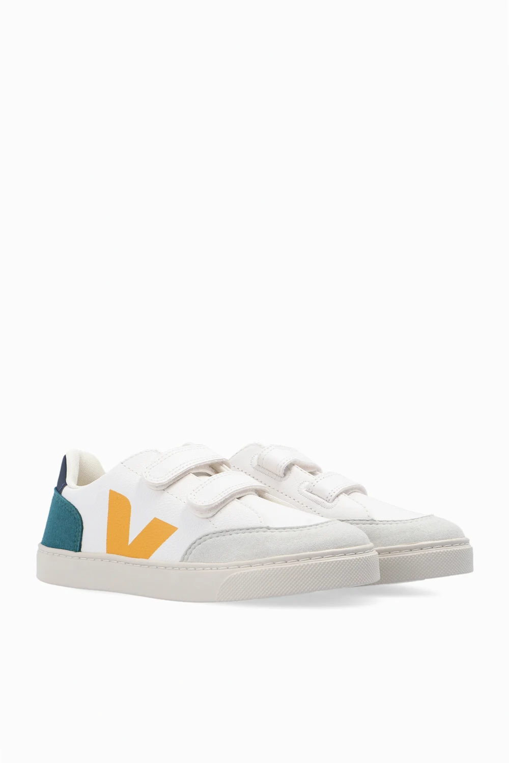 Białe buty sportowe, model ‘V-12’ Veja Kids. Wykonane ze skóry bez użycia chromu. Wykończone wegańskim materiałem imitującym zamsz. Zapinane na rzepy. Logo nadrukowane metodą sitodruku w kolorze pomarańczowym. Granatowy zapiętek. Z tyłu wstawka w kolorze ciemnozielonym. Warstwa wewnętrzna o specjalnej, siateczkowej strukturze wykonana z materiału pochodzącego z recyklingu – cechuje się wyjątkową odpornością na tarcie. Wkładka wykonana z trzciny cukrowej, gumy Amazon, bawełny organicznej i pochodzącej z recyklingu pianki EVA. Kremowa, gumowa podeszwa wykonana z materiałów organicznych oraz pochodzących z recyklingu.