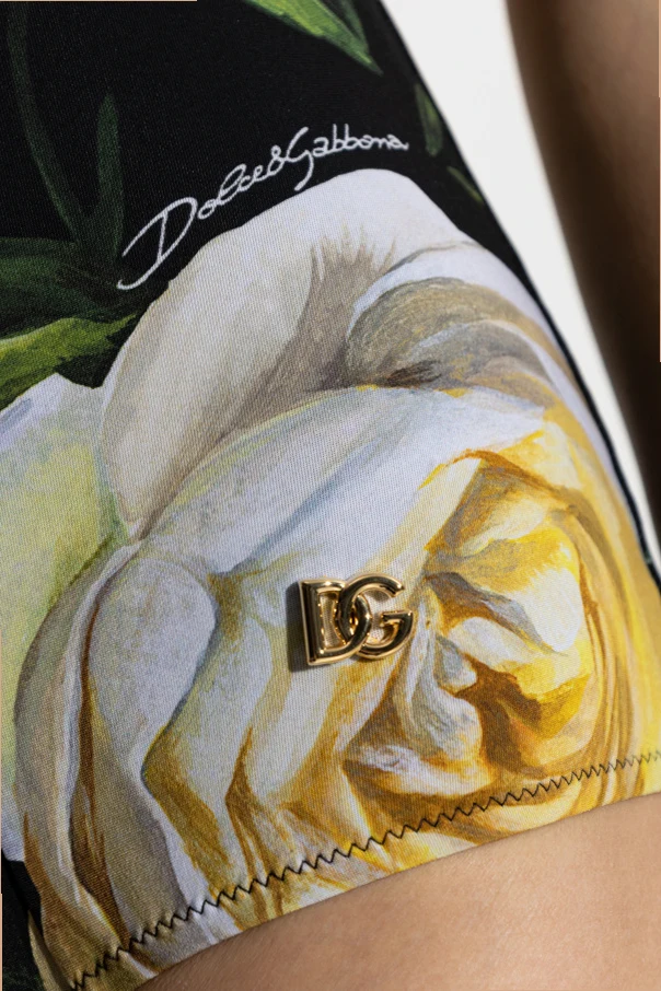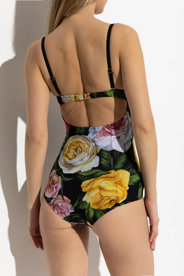Przedstawiamy jednoczęściowy kostium kąpielowy z ekskluzywnej kolekcji marki Dolce & Gabbana , który emanuje włoską elegancją i finezją. Ten wyjątkowy model zachwyca wyrazistym, kwiatowym wzorem pełnym życia, w którym dominują róże w kolorach żółtym, różowym, czerwonym, białym i zielonym na ciemnym tle.