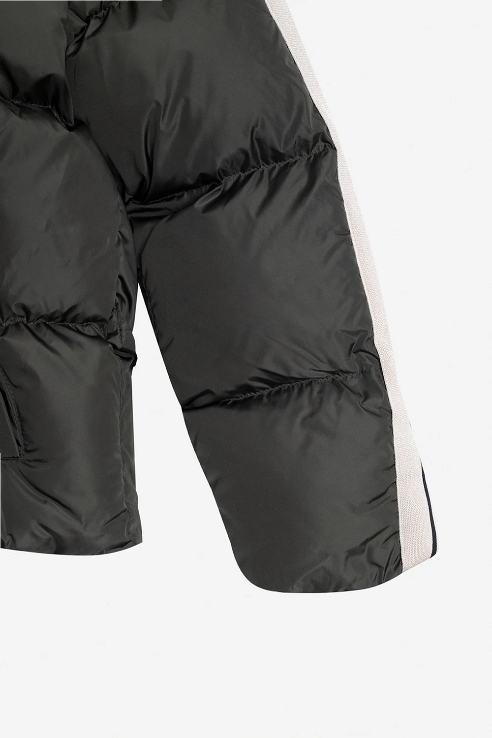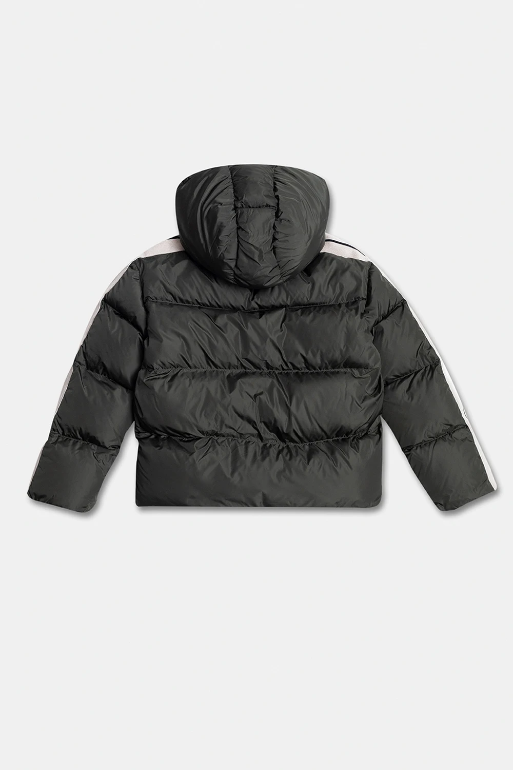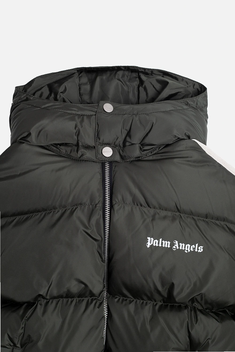 Ciemnozielona, pikowana kurtka z kapturem Palm Angels Kids. Zapinana na zamek. Odpinany kaptur z zapięciem na zatrzaski. Z przodu nadrukowane logo w kolorze białym. Na ramionach naszyte kremowo-czarne paski. Dwie wsuwane kieszenie. Długie rękawy oraz dół wykończone ściągaczem.