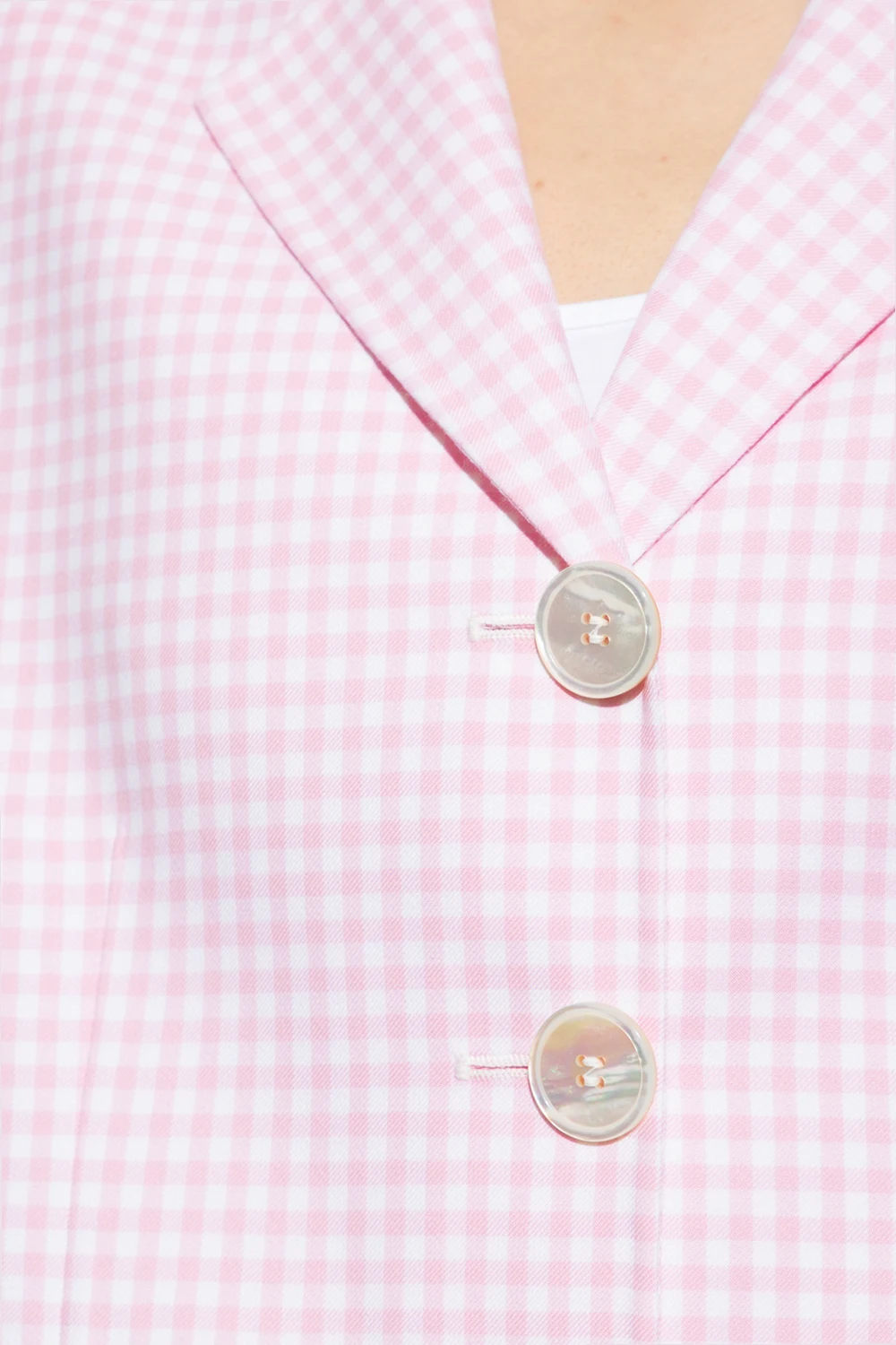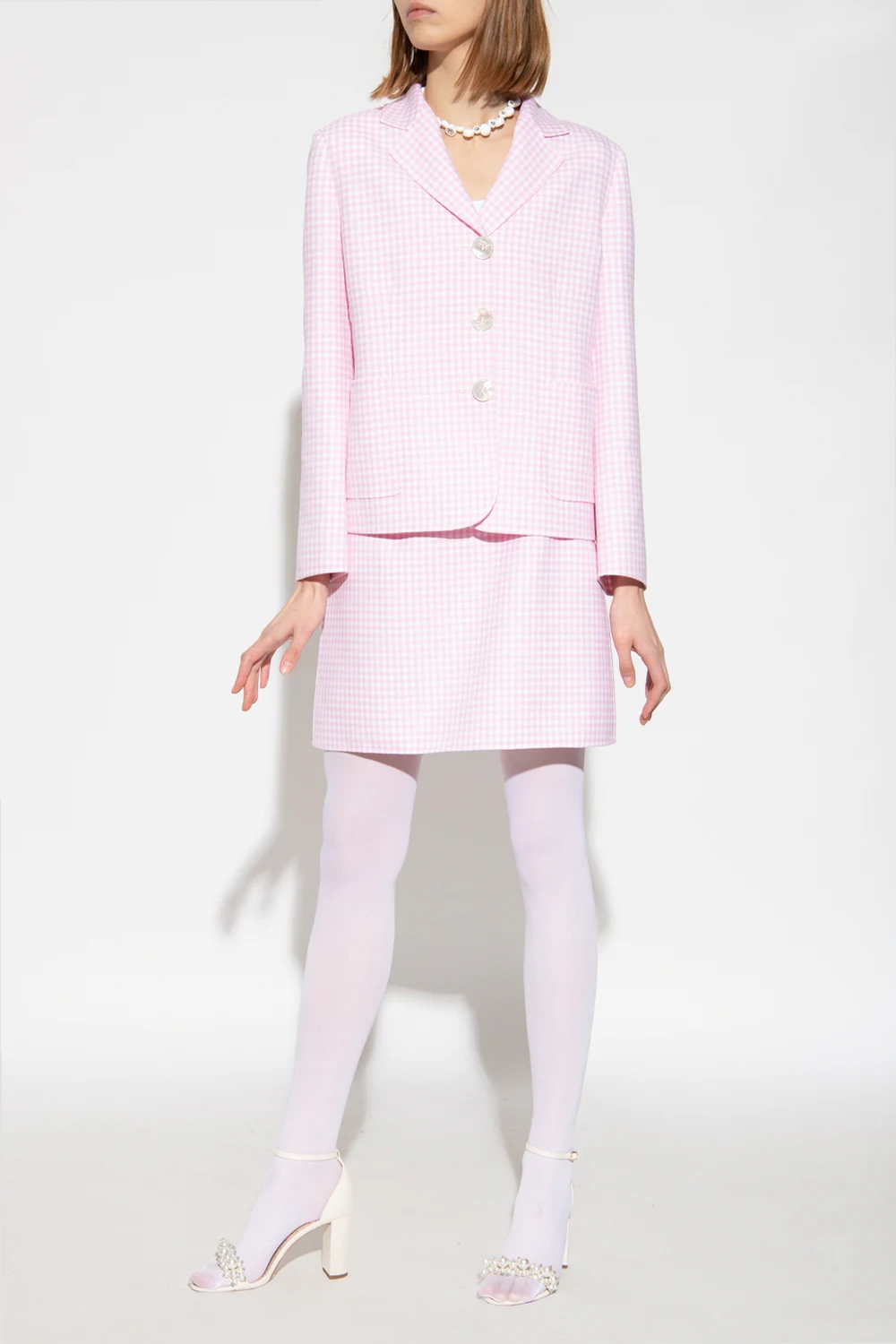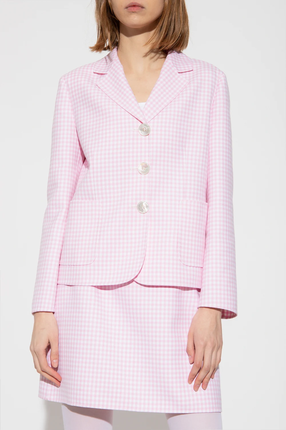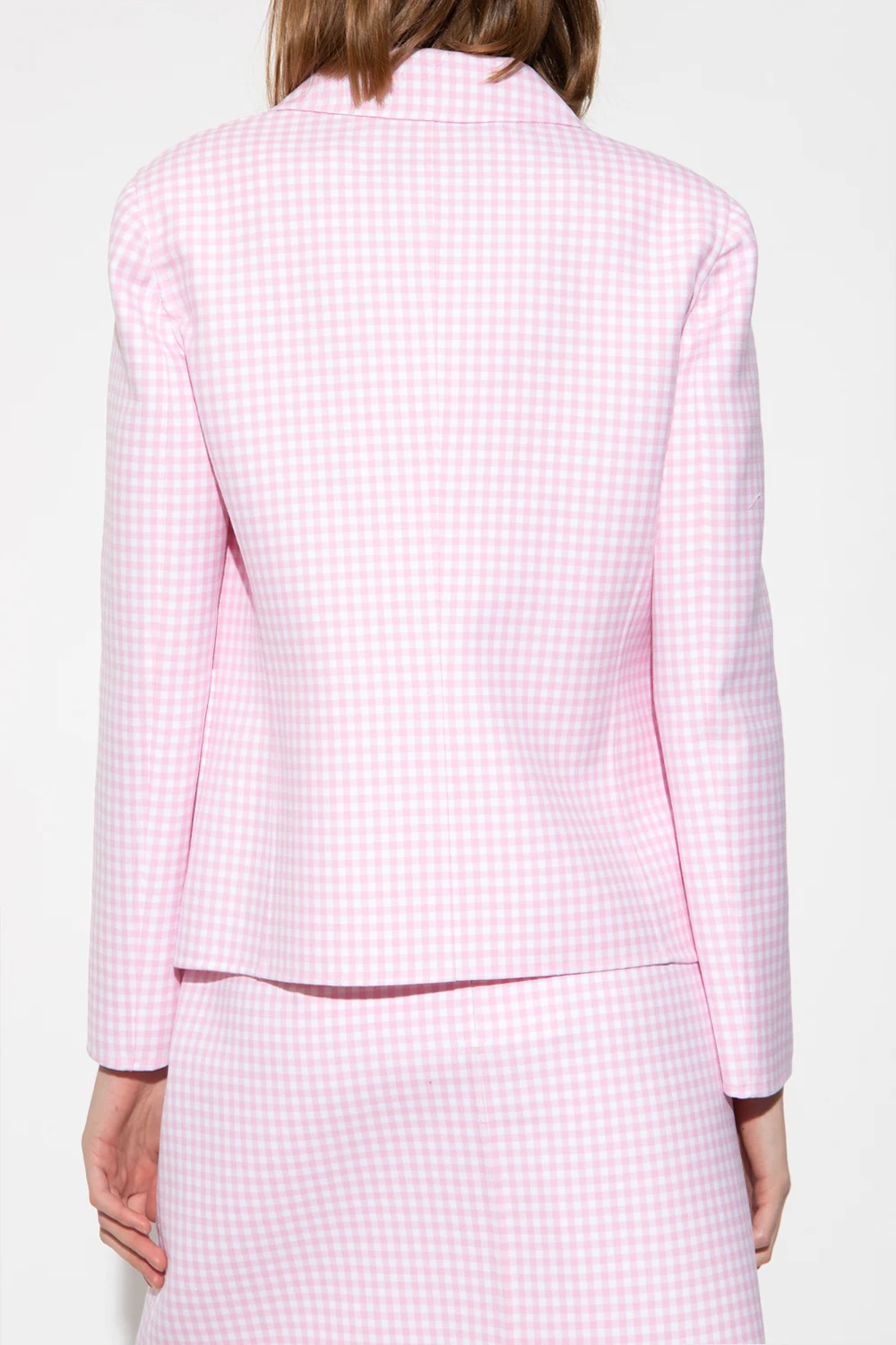 Różowo-biała, wełniana marynarka z otwartymi klapami Michael Kors. Zapinana na guziki. Ozdobiona wzorem w kratę. Z przodu dwie wsuwane kieszenie. Długie rękawy.