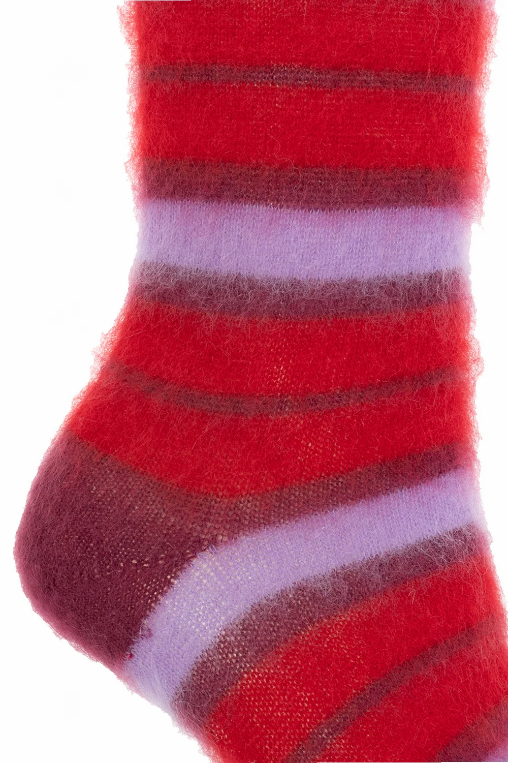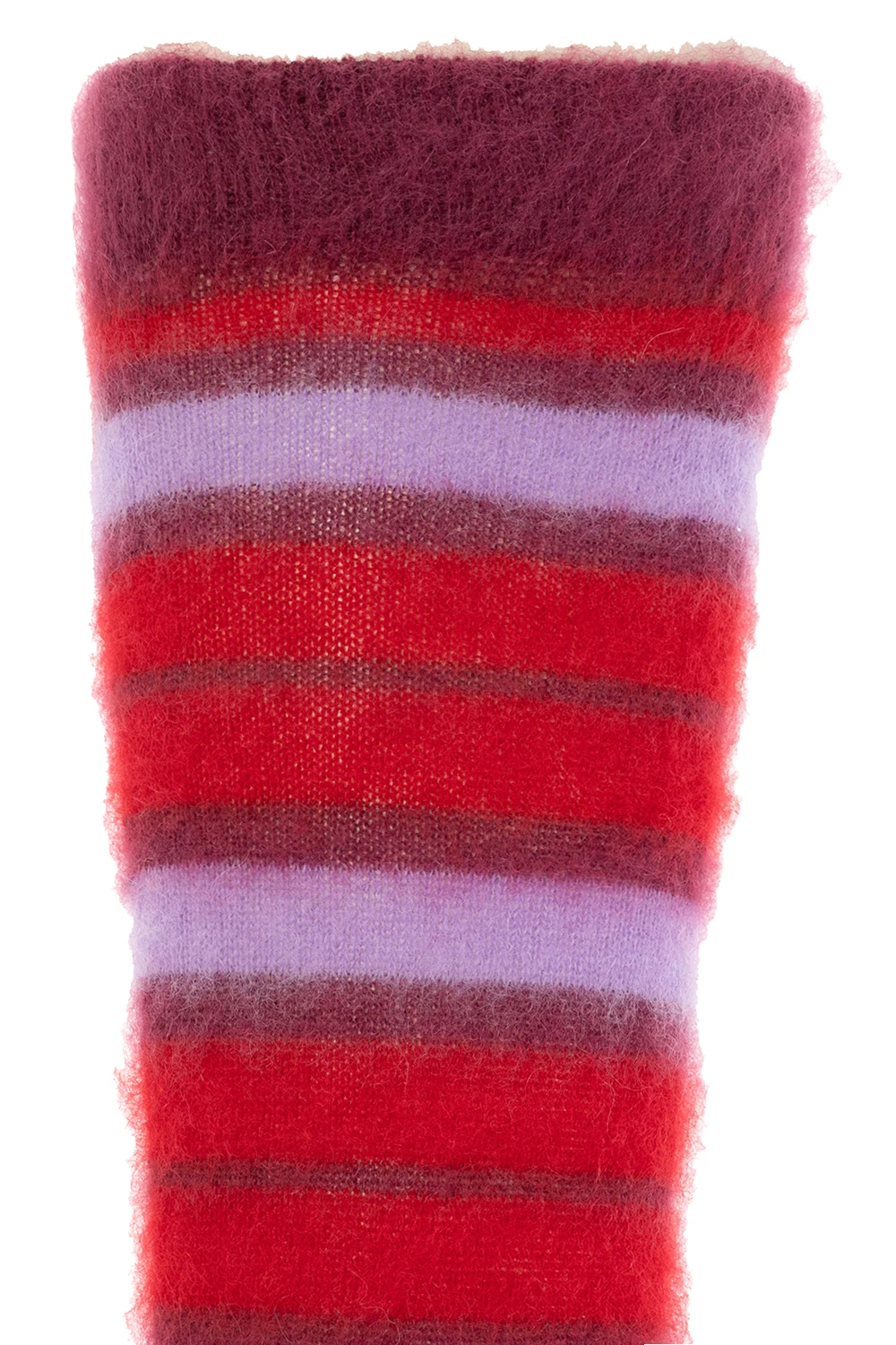 Czerwono-bordowo-fioletowe skarpety Marni. Ozdobione wzorem w pasy i nadrukowanym białym logo.