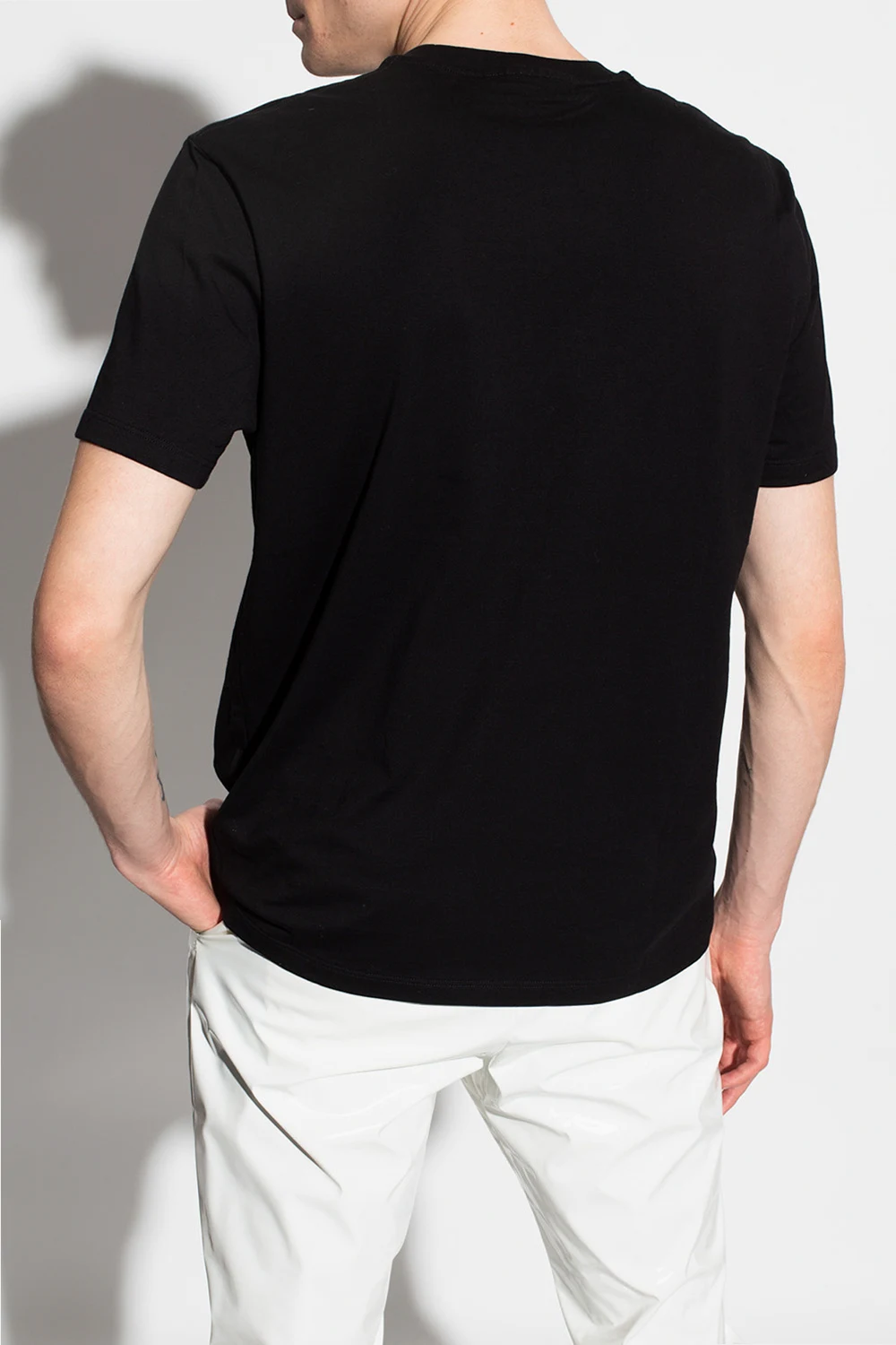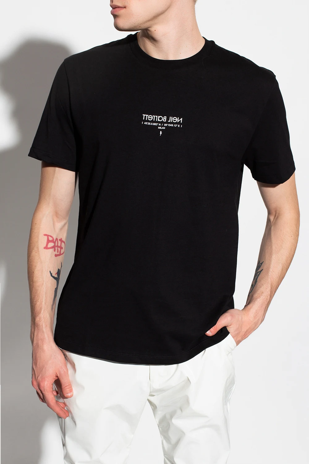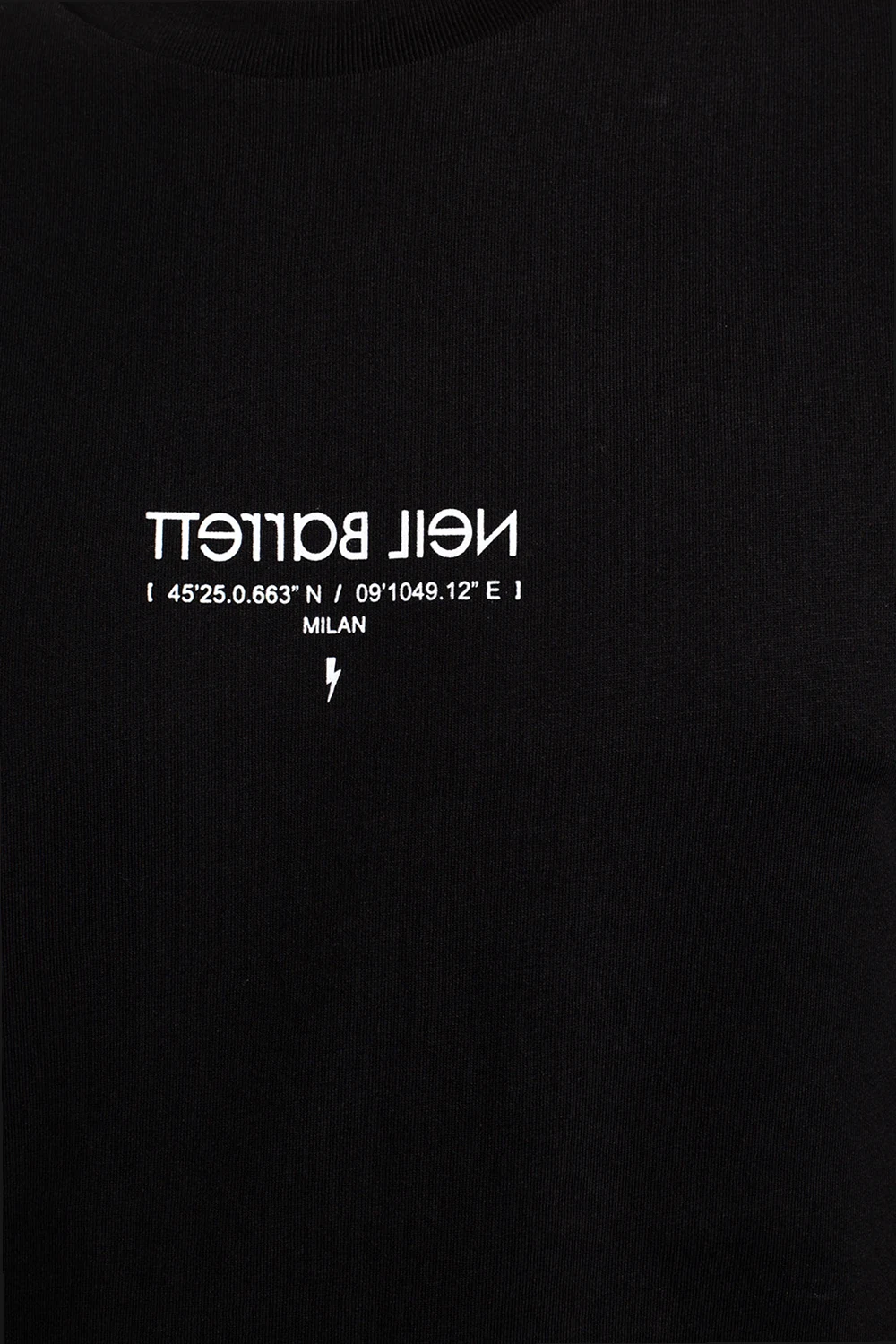 Czarny, bawełniany t-shirt Neil Barrett. Z przodu ozdobiony nadrukiem z logo w kolorze białym. Okrągły dekolt. Krótkie rękawy.