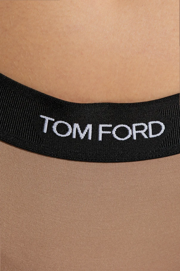 Stringi z logo marki Tom Ford to kwintesencja elegancji i luksusu w kategorii bielizny damskiej. Dominujący beżowy kolor doskonale komponuje się z czarnym elastycznym pasem , na którym widnieje wyraźny biały napis „TOM FORD” - charakterystyczny dla tej renomowanej marki. Krój klasycznych stringów subtelnie podkreśla sylwetkę, zapewniając minimalne pokrycie z tyłu.
