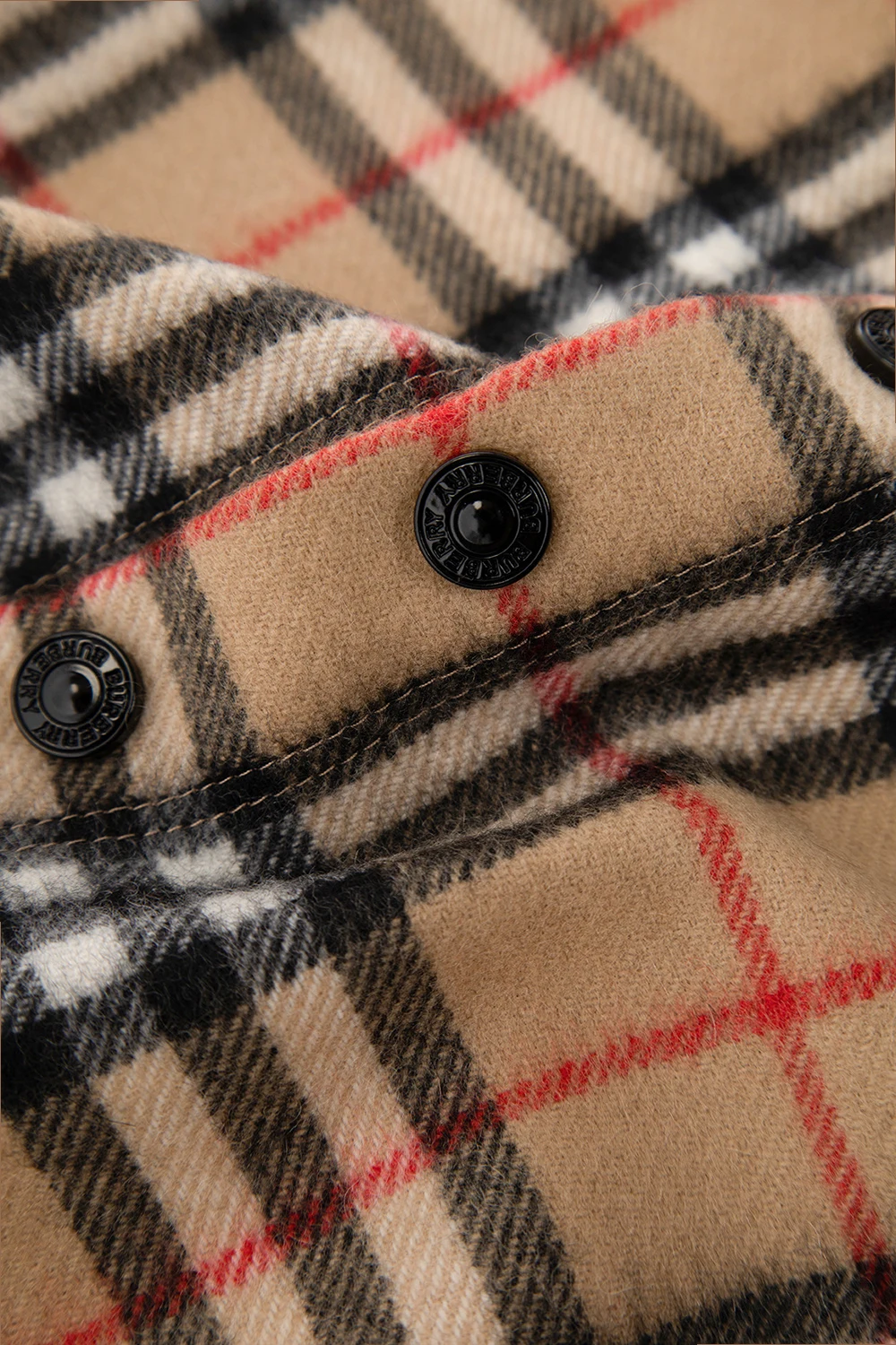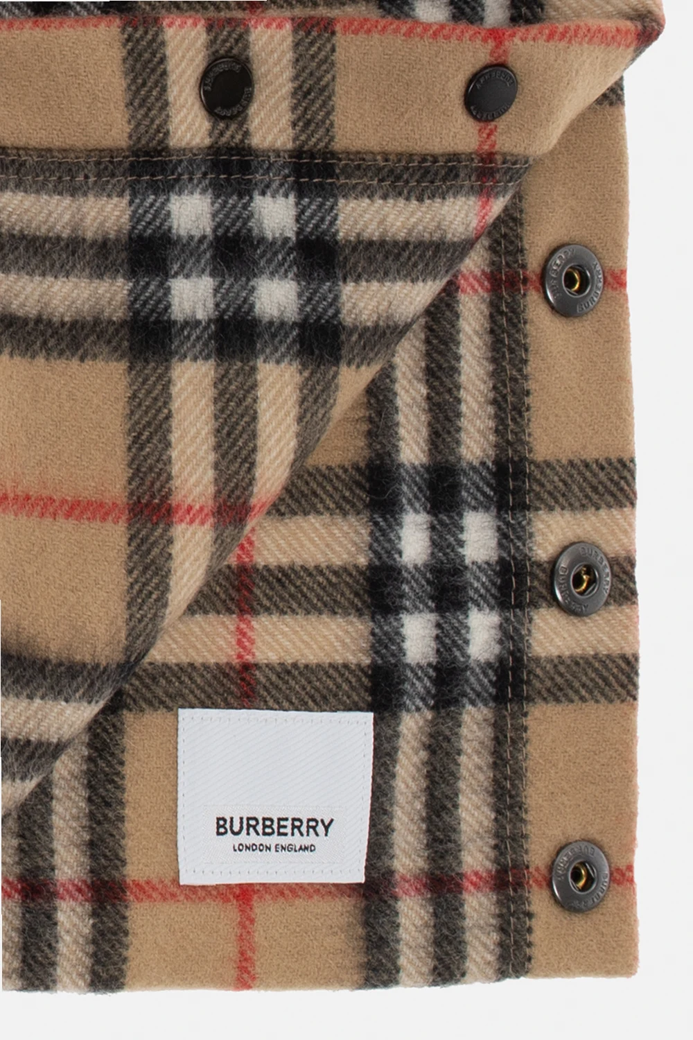 Beżowy szal Burberry Kids. Wykonany z kaszmiru. Na brzegu zapinany na zatrzaski. Ozdobiony charakterystycznym dla marki wzorem w czarno-czerwono-białą kratę.