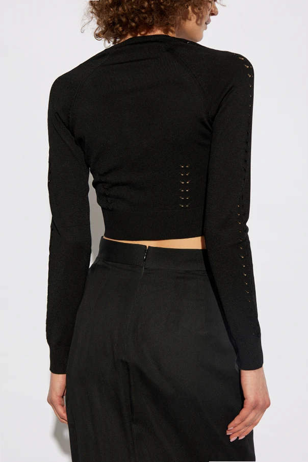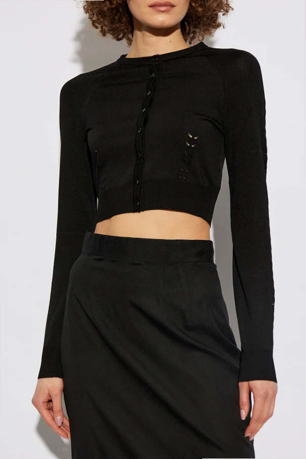 Odkryj kardigan z wycięciami , który zachwyca swoją unikalnością i elegancją. Ten krótki, dopasowany kardigan z długimi rękawami pochodzi z ekskluzywnej kolekcji włoskiej marki Dolce & Gabbana , której projekty są synonimem luksusu i wyrafinowania.