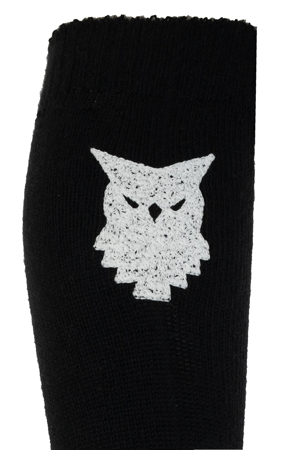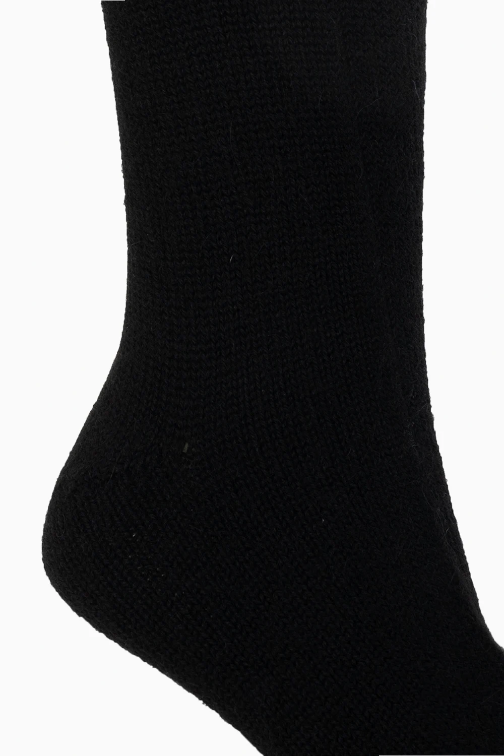 Czarne, długie skarpety Maison Margiela. Wykonane z wełny alpaki i ozdobione wyszytym motywem zwierzęcym w kolorze białym. Wykończone ściągaczem.