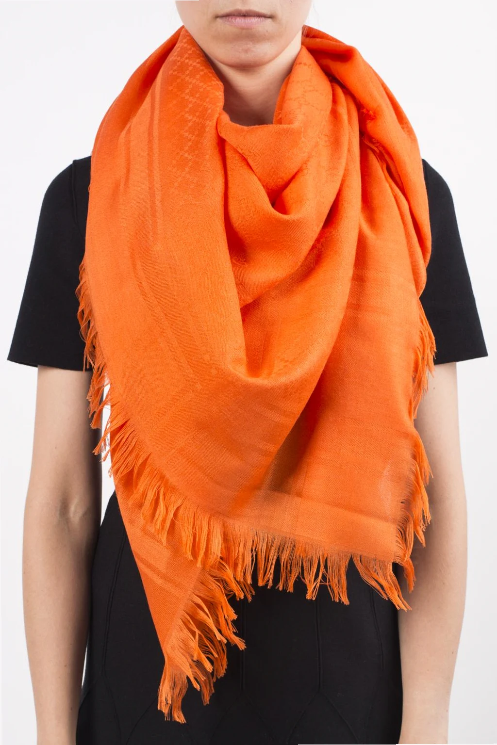 Chusta Gucci w kolorze pomarańczowym z jasnopomarańczowym monogramem 'GG' oraz wzorem 'Diamante' na brzegach. Wykończona frędzlami.