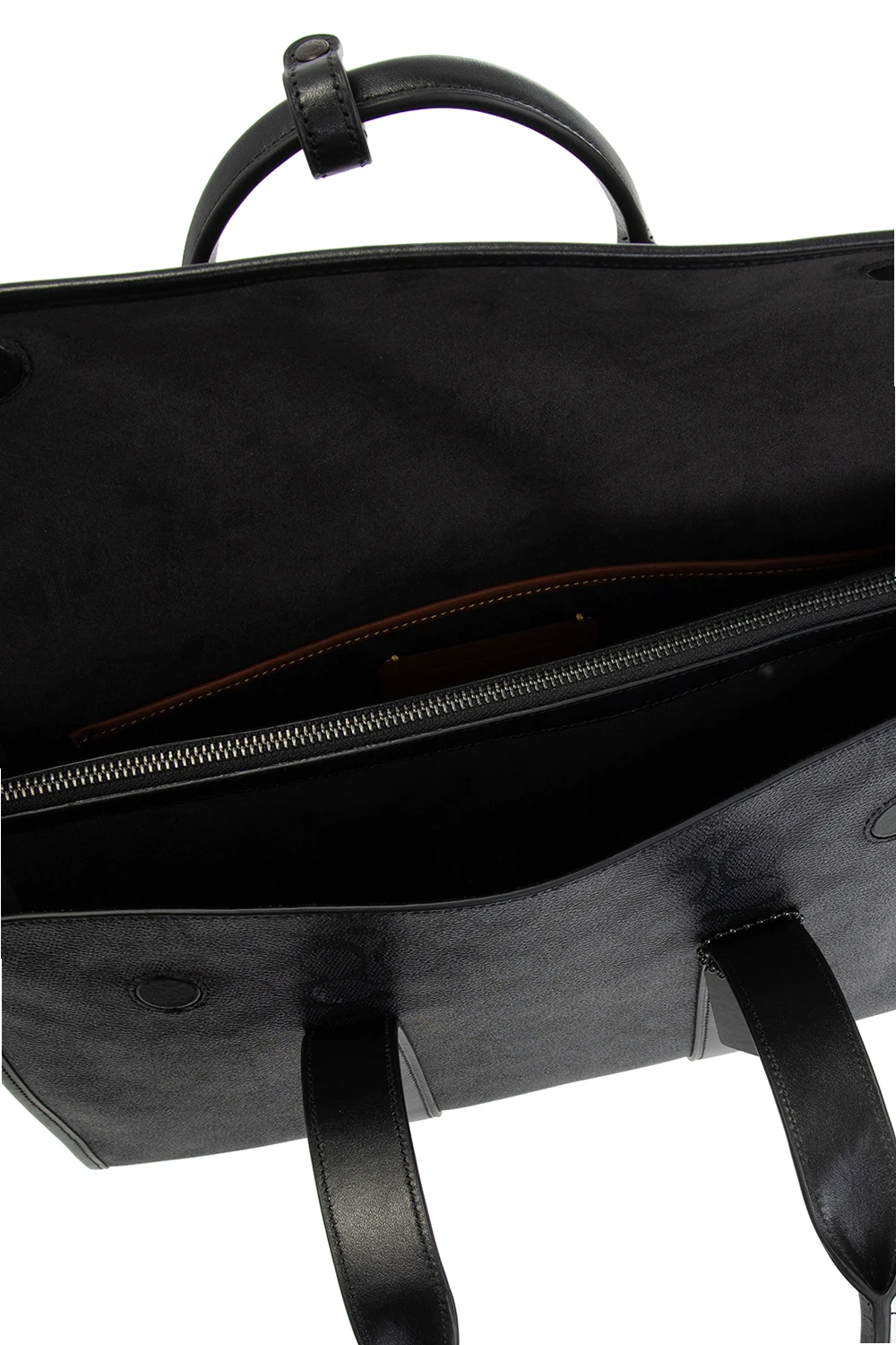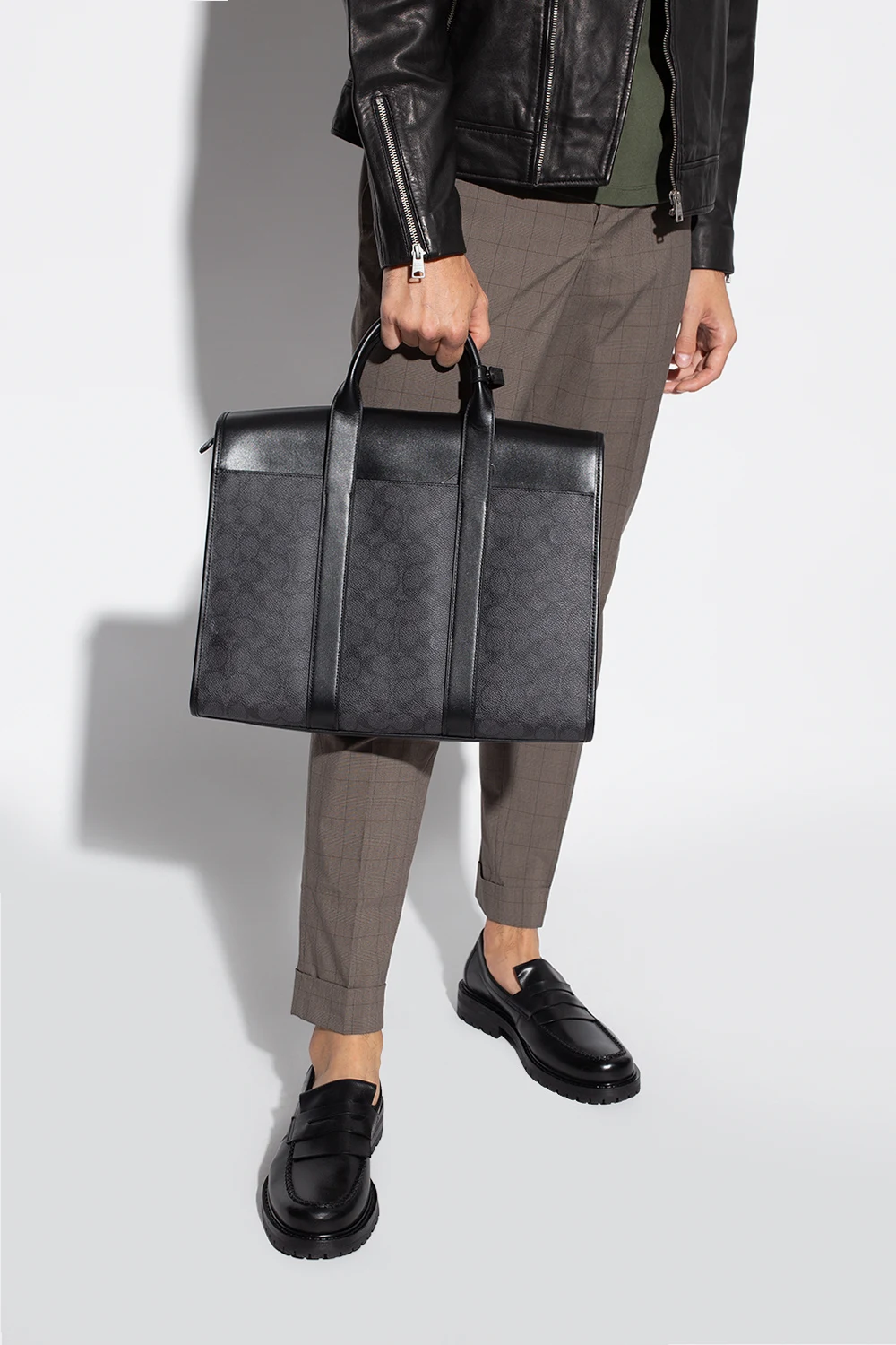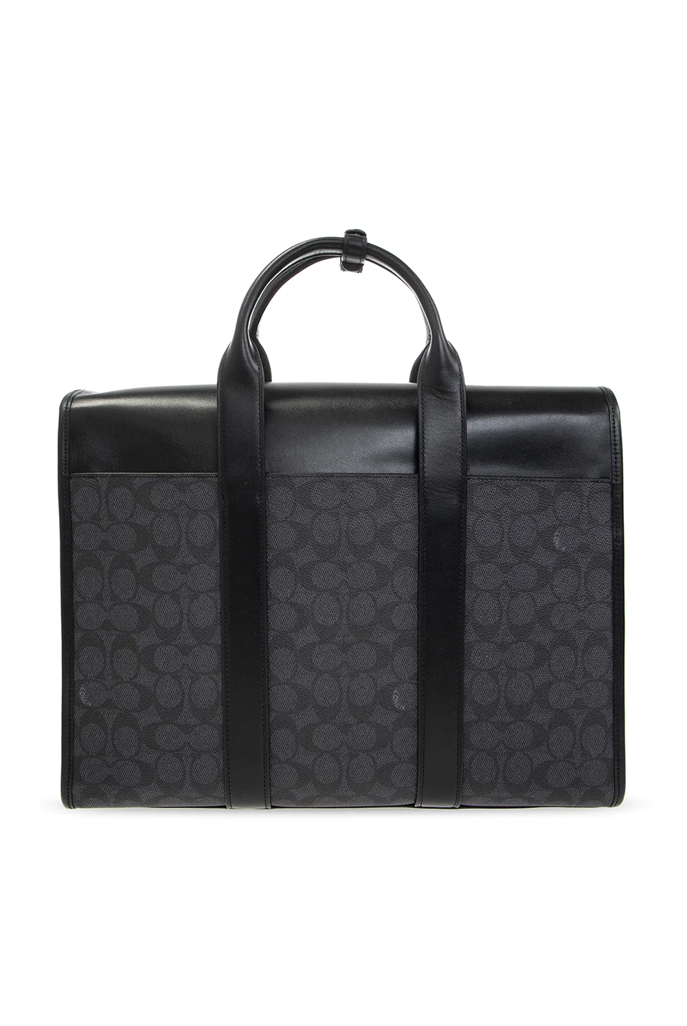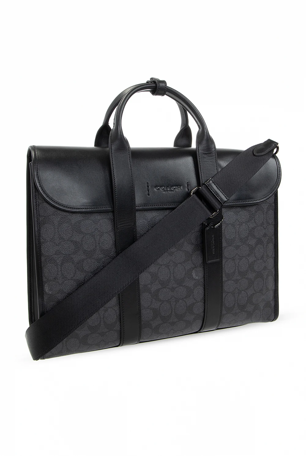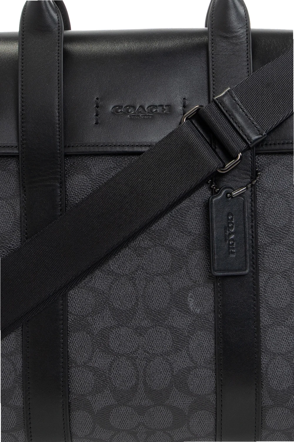 Czarno-granatowa aktówka, model ‘Gotham’ Coach. Wykonana z płótna ozdobionego nadrukowanym logo. Wykończona skórą. Zamykana na magnetyczne zapięcia. Z przodu wytłoczone logo. Z tyłu wsuwana kieszeń. Dwie półokrągłe rączki. Odpinany, regulowany pasek. Wewnątrz trzy oddzielne komory, jedna zamykana na zamek i wsuwane kieszenie.