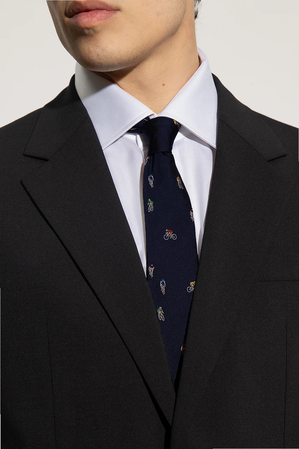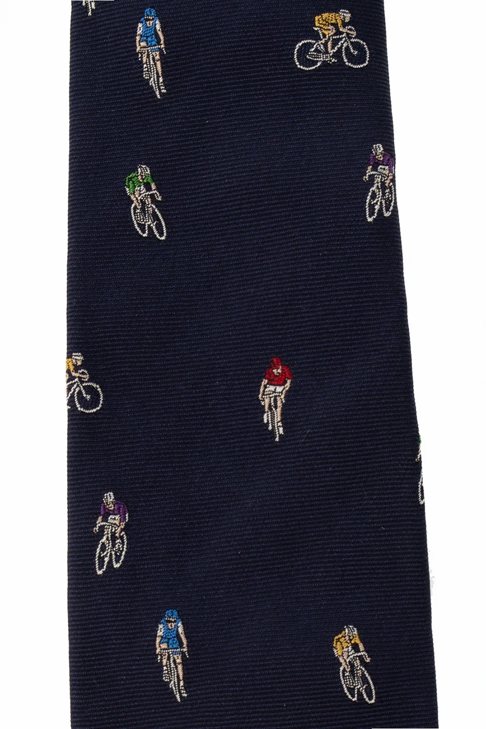 Granatowy, jedwabny krawat Paul Smith. Ozdobiony kolorowo wyszytym wzorem z motywem rowerzysty.