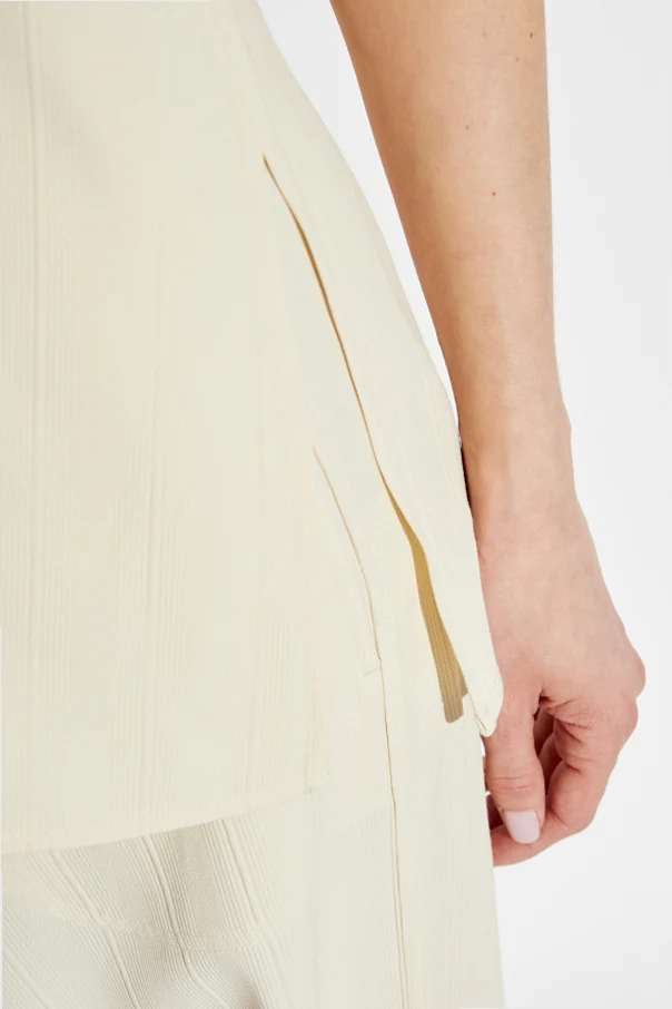 Detale są stonowane, z gładką powierzchnią i bocznymi rozcięciami, które dodają swobody ruchu. Zapięcie z tyłu na zamek oraz guziki ułatwiają zakładanie. Kremowy kolor sprawia, że top jest uniwersalny i łatwy do dopasowania do różnych stylizacji, zarówno eleganckich, jak i casualowych.