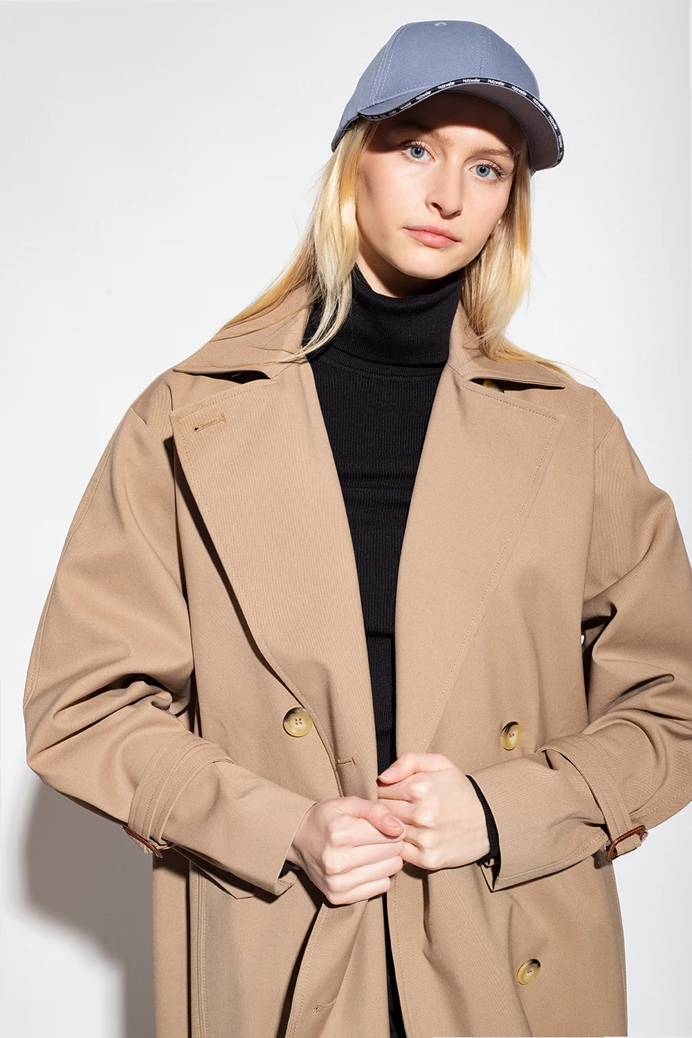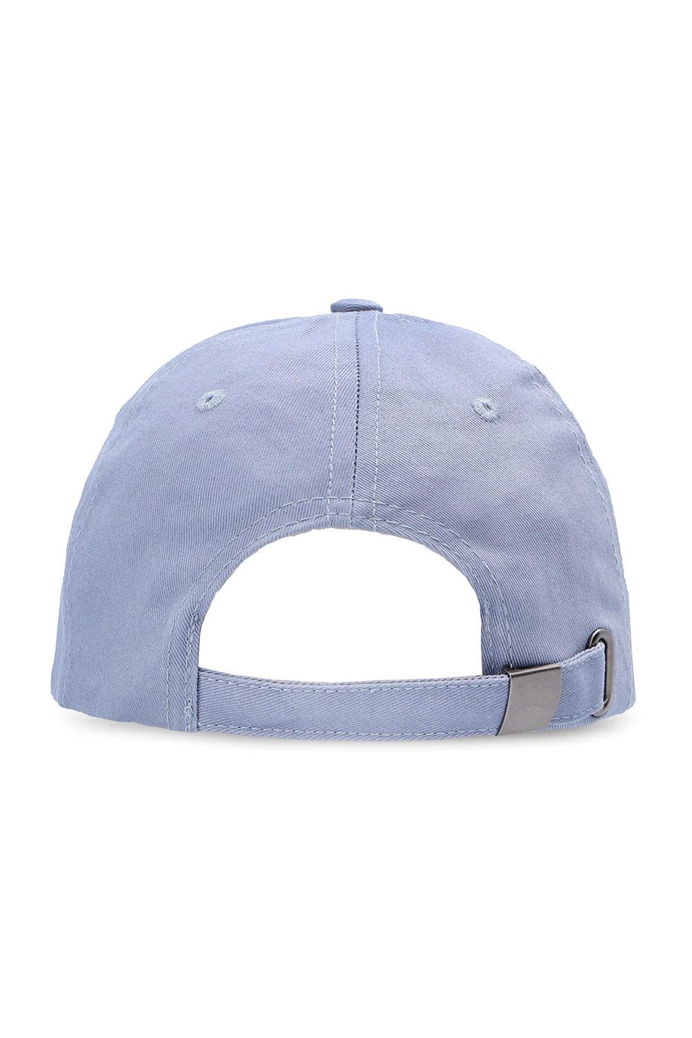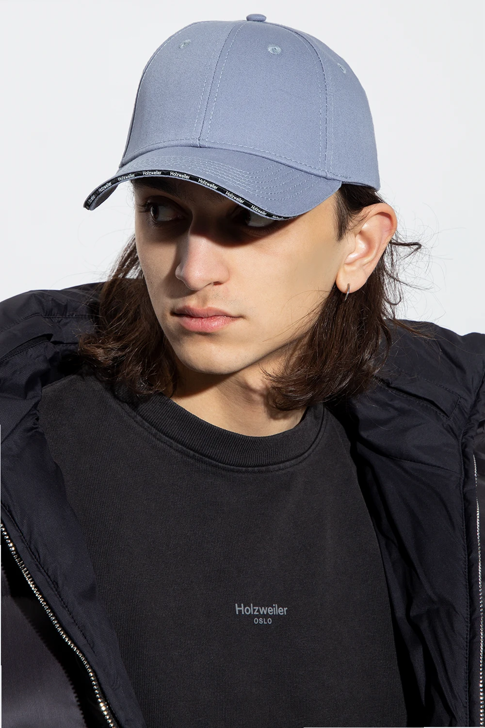 Niebieska czapka z daszkiem Holzweiler. Wykonana z bawełny. Ozdobiona wzorem z logo w kolorze białym. Z tyłu regulowana na pas z klamrą.