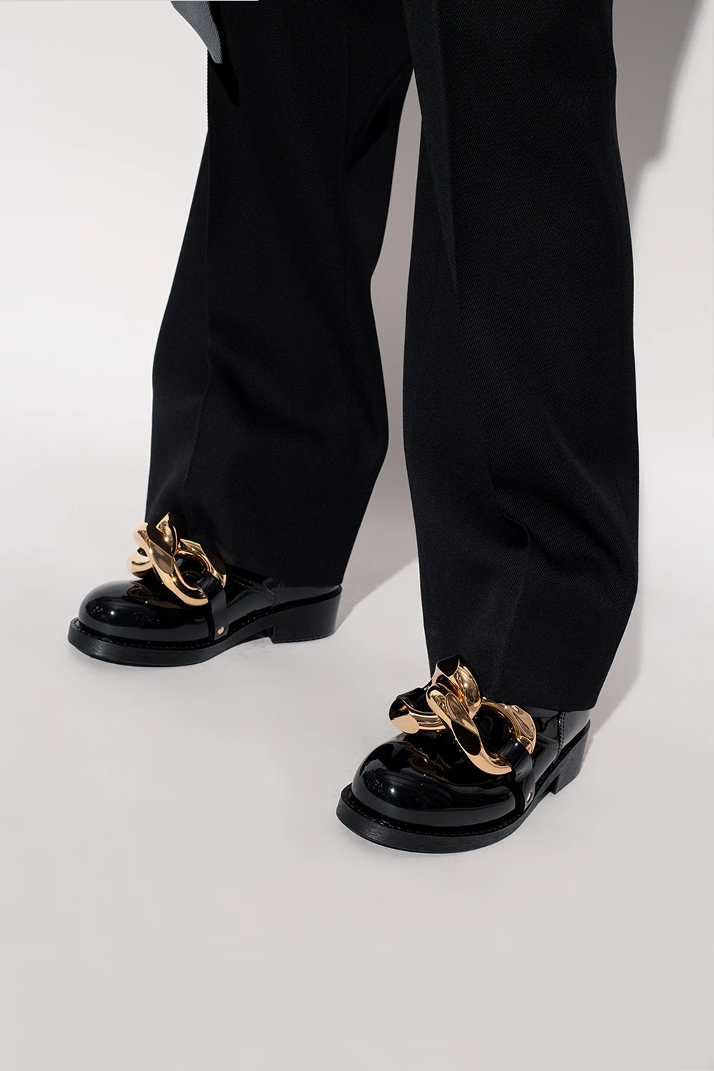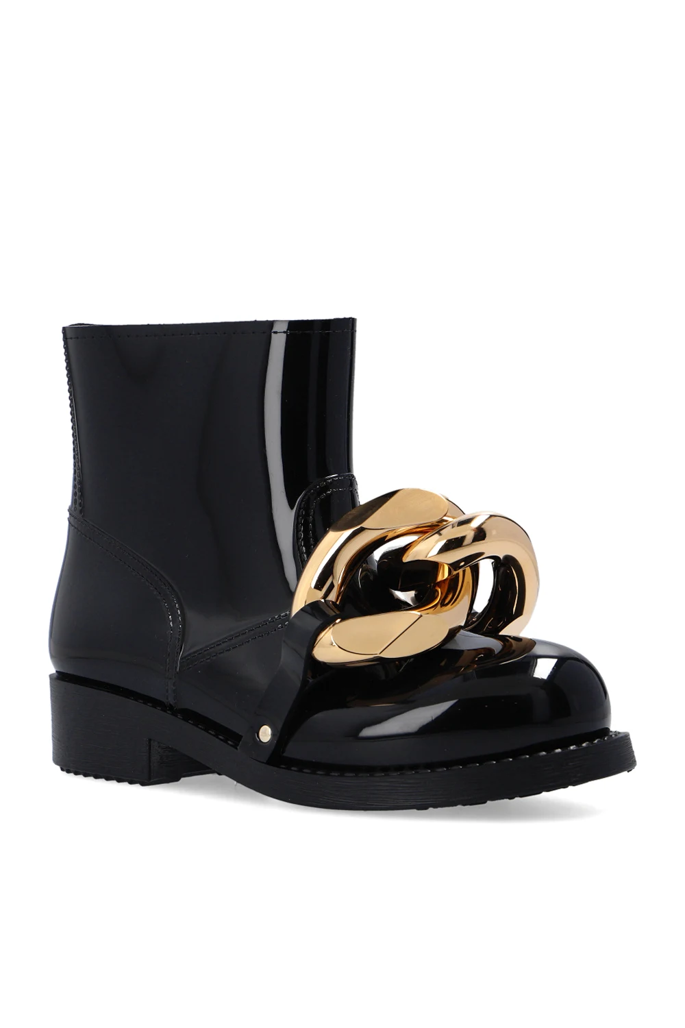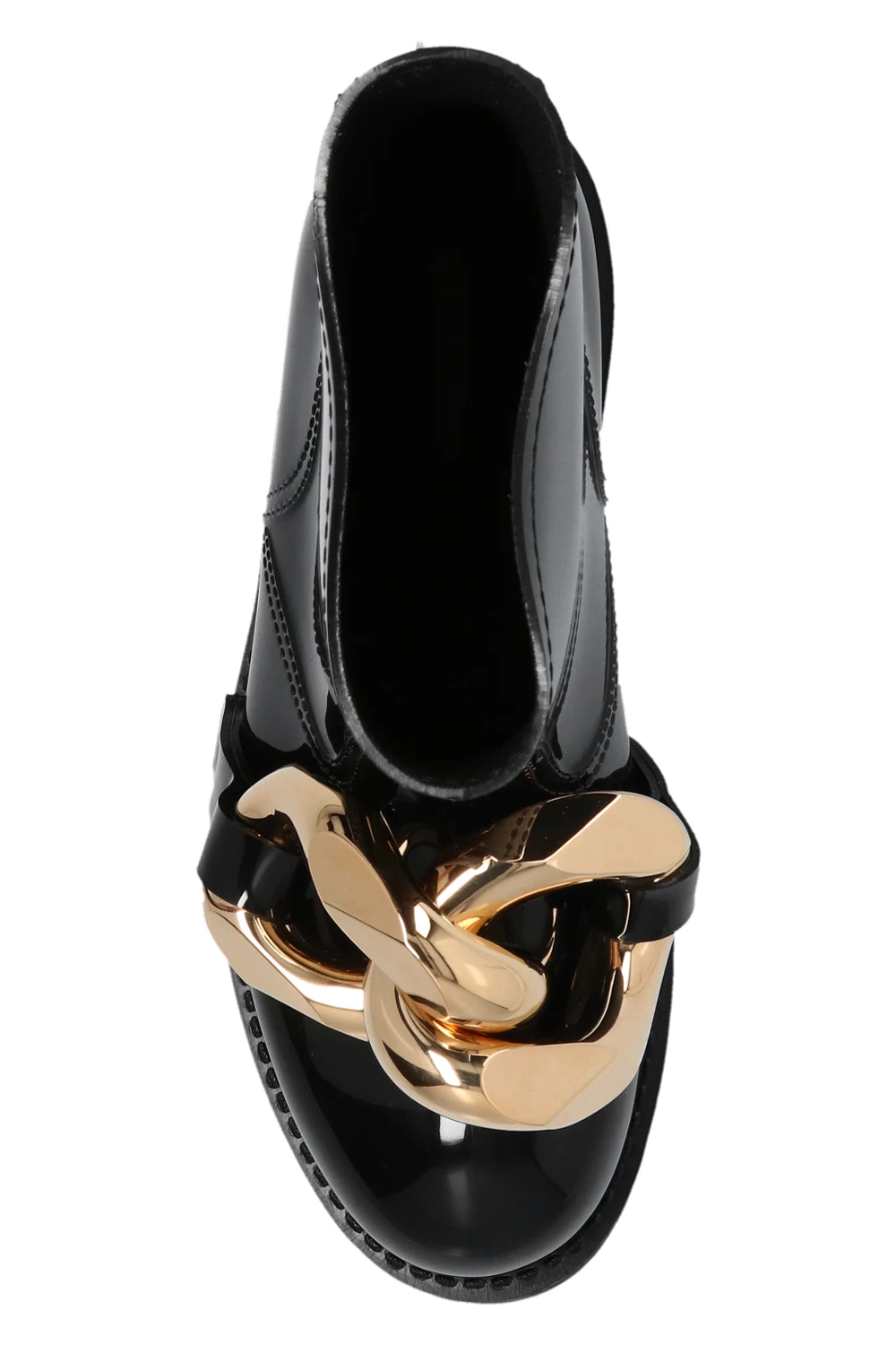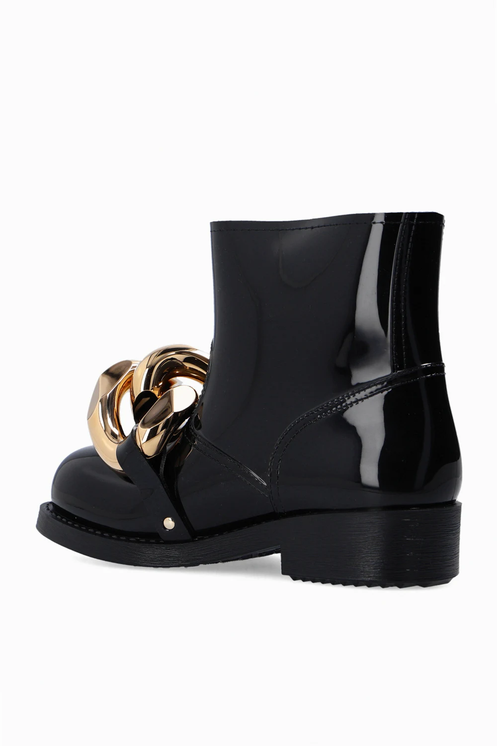 Czarne, krótkie kalosze JW Anderson. Z przodu metalowa aplikacja w kształcie ogniw łańcucha w kolorze złotym. Gumowa podeszwa w kolorze czarnym.