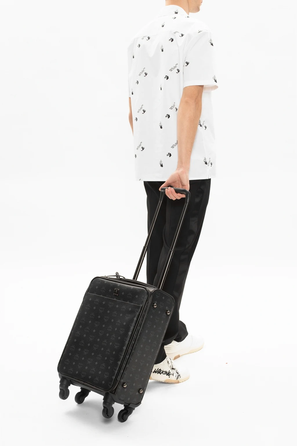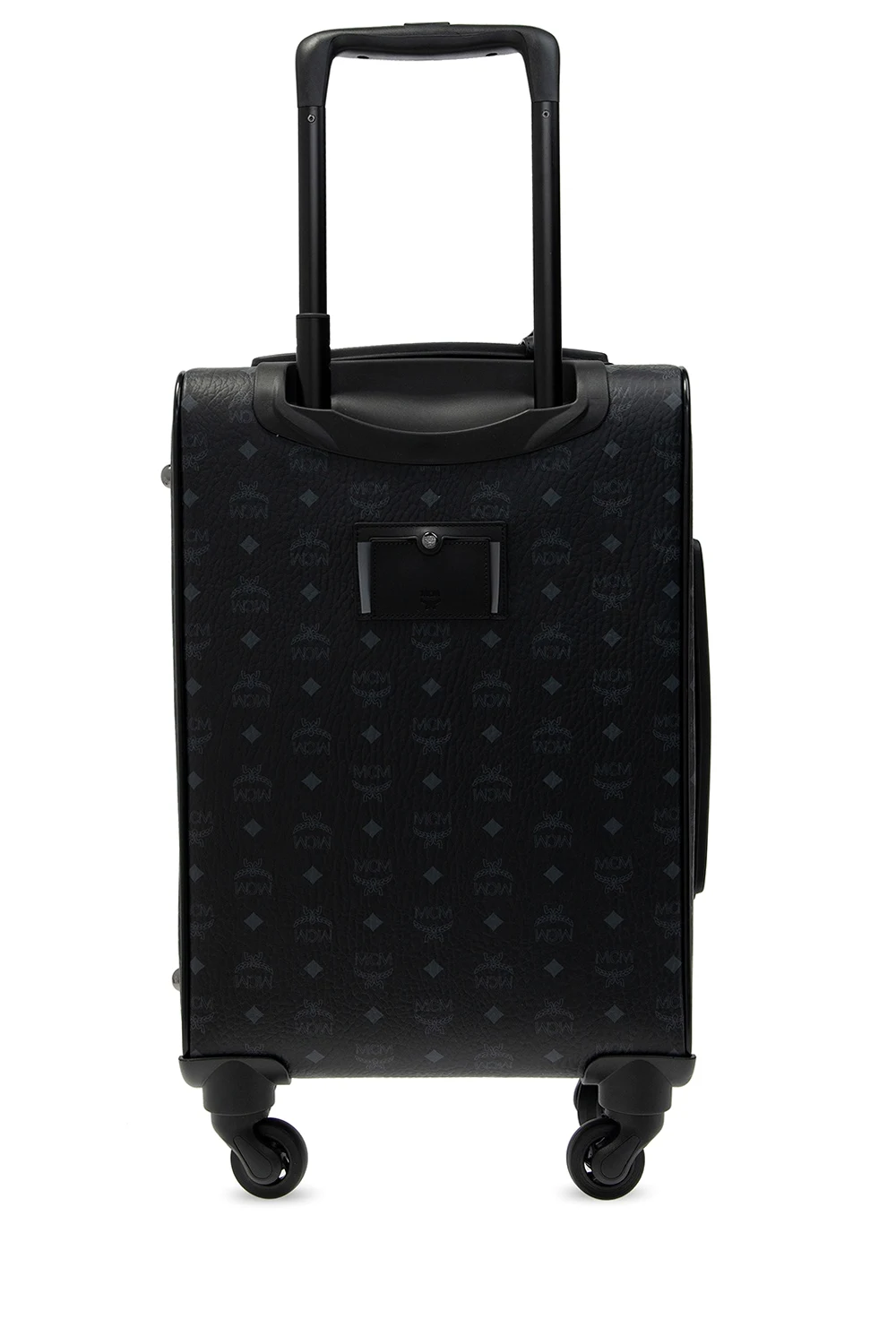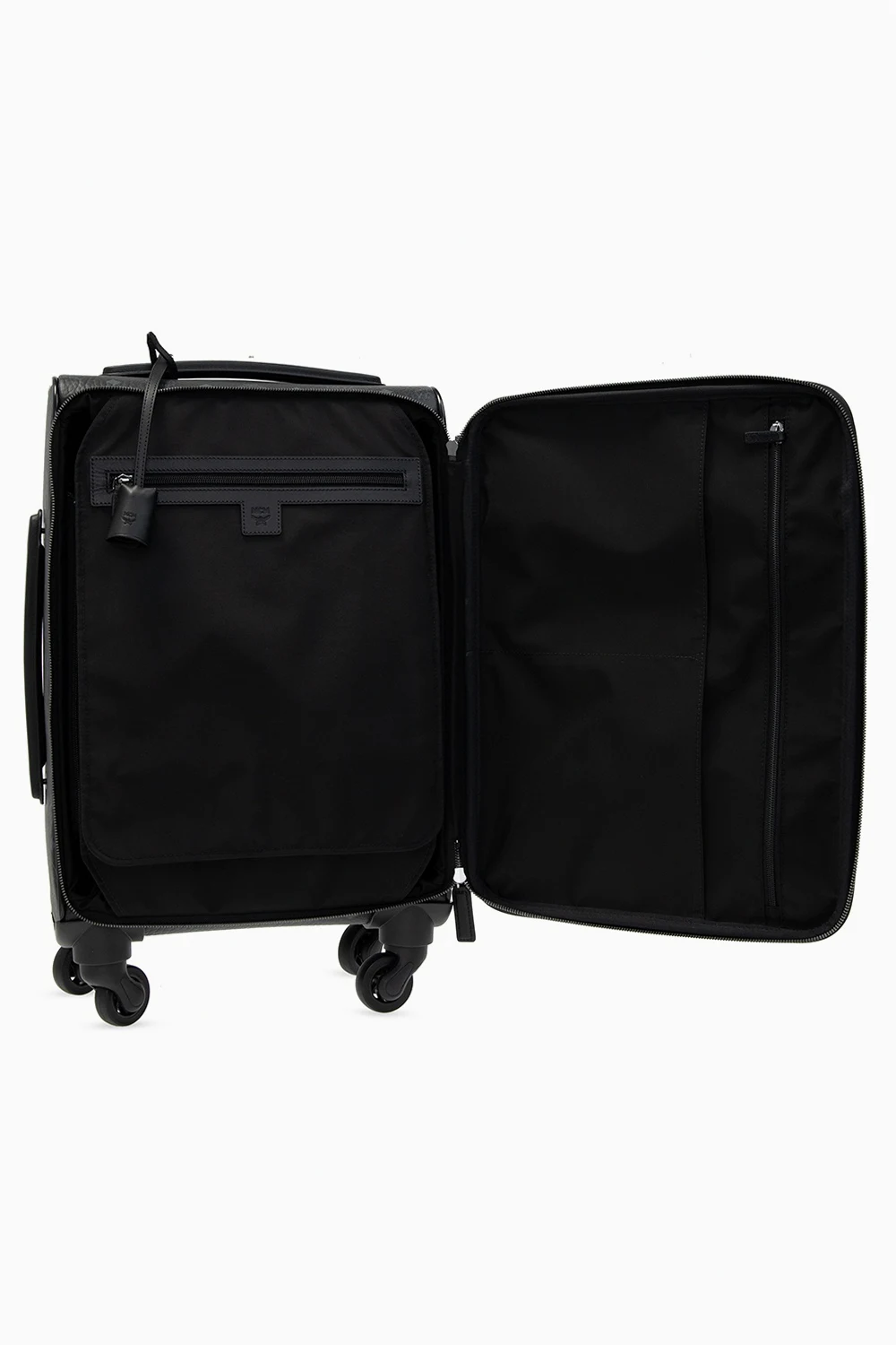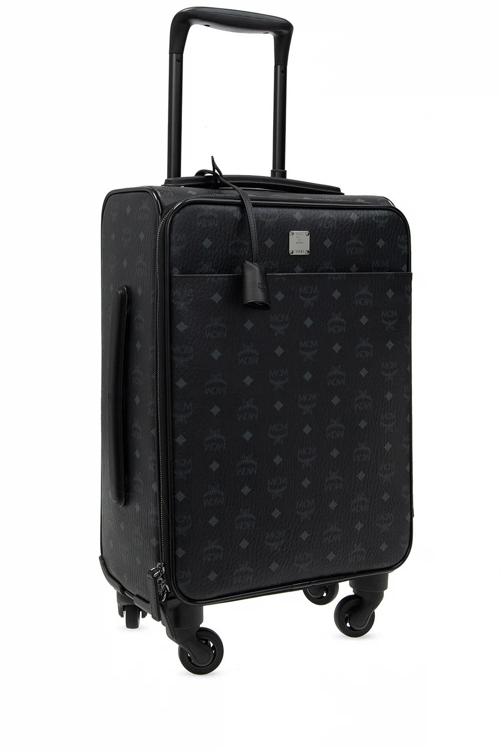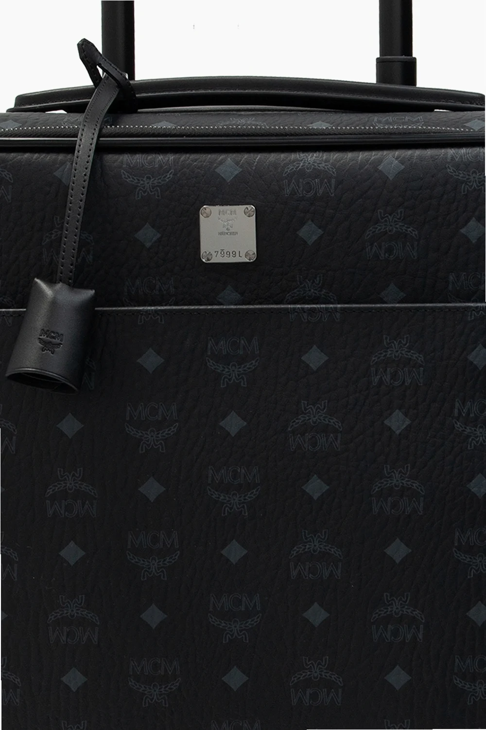 Czarna walizka MCM. Wykonana z płótna i skóry. Zamykana na dwubiegunowy zamek z dołączoną zabezpieczającą kłódka na kluczyk. Ozdobiona nadrukiem z logo w kolorze ciemnoszarym. Z przodu przegroda zamykana na zamek oraz metalowa wstawka. Dwie krótkie rączki. Wewnątrz komora, wsuwana przegroda oraz trzy kieszenie zamykane na zamek. Cztery obrotowe kółka. Dołączone etui na walizkę. Metalowe wykończenie w kolorze ciemnoszarym.