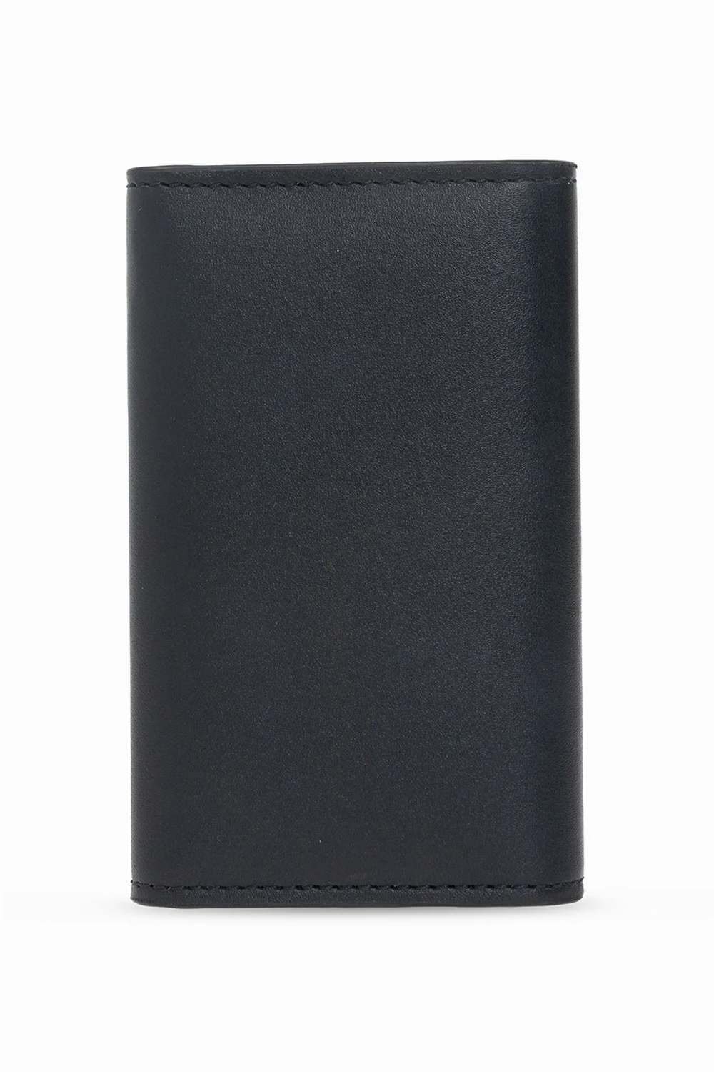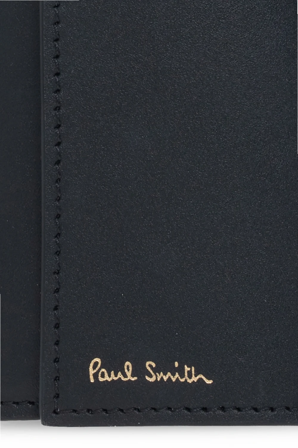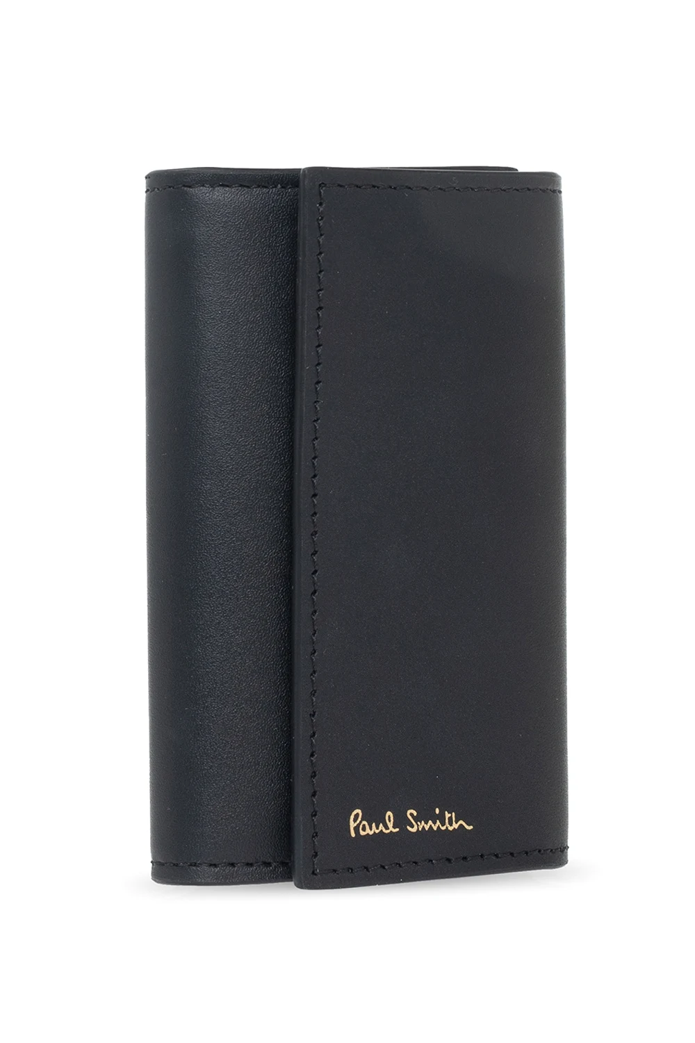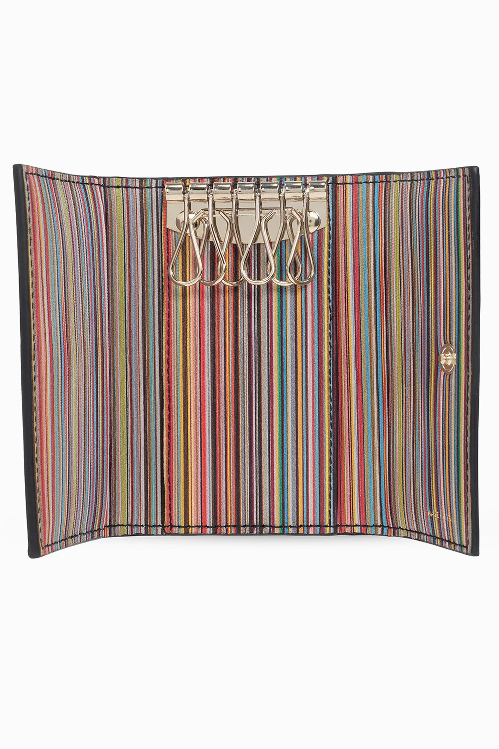 Czarne, skórzane etui na klucze Paul Smith. Zamykane na zatrzask. Ozdobione logo w kolorze złotym. Wewnątrz nadrukowany wzór ‘Signature Stripe’. Wsuwana kieszeń oraz sześć uchwytów na klucze.