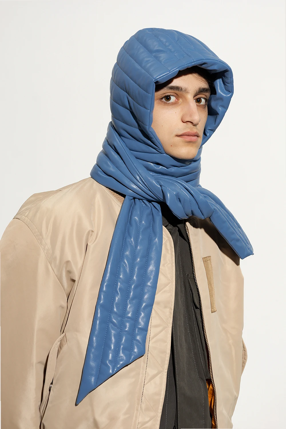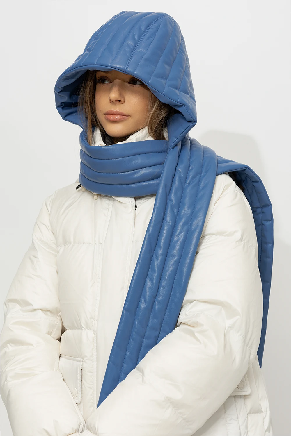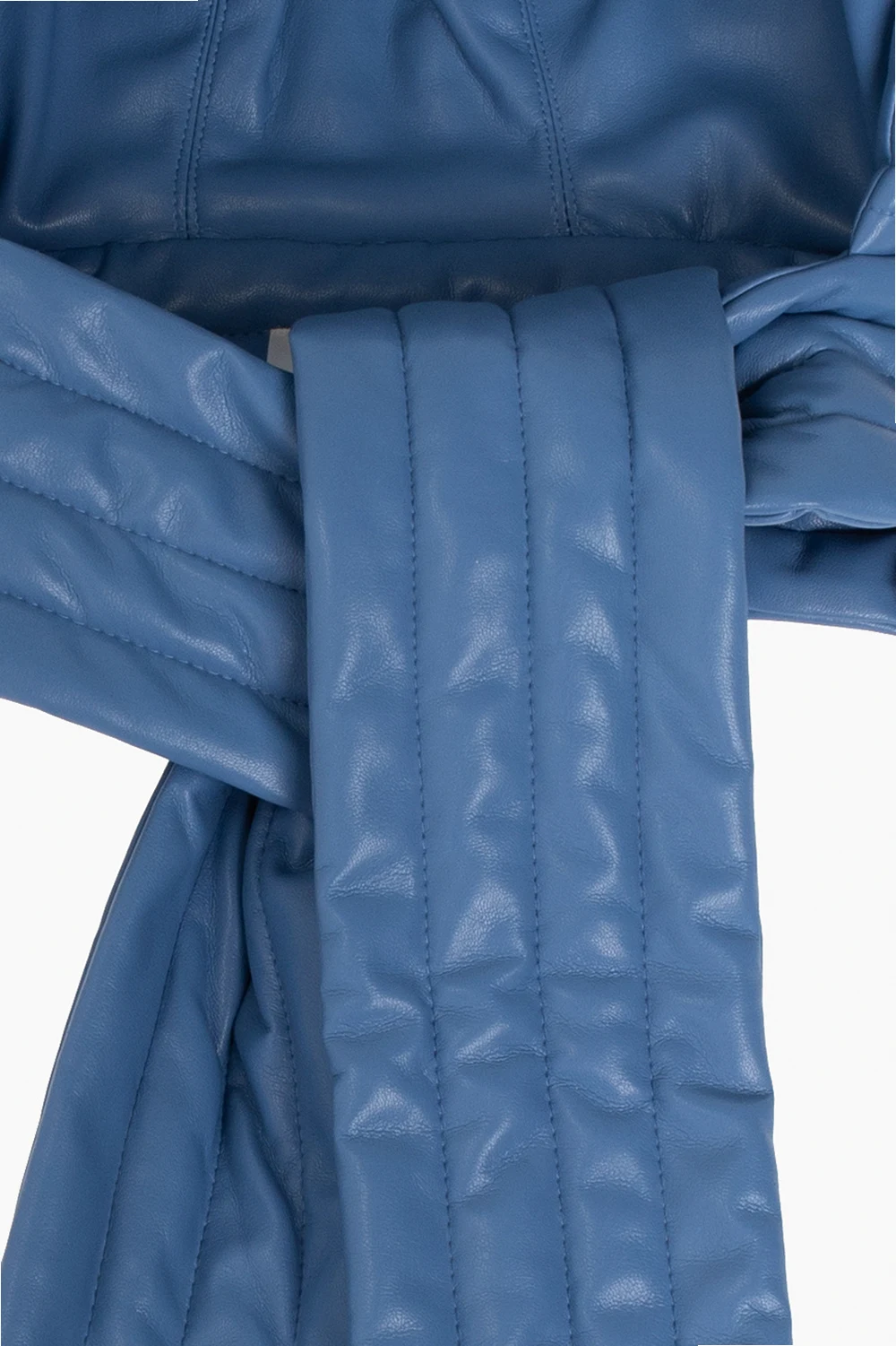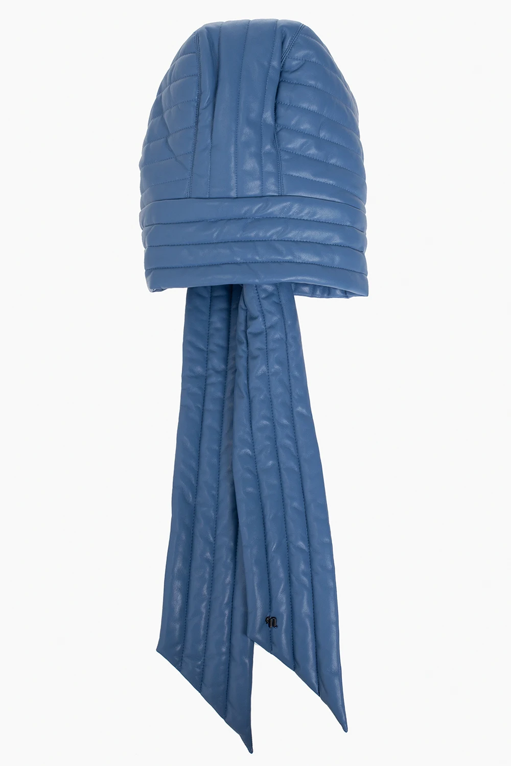Niebieski, pikowany kaptur, model ‘Hill’ Nanushka. Wykonany z charakterystycznej dla marki skóry wegańskiej OKOBOR™. Wiązany pod szyją.