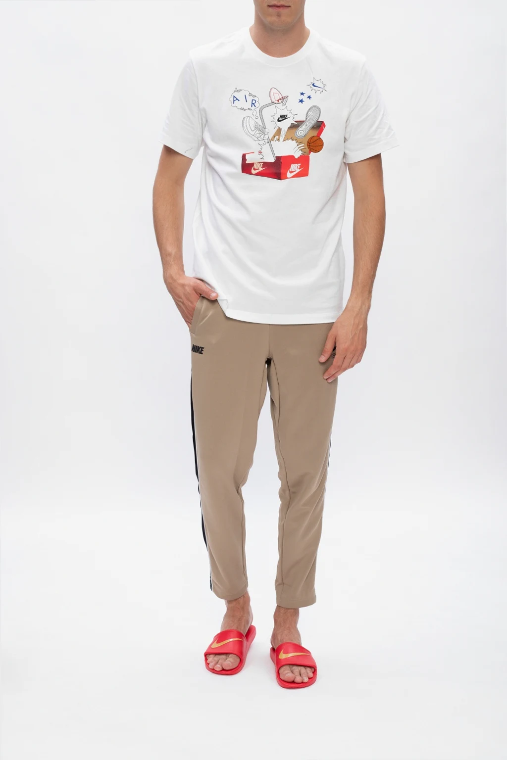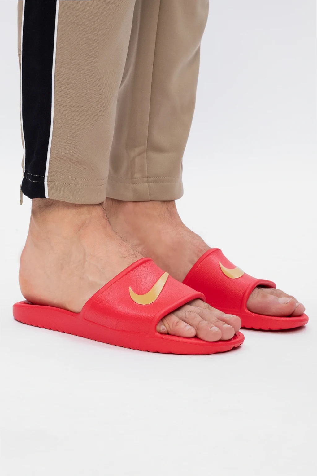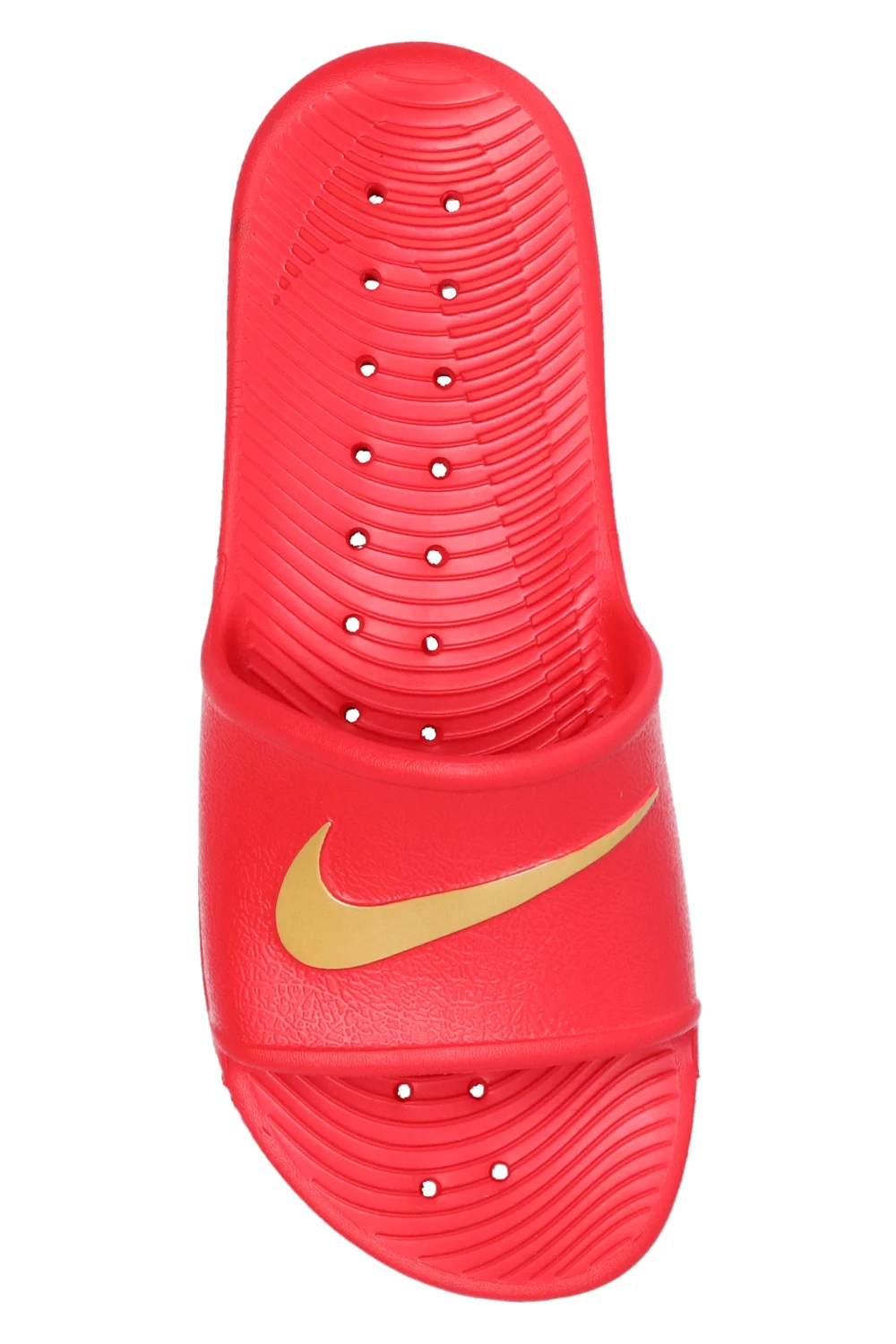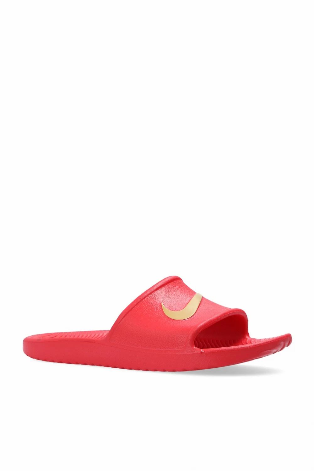 Czerwone klapki, model ‘Kawa Shower’ Nike. Wypukła aplikacja z logo w kolorze złotym. Teksturowana wkładka Solarsoft zapewniająca komfort. Podeszwa zewnętrzna z elastycznej pianki zapewniającej lekkość i wygodę. Stworzone z myślą, aby pomóc stopom odpocząć po intensywnym treningu.