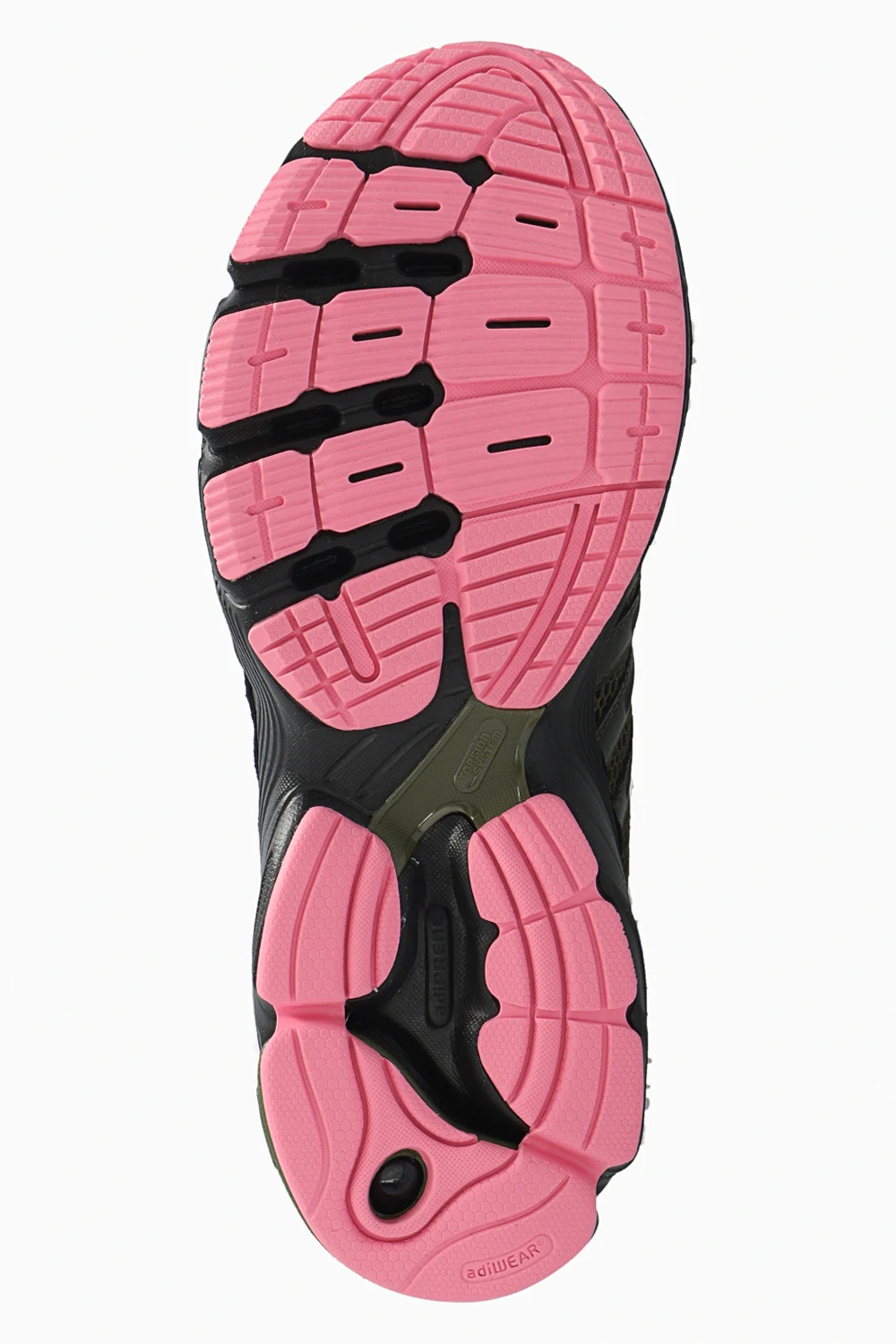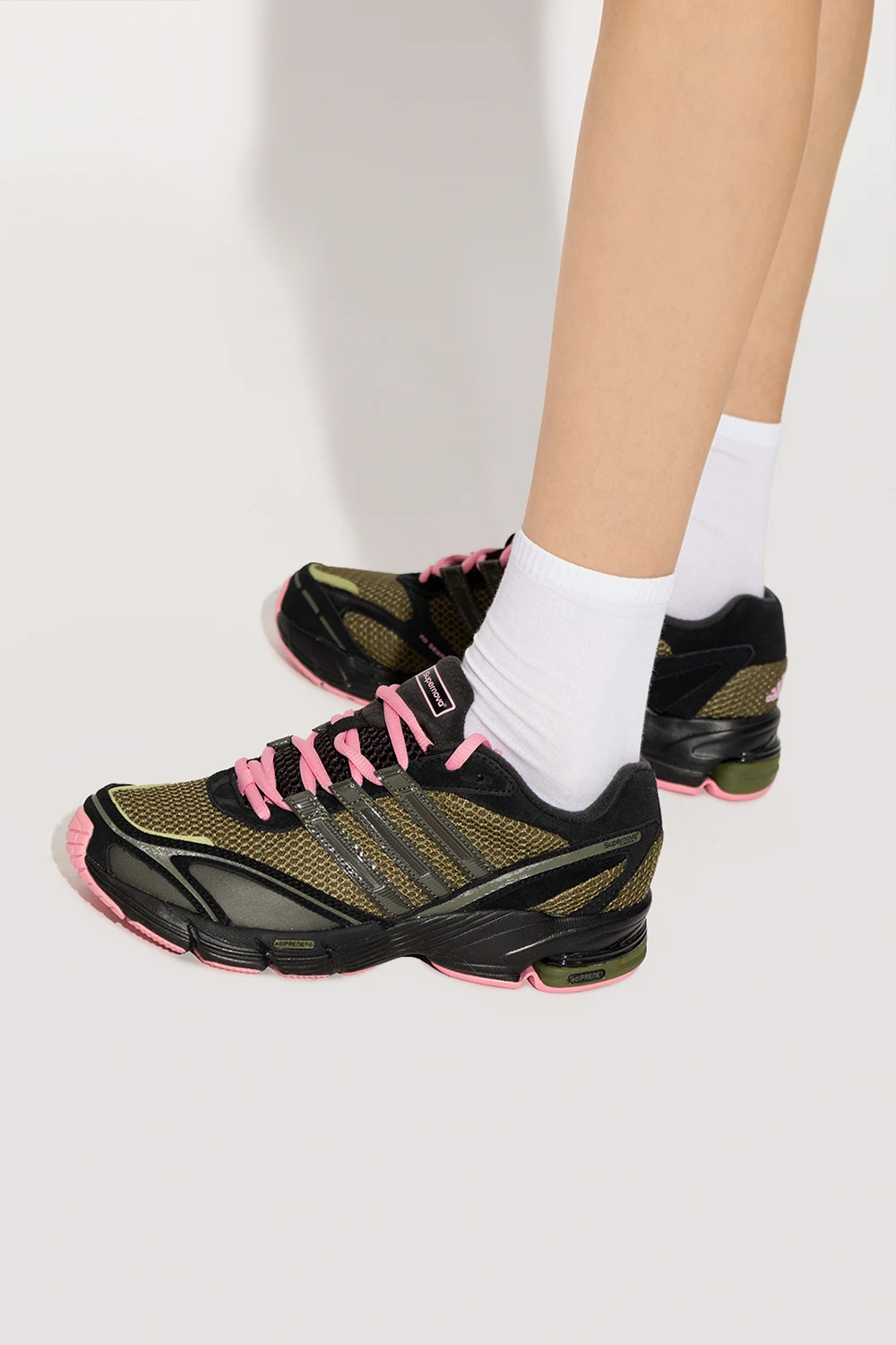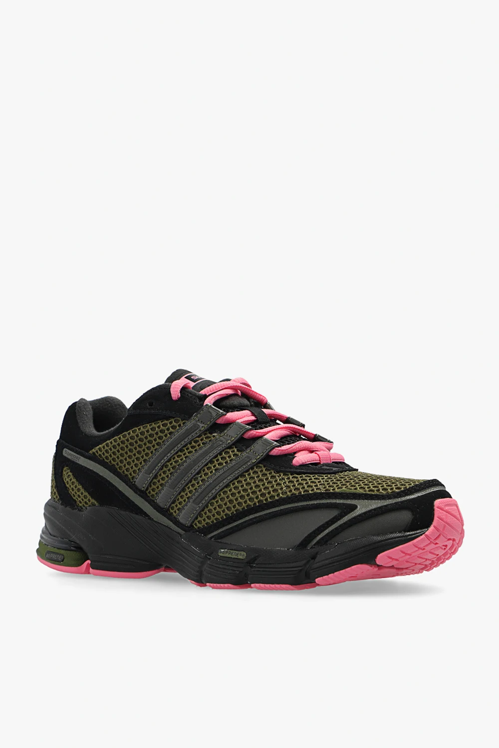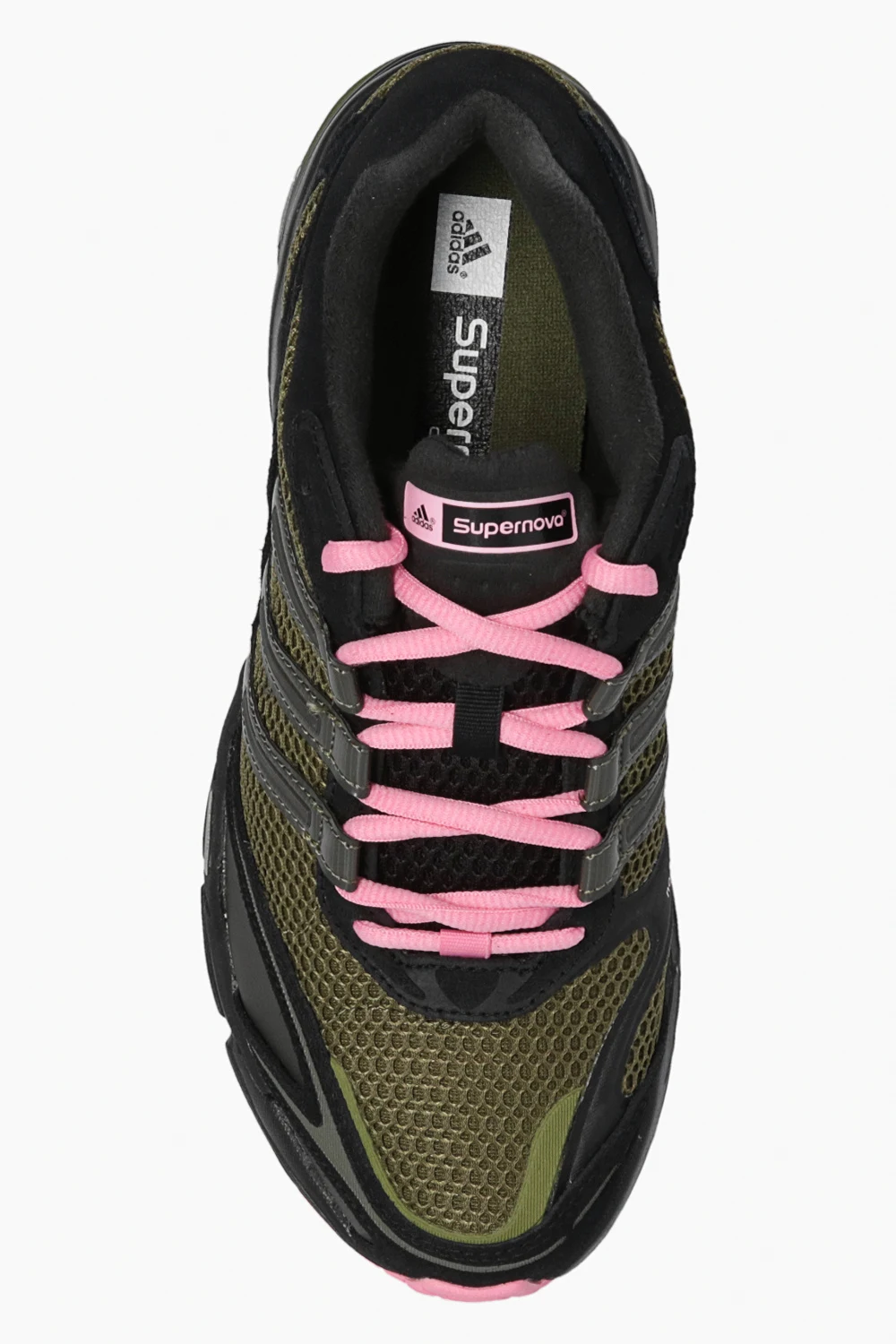 Czarno-zielone, sznurowane buty sportowe, model ‘Supernova Cushion 7 W’ ADIDAS Originals. Częściowo wykonane z materiałów pochodzących z recyklingu. Wykończone skórą. Ozdobione logo i trzema charakterystycznymi paskami. Miękka podeszwa środkowa z pianki EVA, amortyzacja Adiprene i system FORMOTION w pięcie. Różowe sznurowadła. Różowo-czarna, gumowa podeszwa.