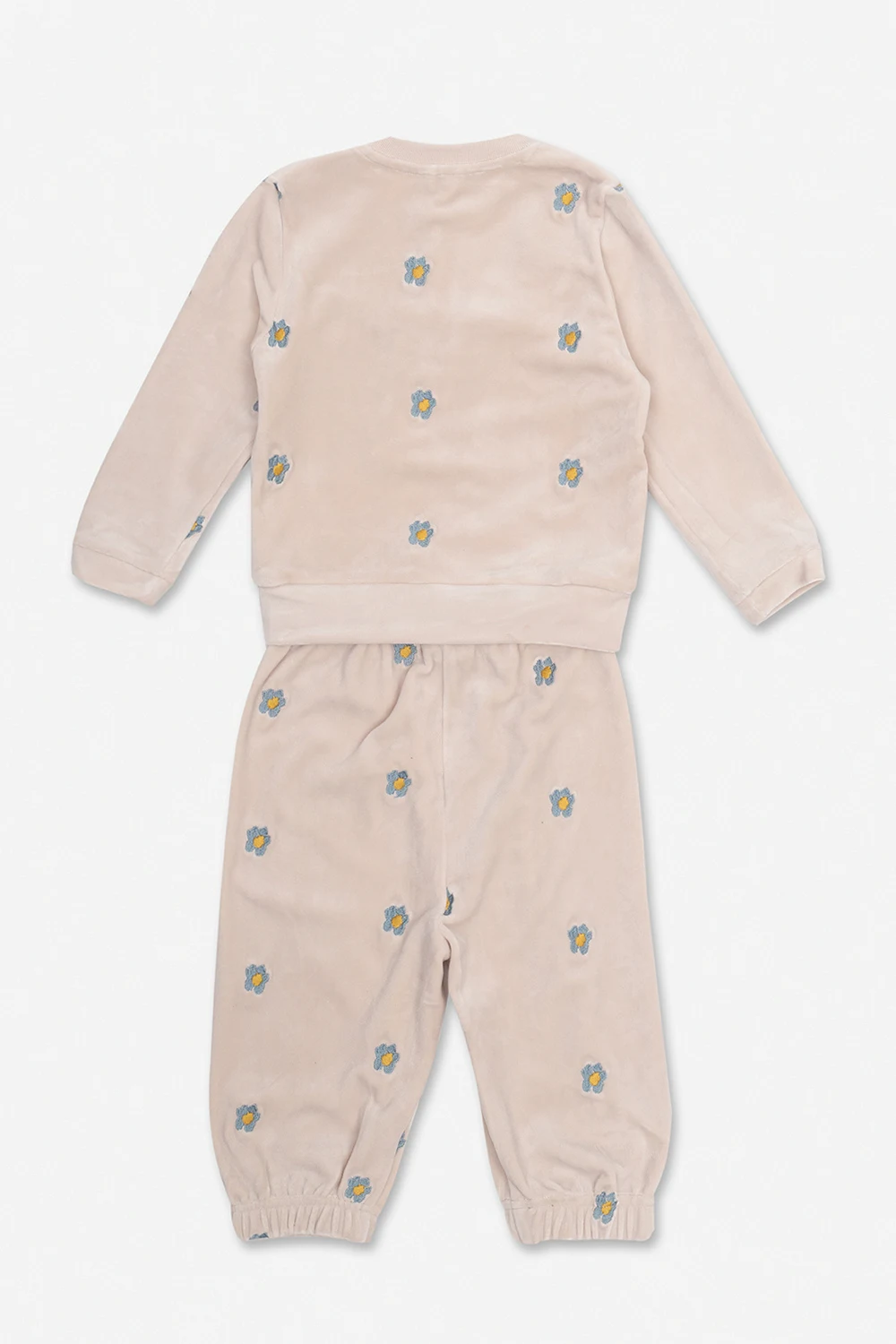 Szarokremowy komplet: bluza i spodnie dresowe Stella McCartney Kids. Ozdobiony wyszytym wzorem z motywem roślinnym. Góra z okrągłym dekoltem oraz długimi rękawami. Dół z gumą w pasie.