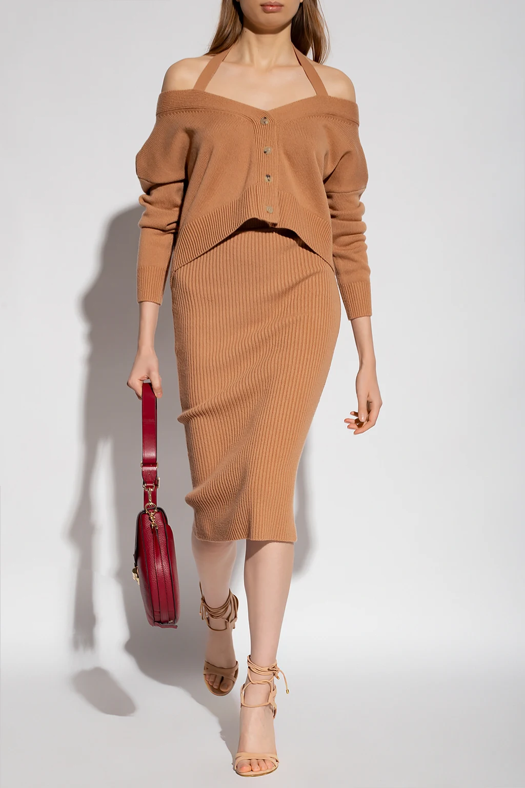 – Jasnobeżowa spódnica maxi marszczona w talii