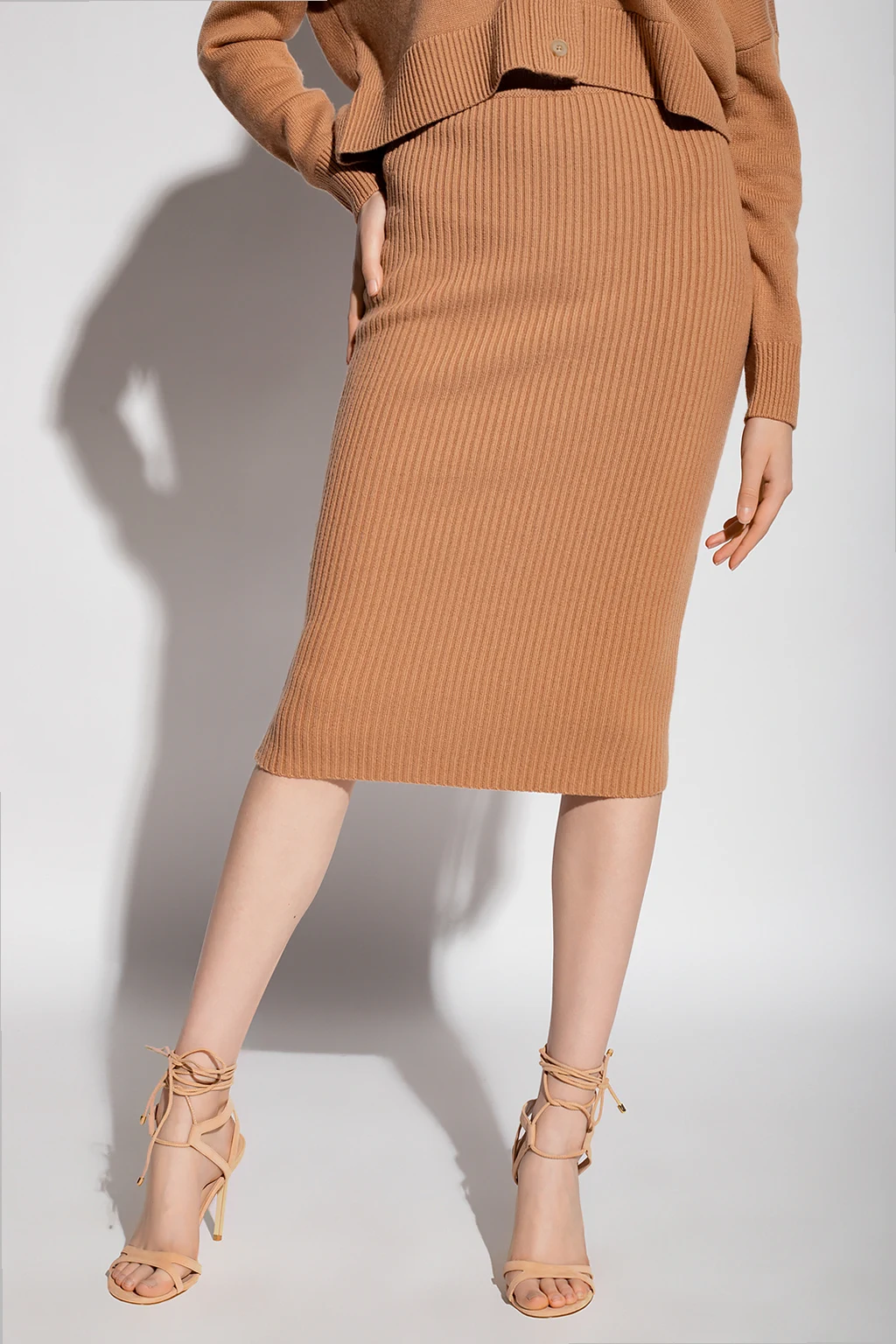 Brązowa, ołówkowa, prążkowana spódnica Michael Kors. Wykonana z kaszmiru. W pasie wszyta guma.