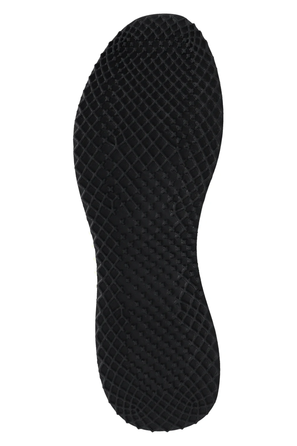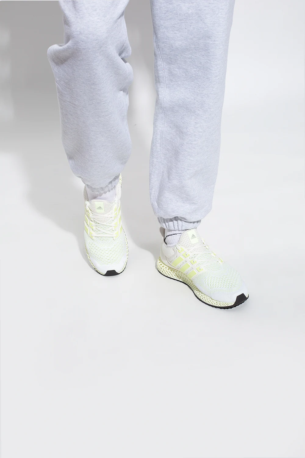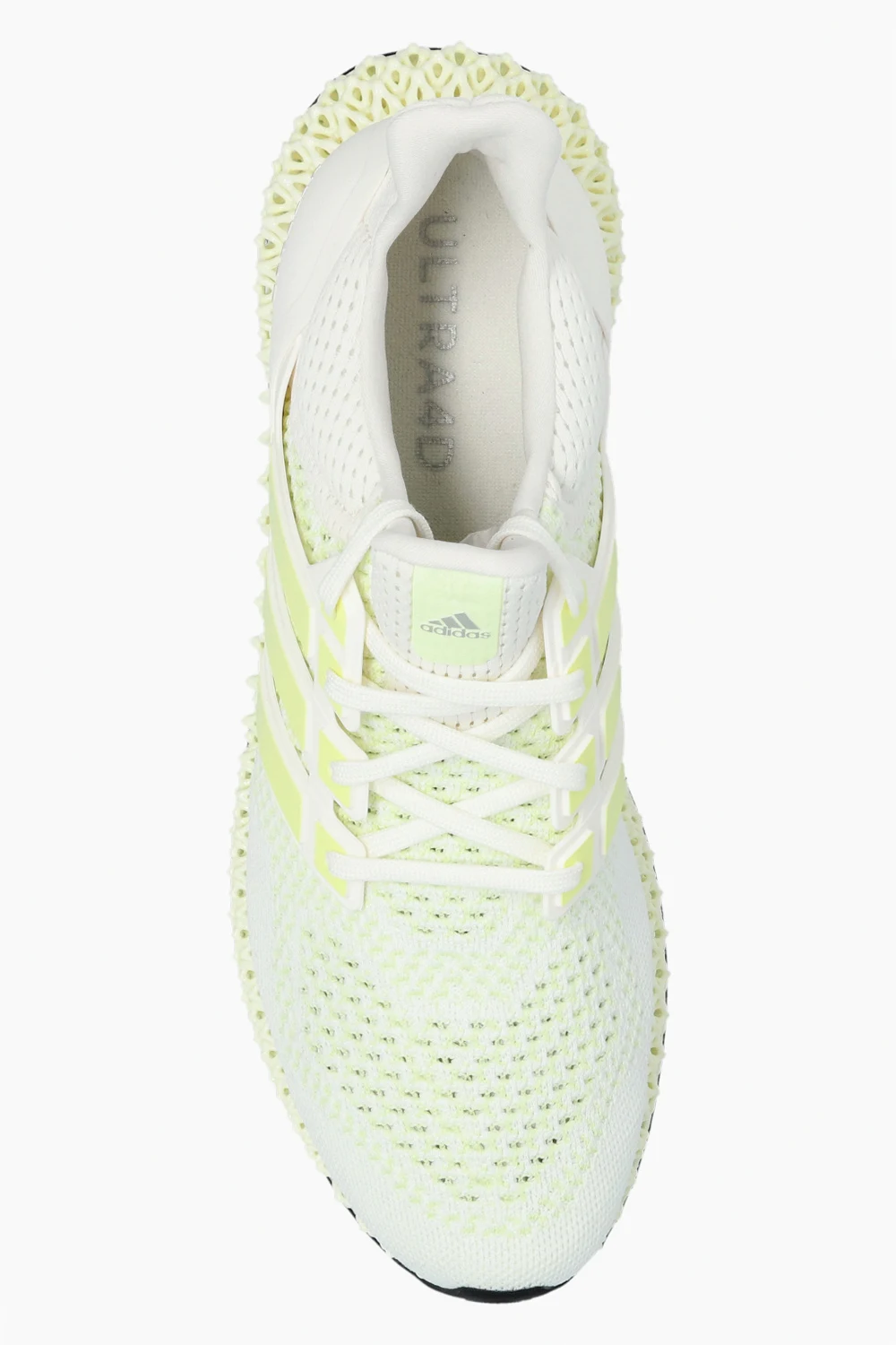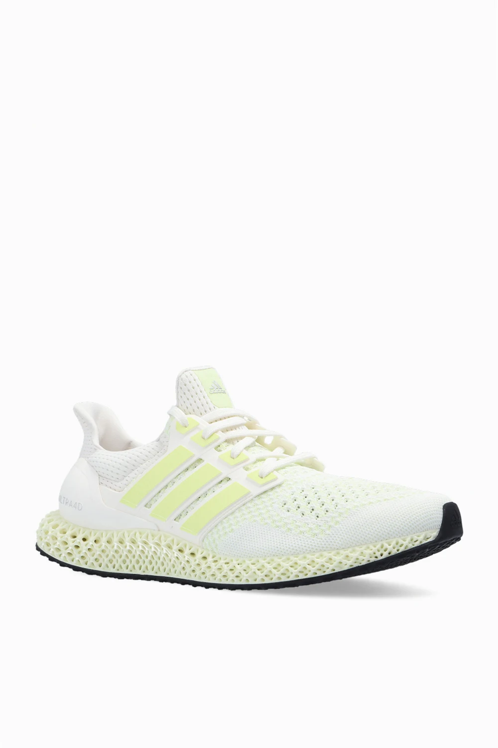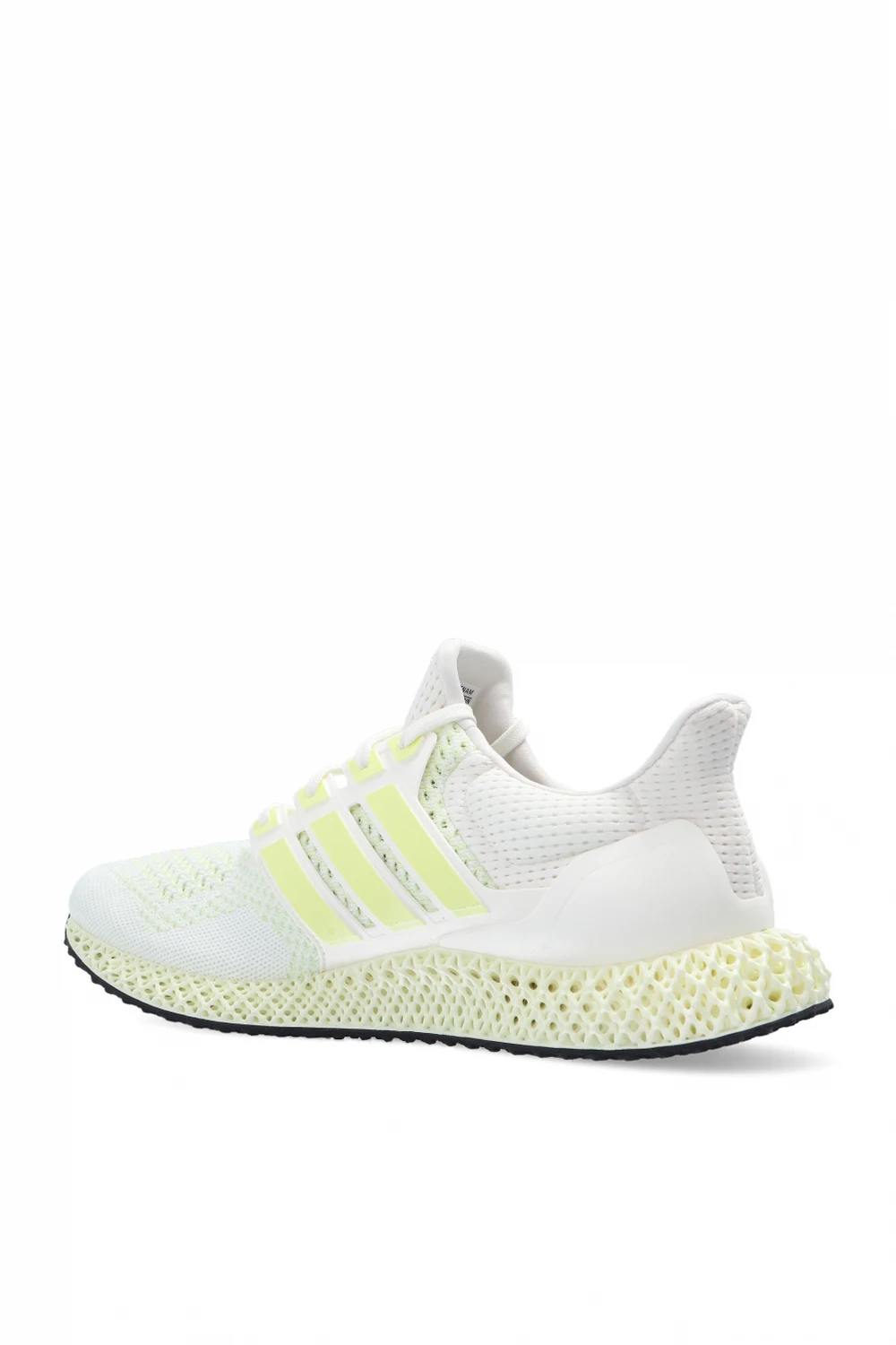 Biało-żółte, sznurowane buty treningowe, model ‘Ultra4D’ ADIDAS Originals. Mają cholewkę adidas ‘Primeknit’, która owija stopę, zapewniając poczucie lekkości i przewiewności. Podeszwa środkowa wydrukowana w 3D ma konstrukcję przypominającą kratownicę z częściami o większym i mniejszym zagęszczeniu, dzięki którym zapewnia amortyzację i wsparcie w strategicznych miejscach. Czarna, gumowa podeszwa.