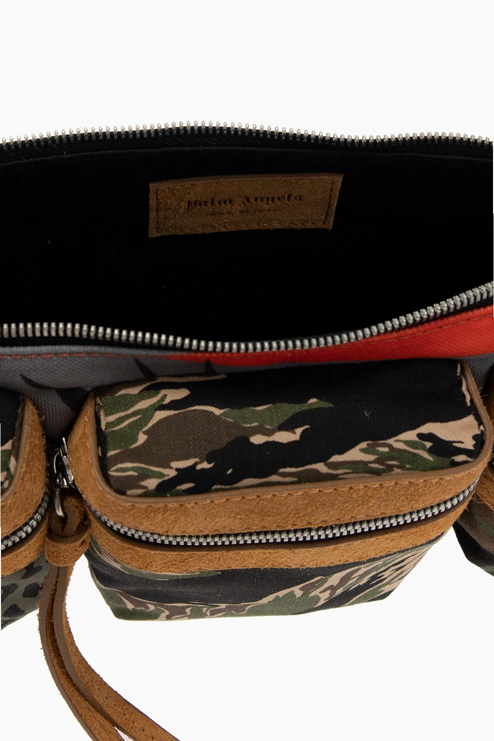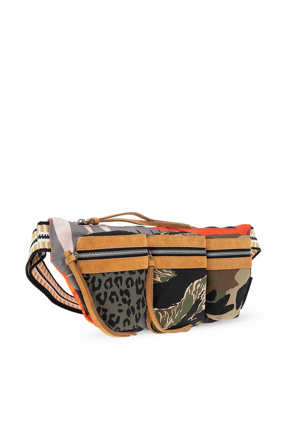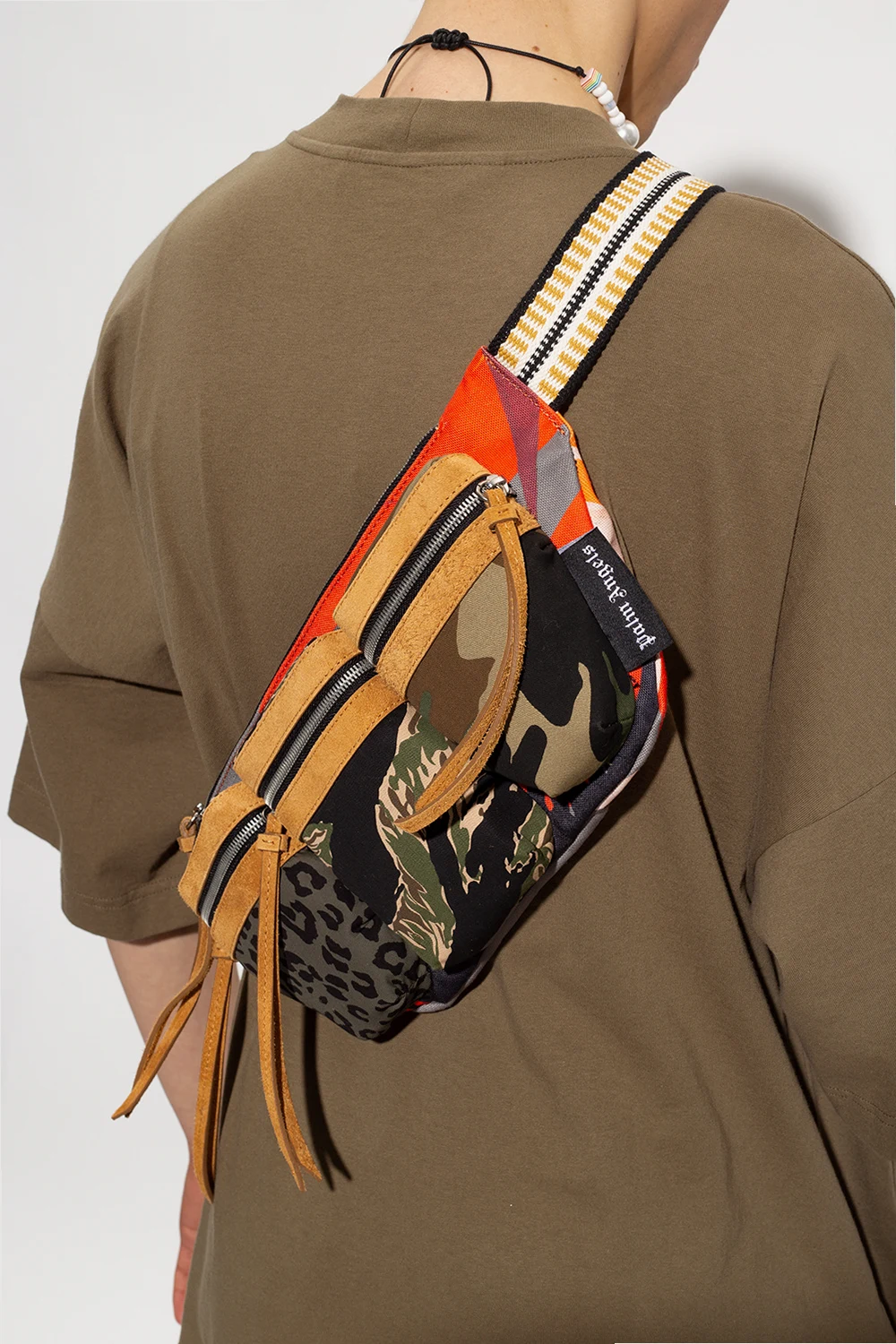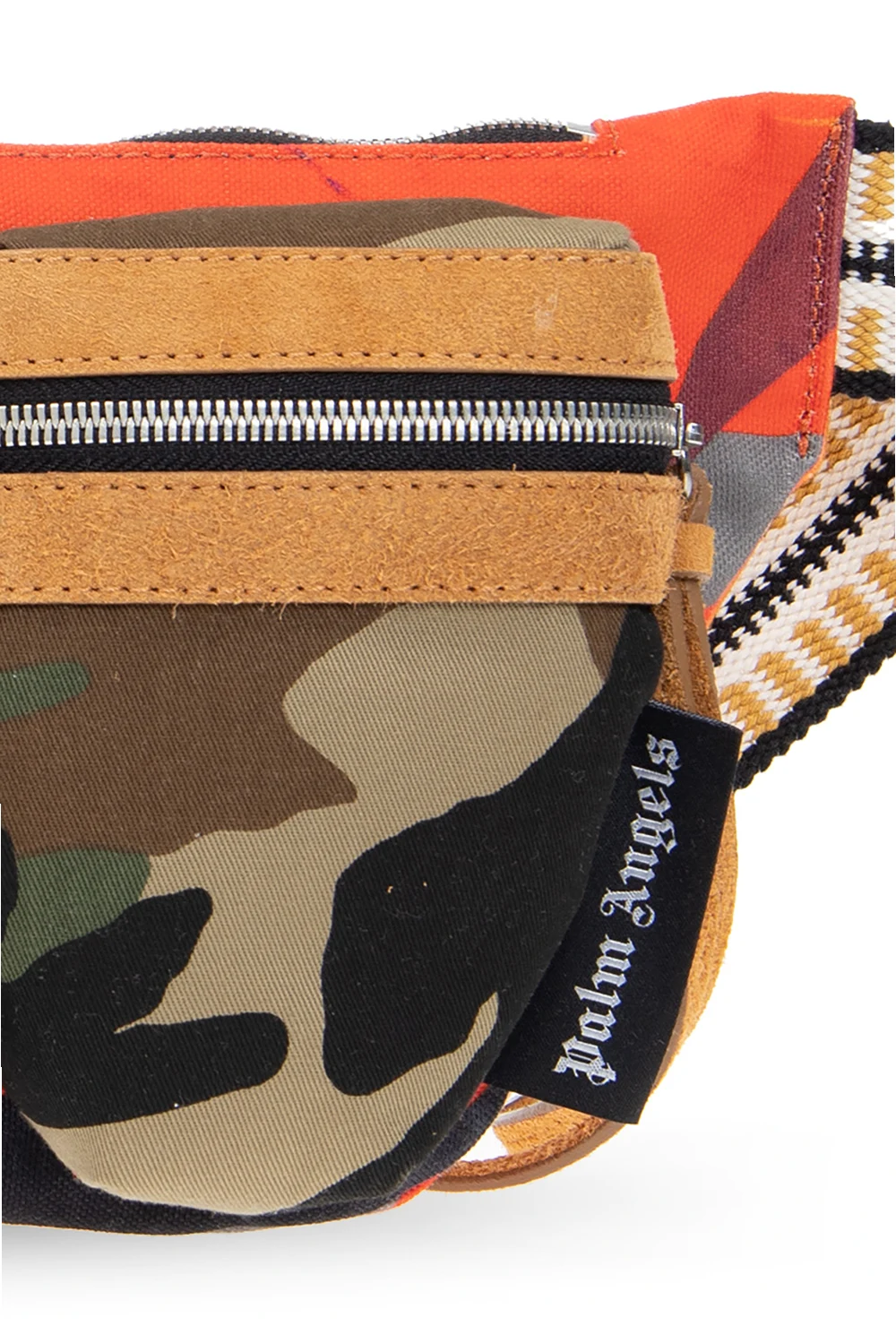 Kolorowa torba na pas z łączonych materiałów Palm Angels. Wykonana z bawełny i wykończona zamszem. Zamykana na zamek. Ozdobiona miksem wzorów z motywami zwierzęcymi oraz ‘moro’. Z przodu trzy kieszenie zamykane na zamek. Materiałowy pas z możliwością regulacji, ozdobiony wyszytym wzorem w kolorze biało-czarno-żółtym. Wewnątrz komora. Metalowe wykończenie w kolorze srebrnym.