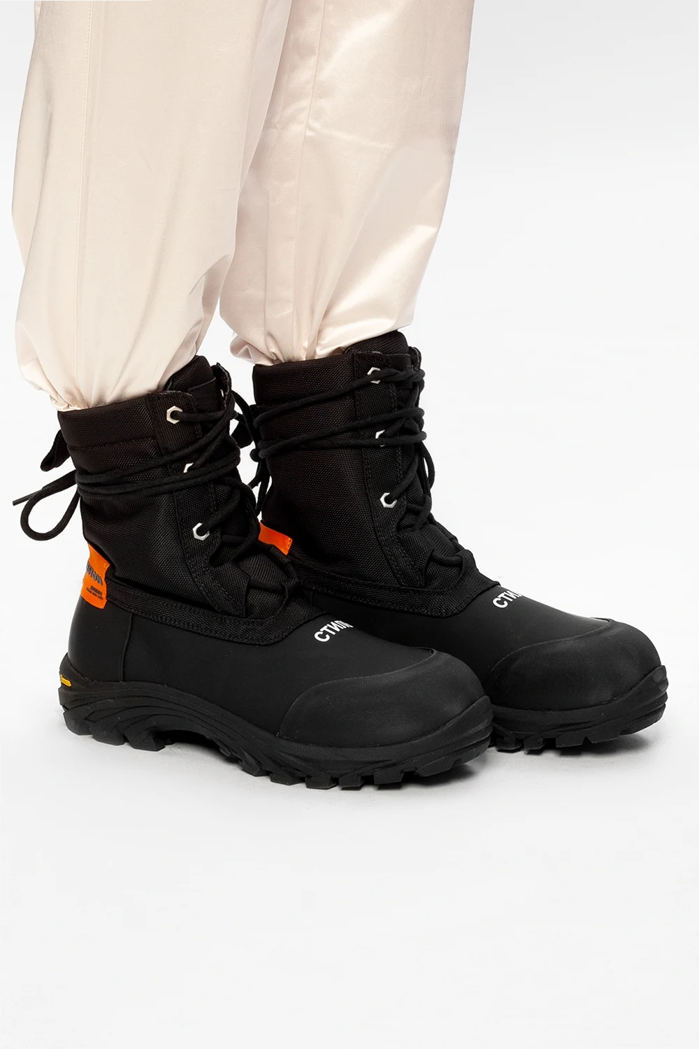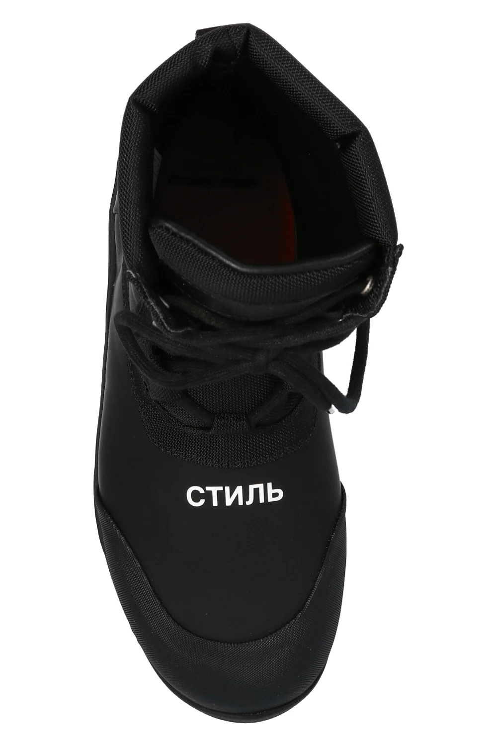 Czarne, sznurowane buty za kostkę Heron Preston. Z tyłu naszywka z logo w kolorze pomarańczowym. Czarna, gumowa podeszwa z technologią Vibram, stosowaną w butach górskich.