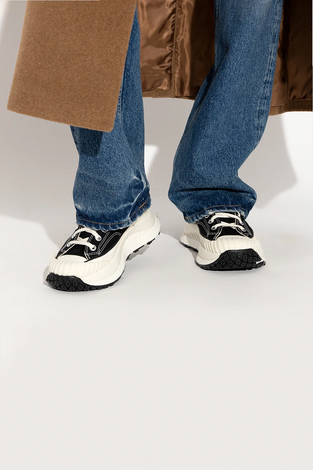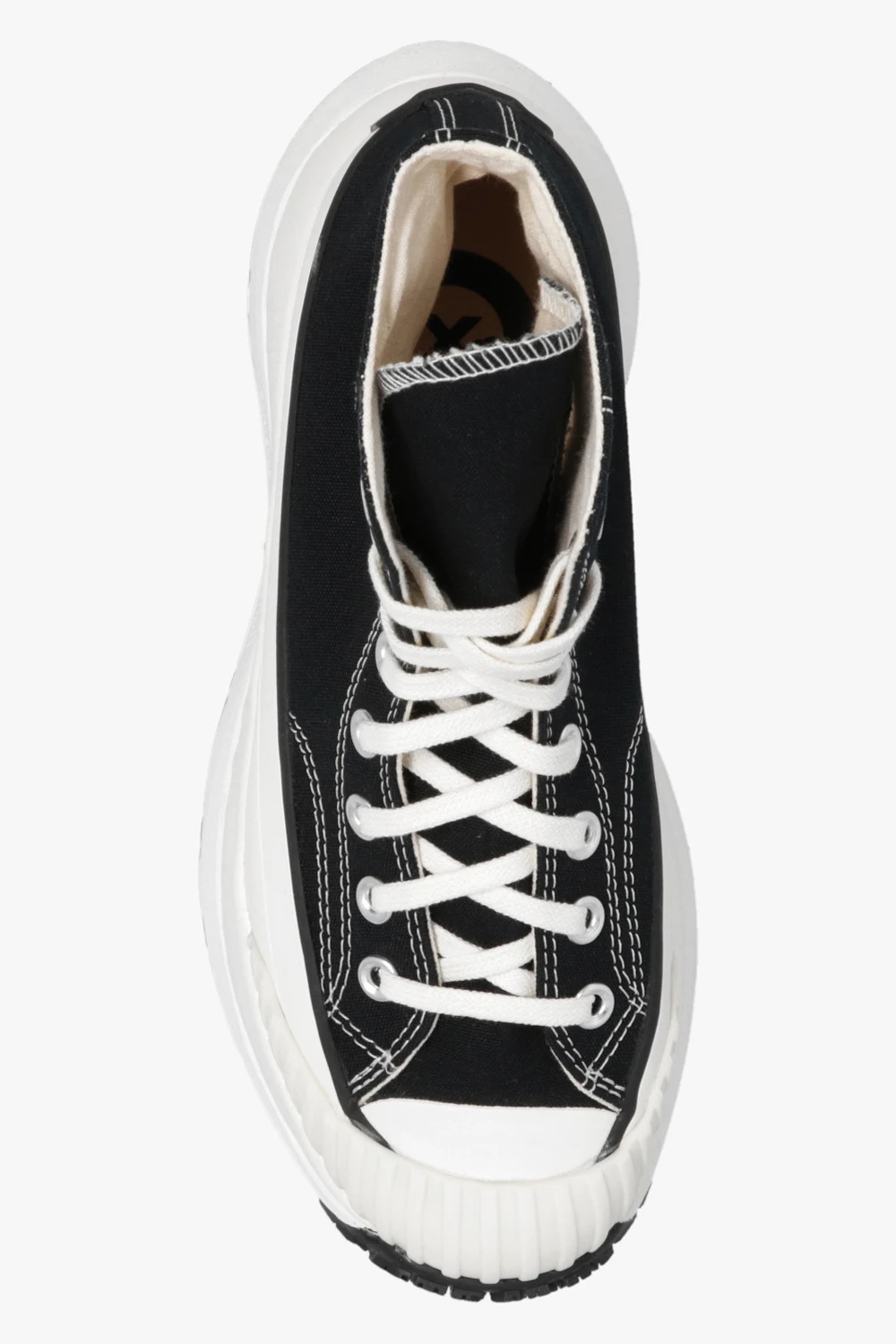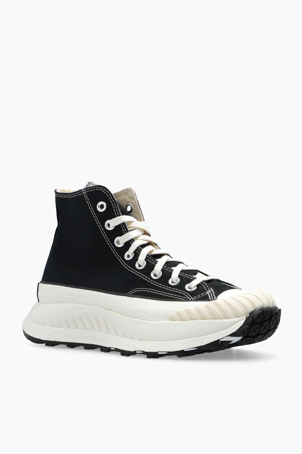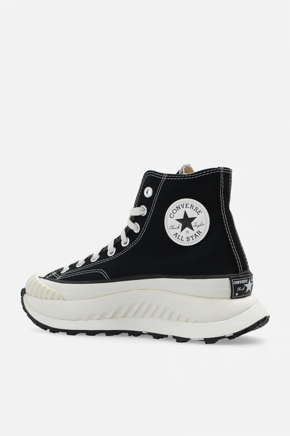 Czarno-kremowe, sznurowane buty sportowe za kostkę, model ‘Chuck 70 AT-CX’ Converse. Wykonane z płótna przynajmniej w 50% pochodzącego z recyklingu. Z boku oraz z tyłu ozdobione logo w kolorze biało-czarnym. Zabezpieczenie palców TPU BOSEY zapewniające wytrzymałość buta.