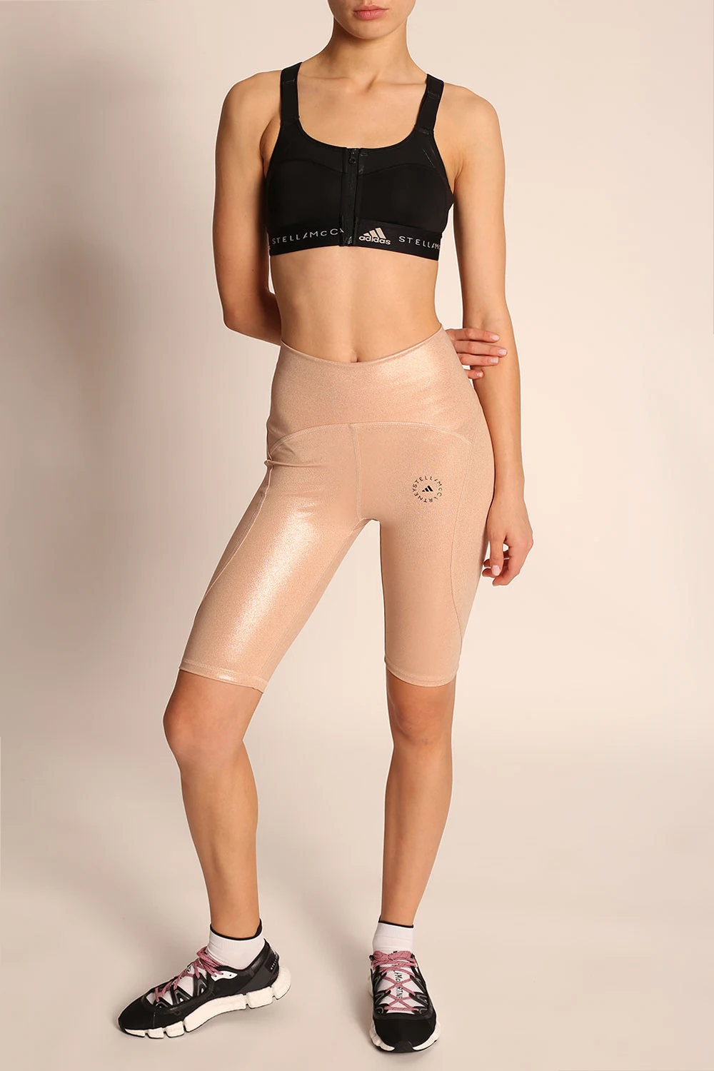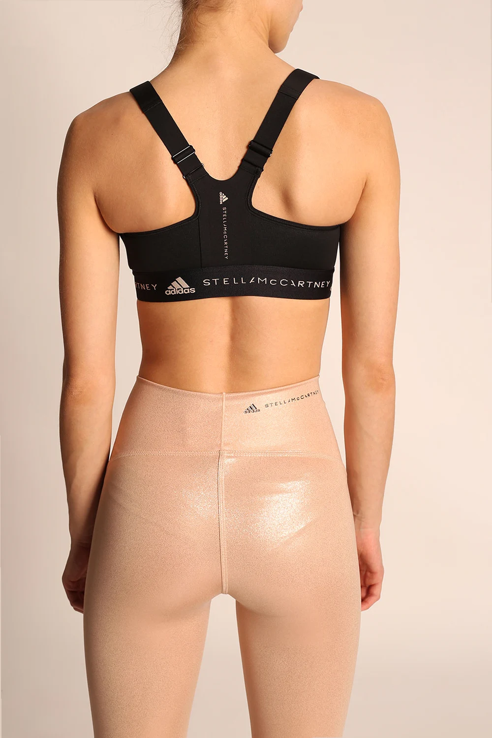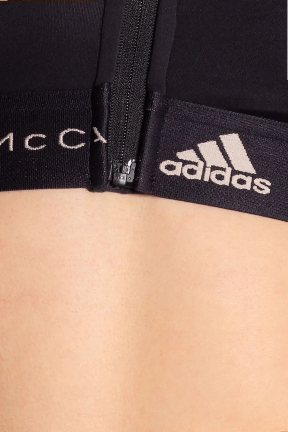 Czarny biustonosz sportowy ADIDAS by Stella McCartney, linia ‘Primegreen’. Wykonany z materiału pochłaniającego wilgoć AEROREADY. Z przodu zapinany na zamek. U dołu guma z wyszytym logo w kolorze kremowym. Ramiączka z możliwością regulacji długości. Primegreen to linia charakteryzująca się użyciem wysokiej jakości materiałów pochodzących z recyklingu.