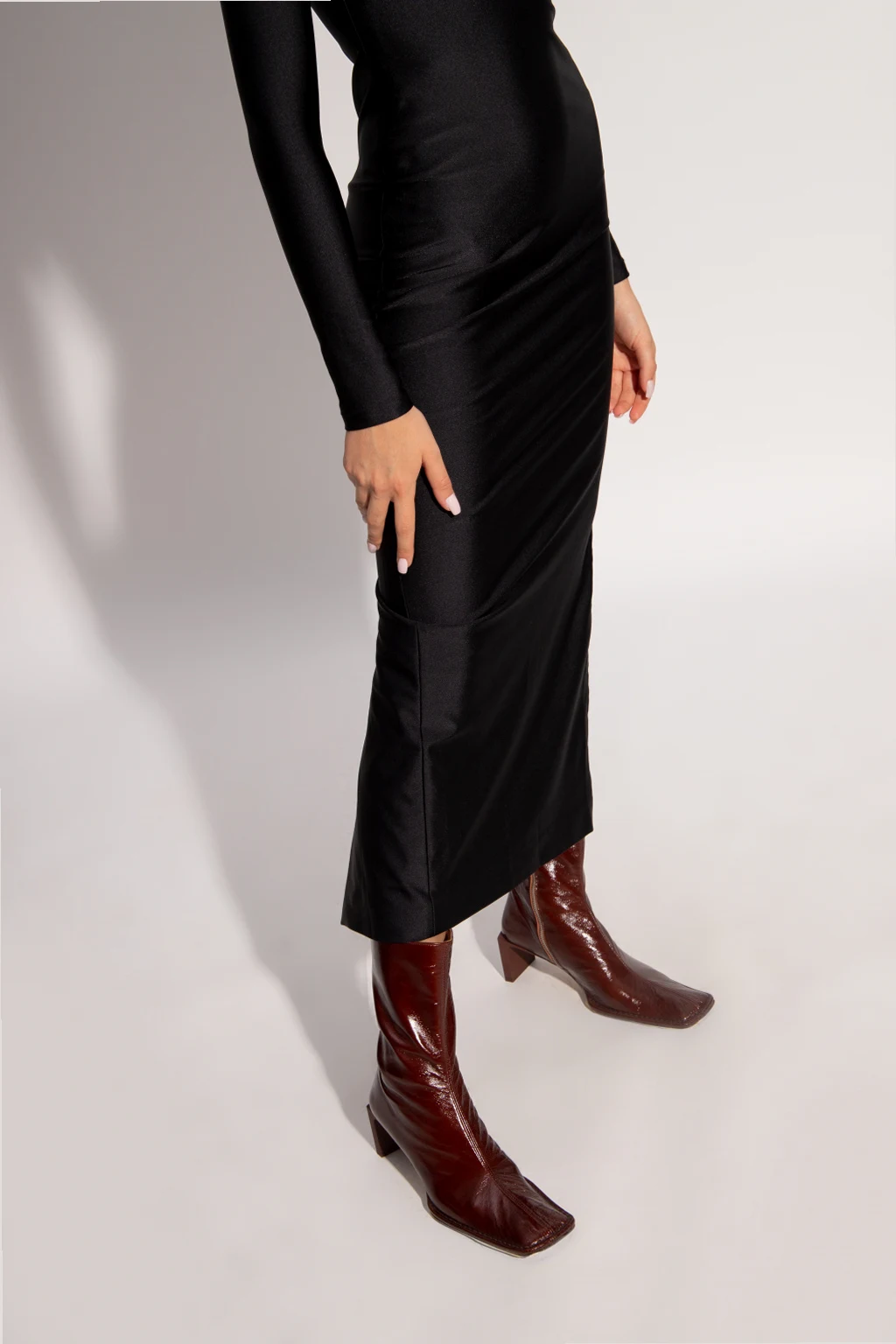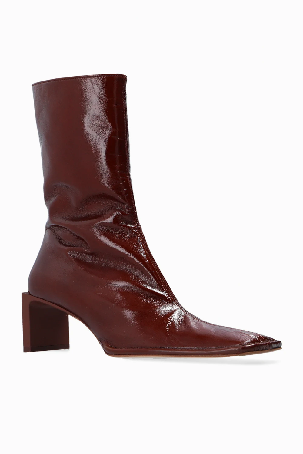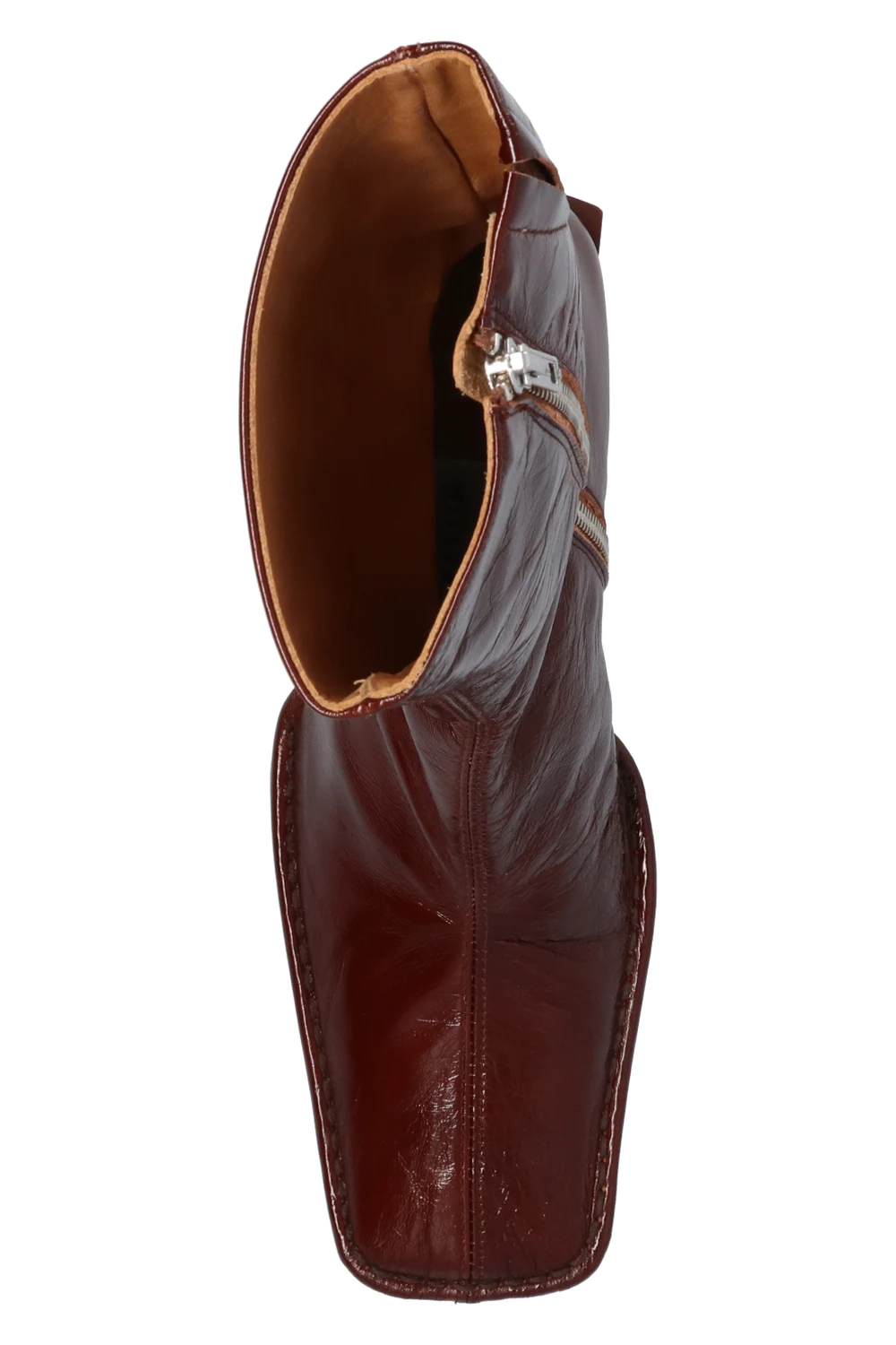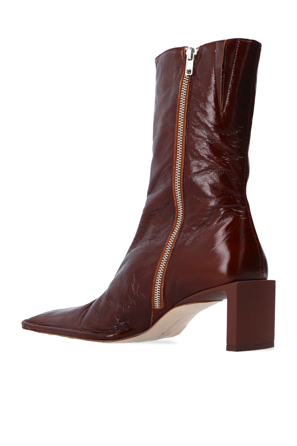 Brązowe botki na obcasie, model ‘Anitha’ Miista. Wykonane z cielęcej skóry. Z boku zapinane na zamek. Wydłużony, kwadratowy nosek. Beżowa, skórzana podeszwa.