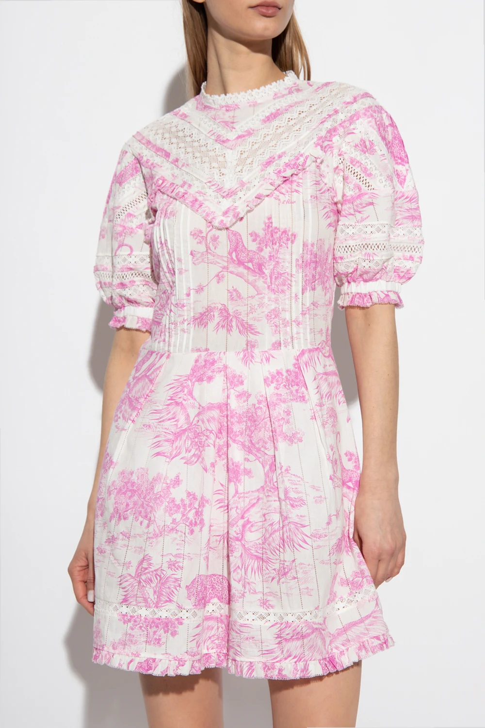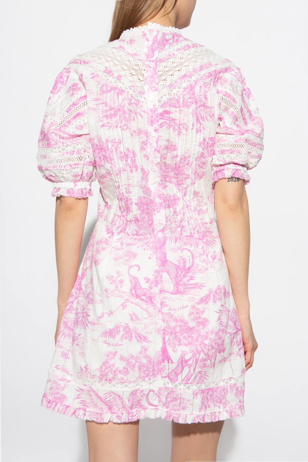 Biało-różowa, bawełniana sukienka, model 'Rozy' Zadig & Voltaire. Zapinana z tyłu na guziki. Ozdobiona nadrukiem z motywem roślinnym i zwierzęcym. Koronkowe wykończenie. Okrągły dekolt. Krótkie, bufiaste rękawy.